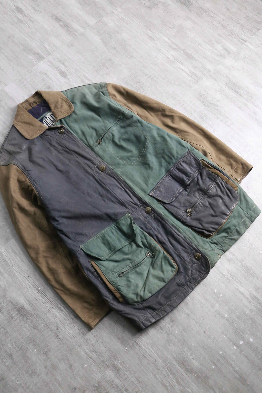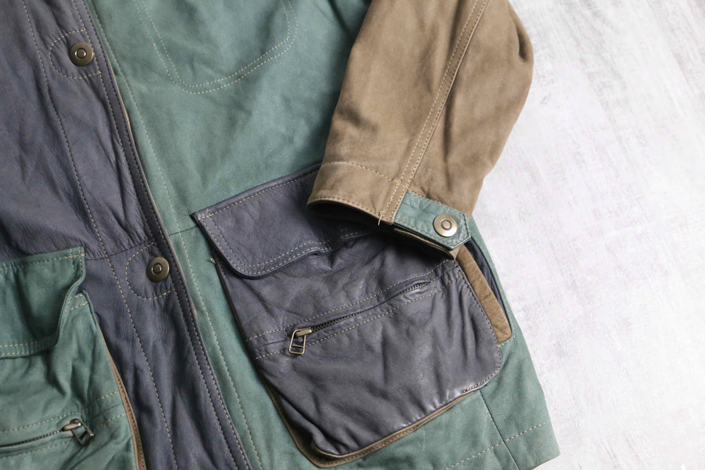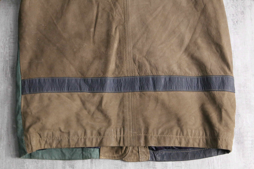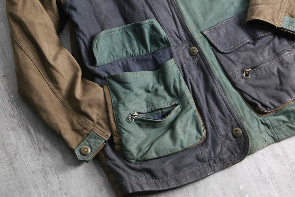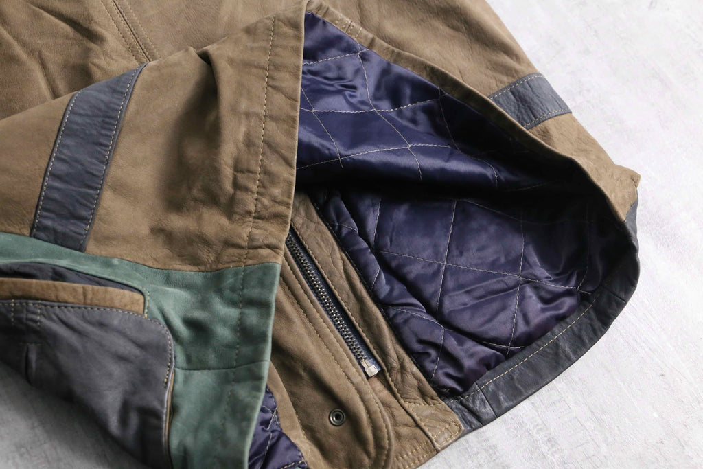 ブラウン、グリーン、グレーと切り替えられたデザインがインパクトのあるレザージャケット。