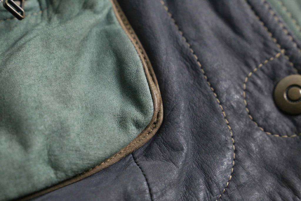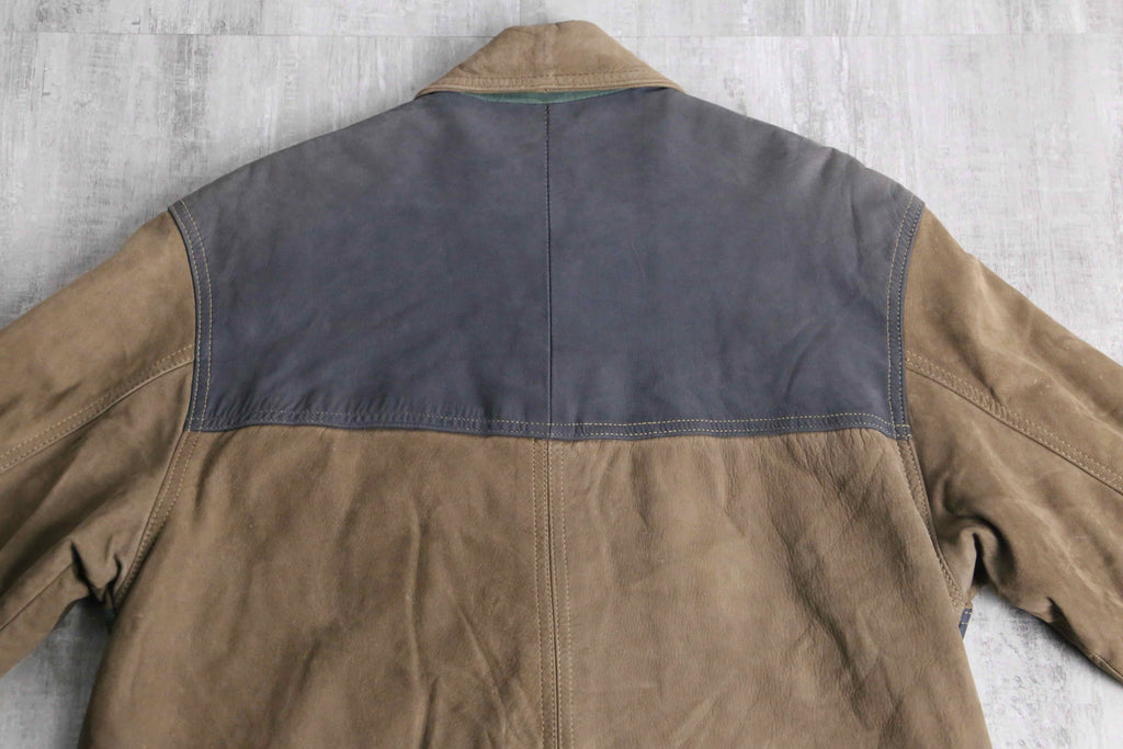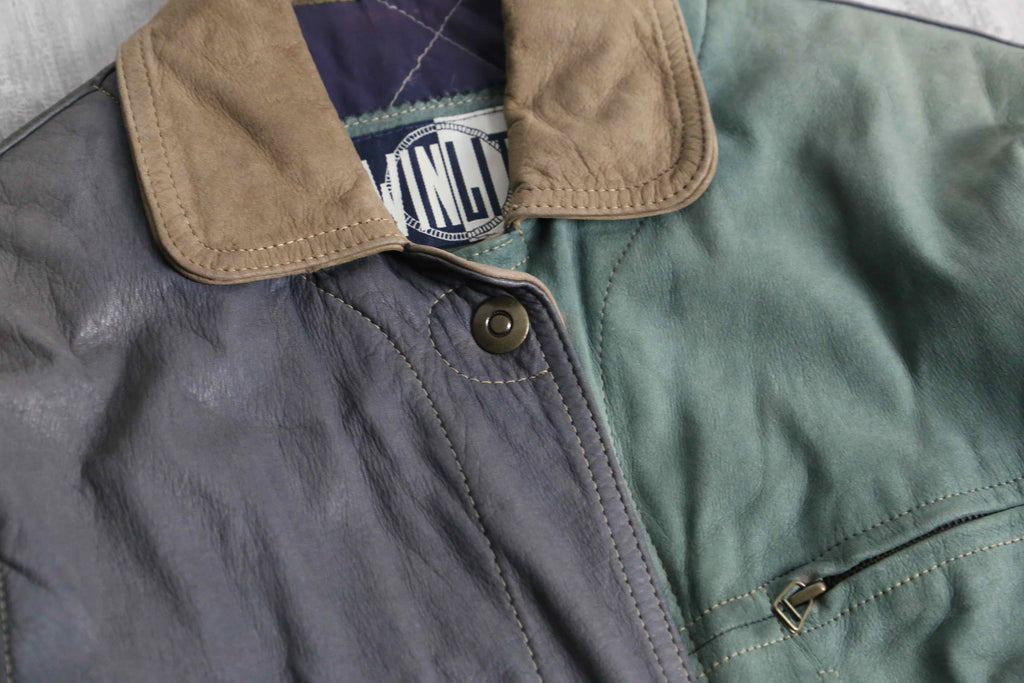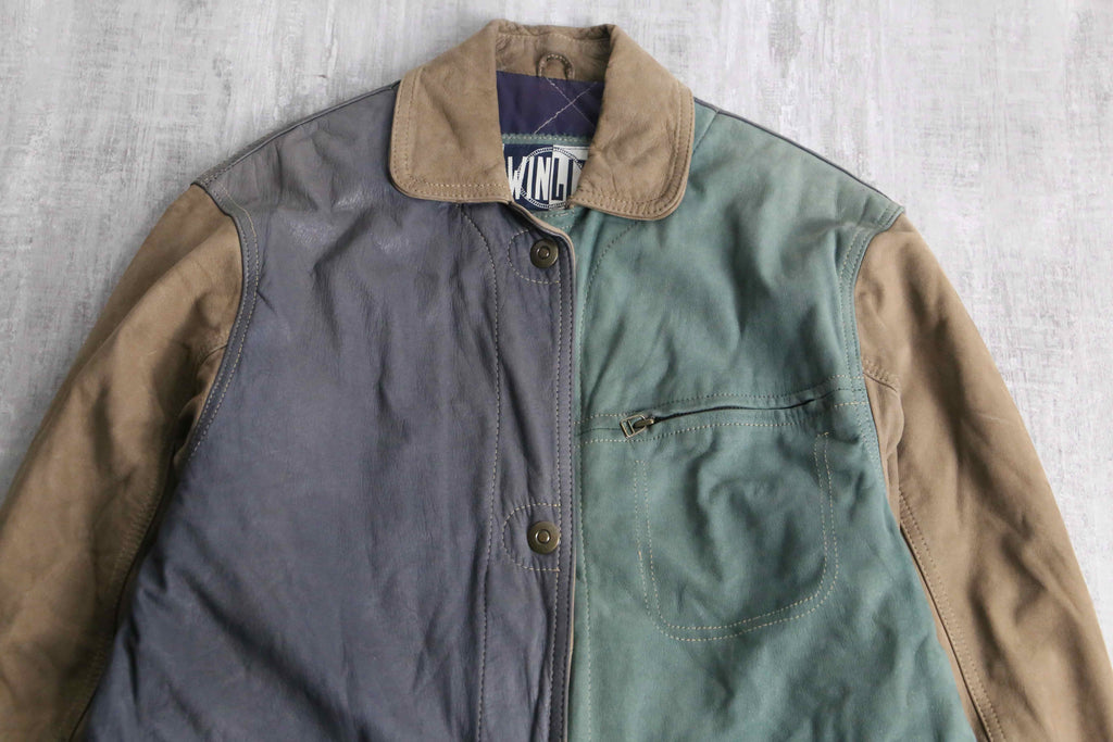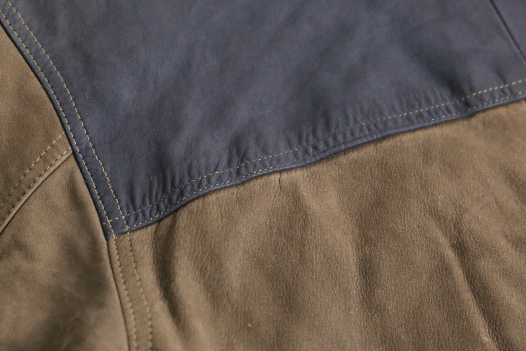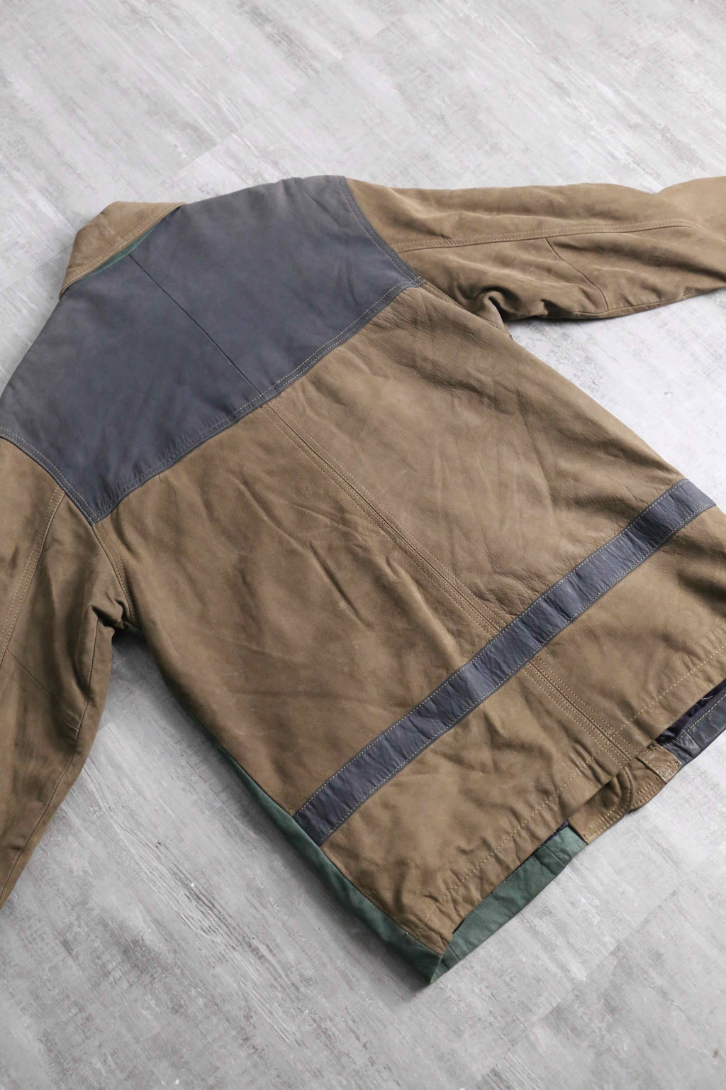 ブラウン、グリーン、グレーと切り替えられたデザインがインパクトのあるレザージャケット。