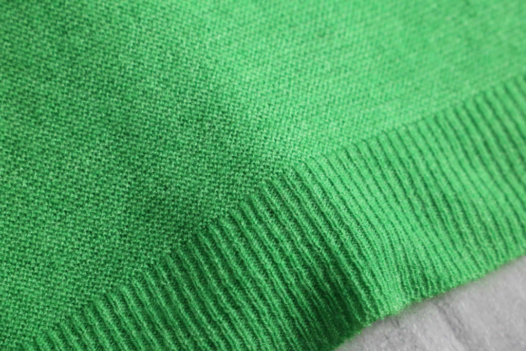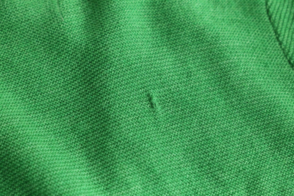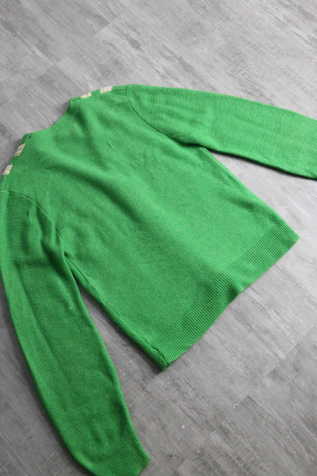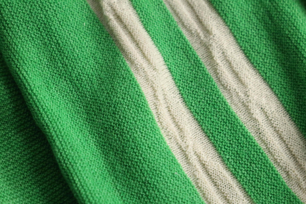 若草色の発色の良い配色に生成りのラインデザインが可愛らしいヴィンテージカーディガン。