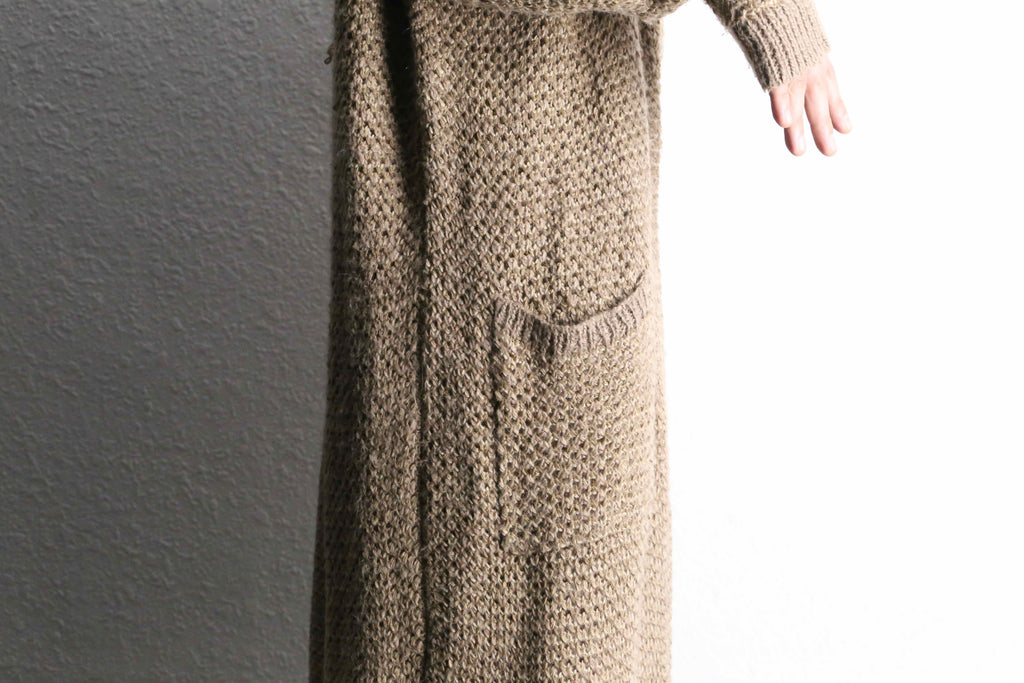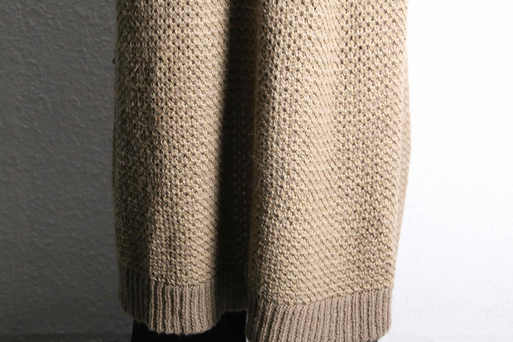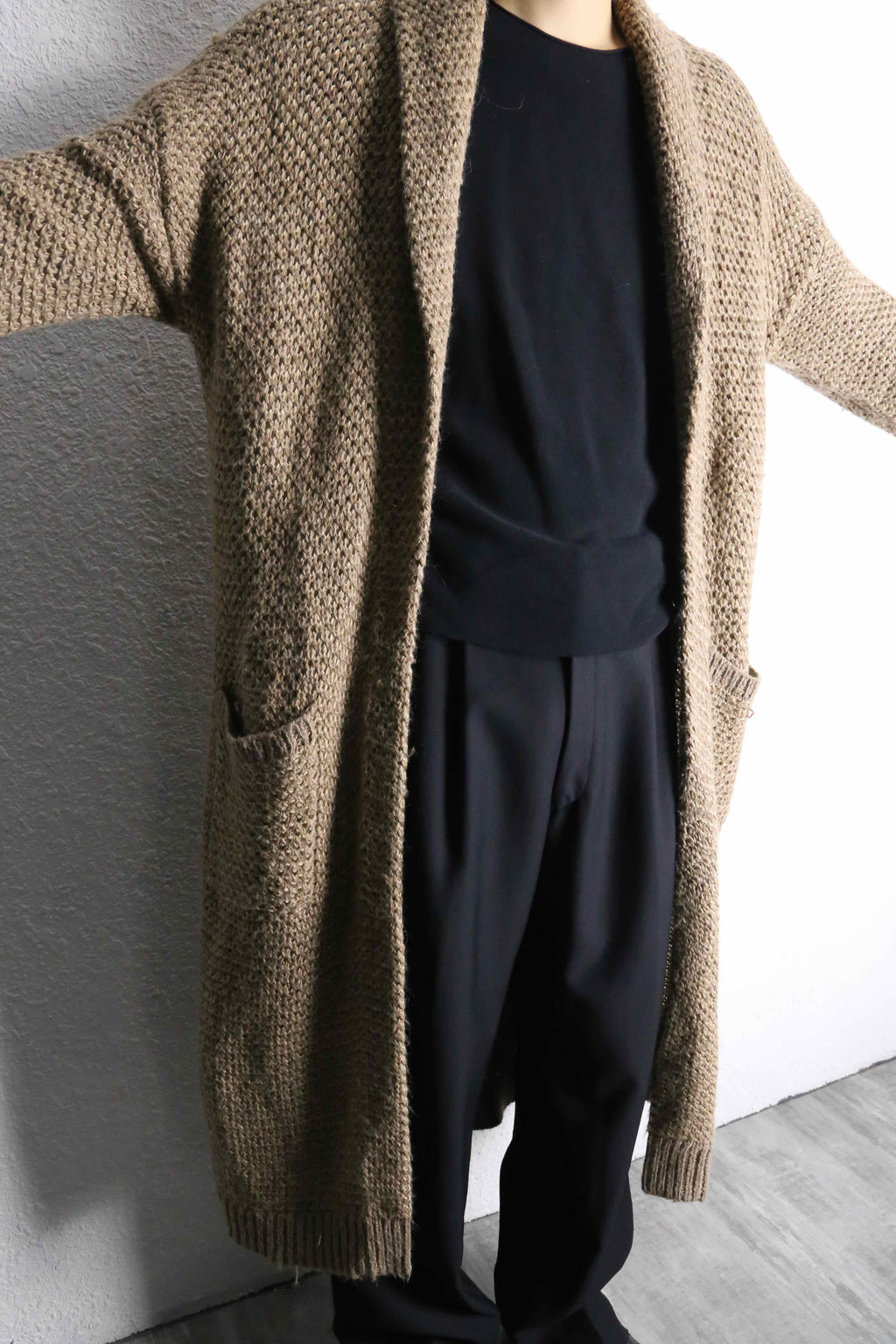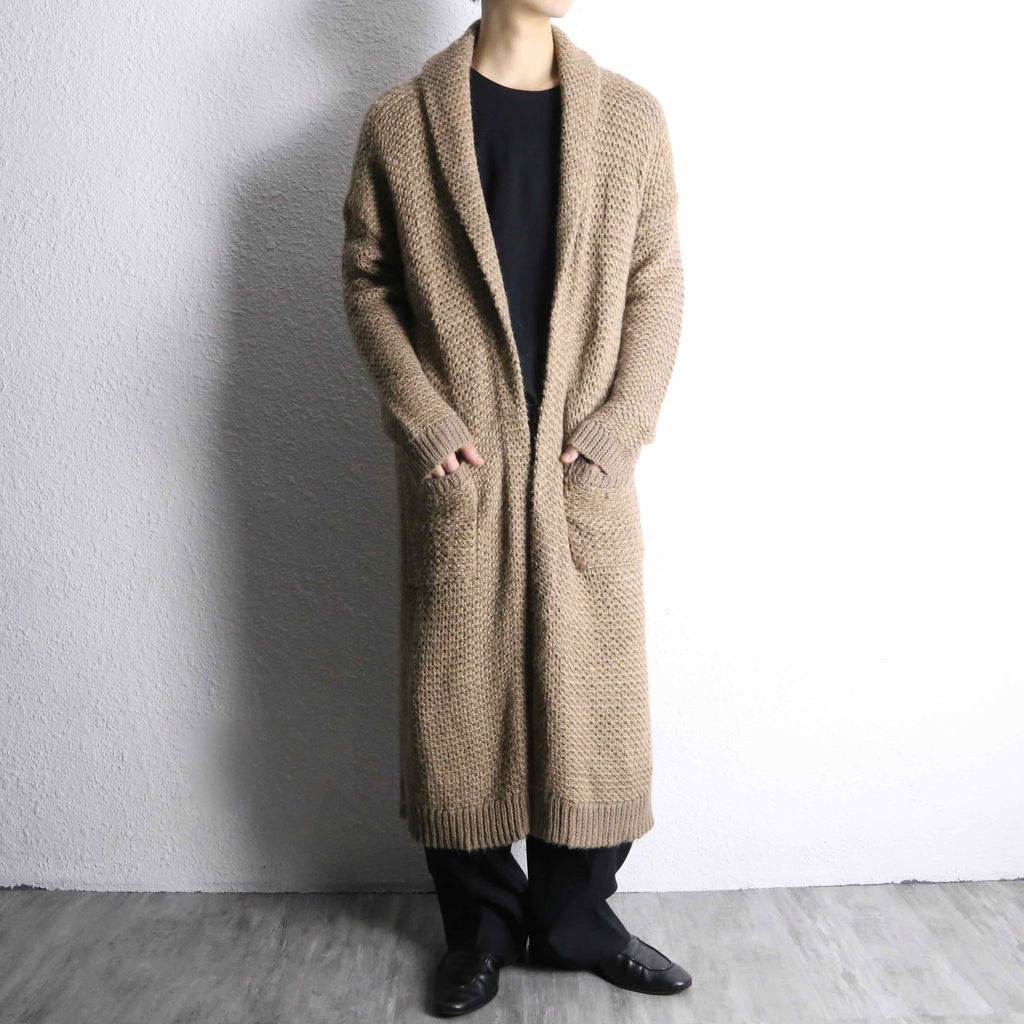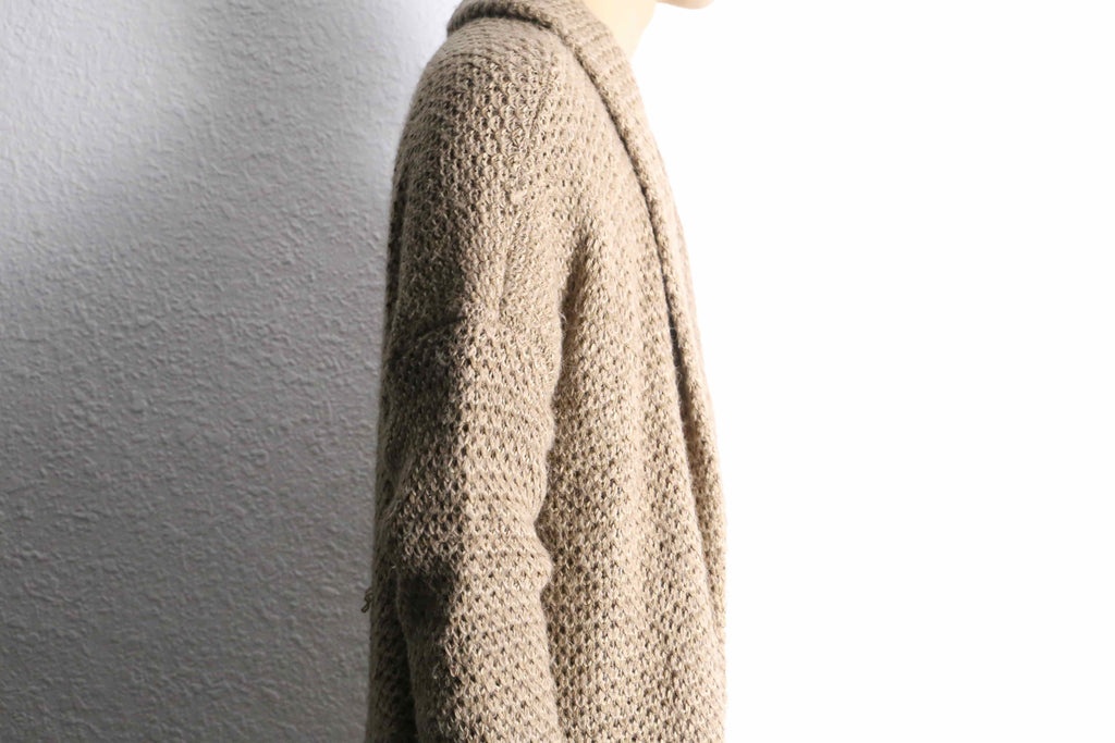 アクリル、ウールを混紡したややローゲージ編みのニット。ロングシルエット故の重さを想像しますがその逆。見た目に反しかなりライトな着用感です。