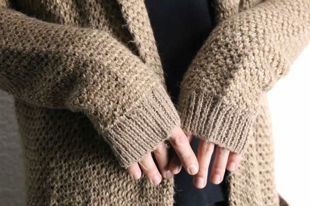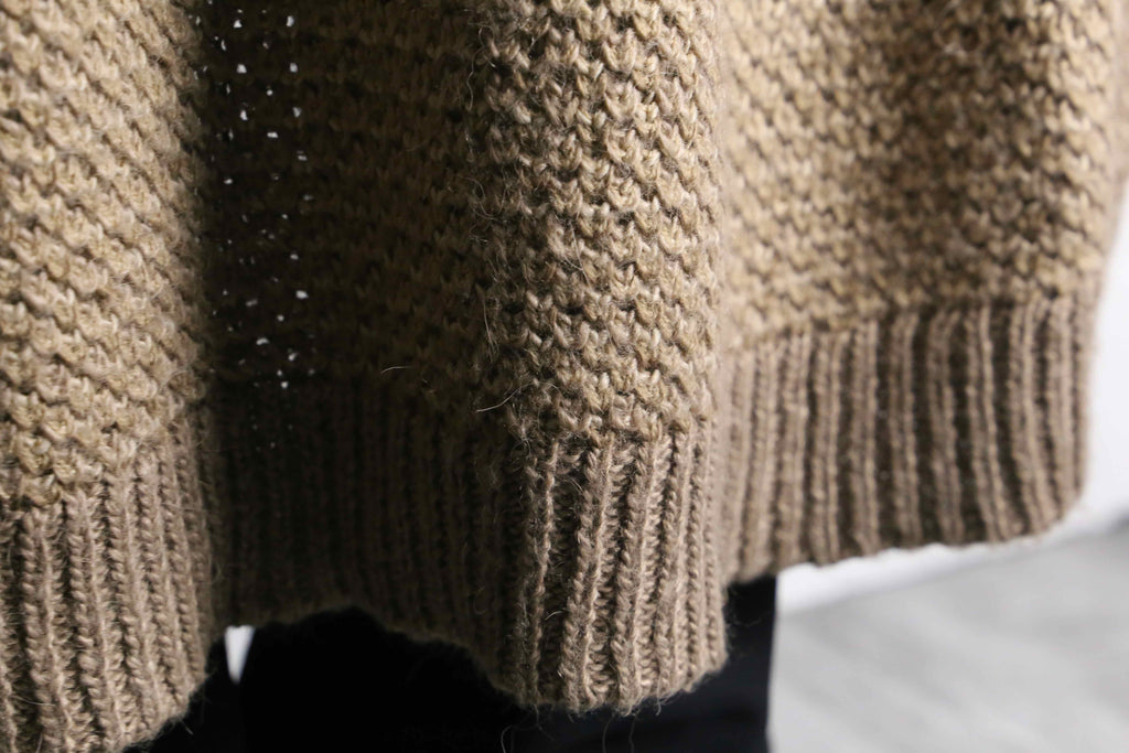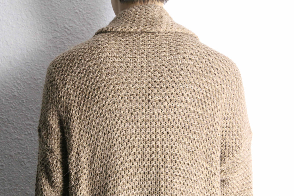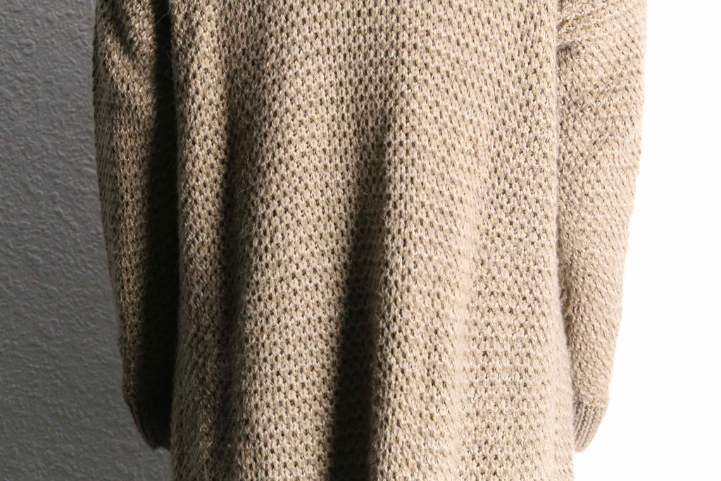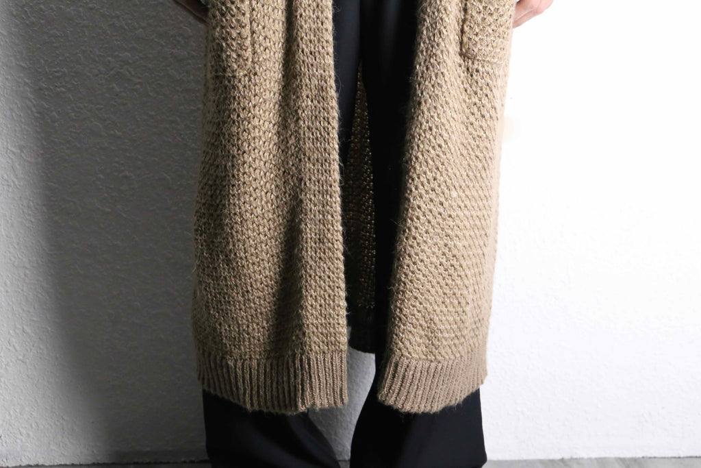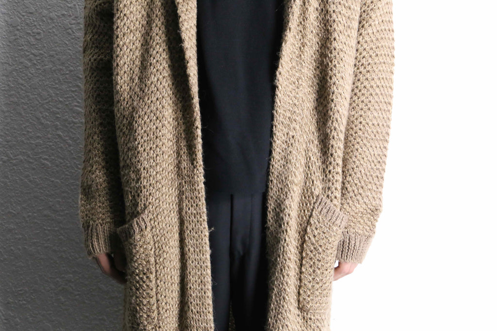 アクリル、ウールを混紡したややローゲージ編みのニット。ロングシルエット故の重さを想像しますがその逆。見た目に反しかなりライトな着用感です。