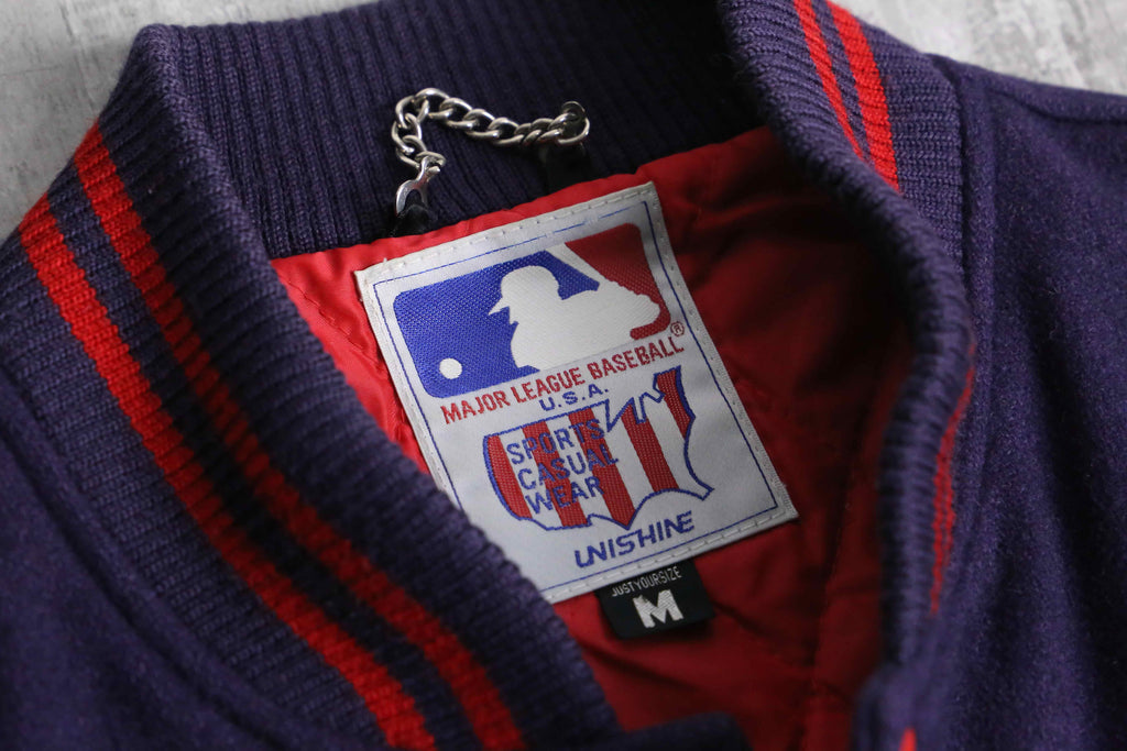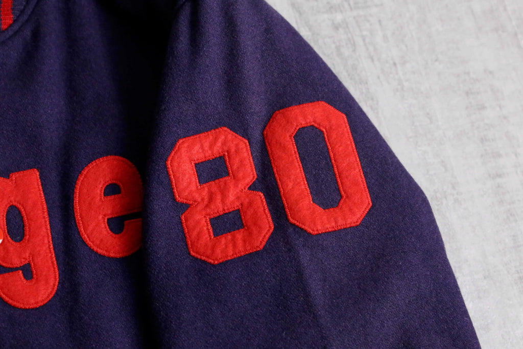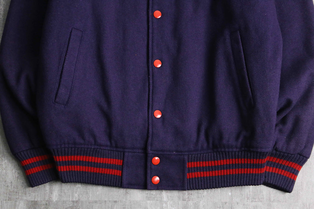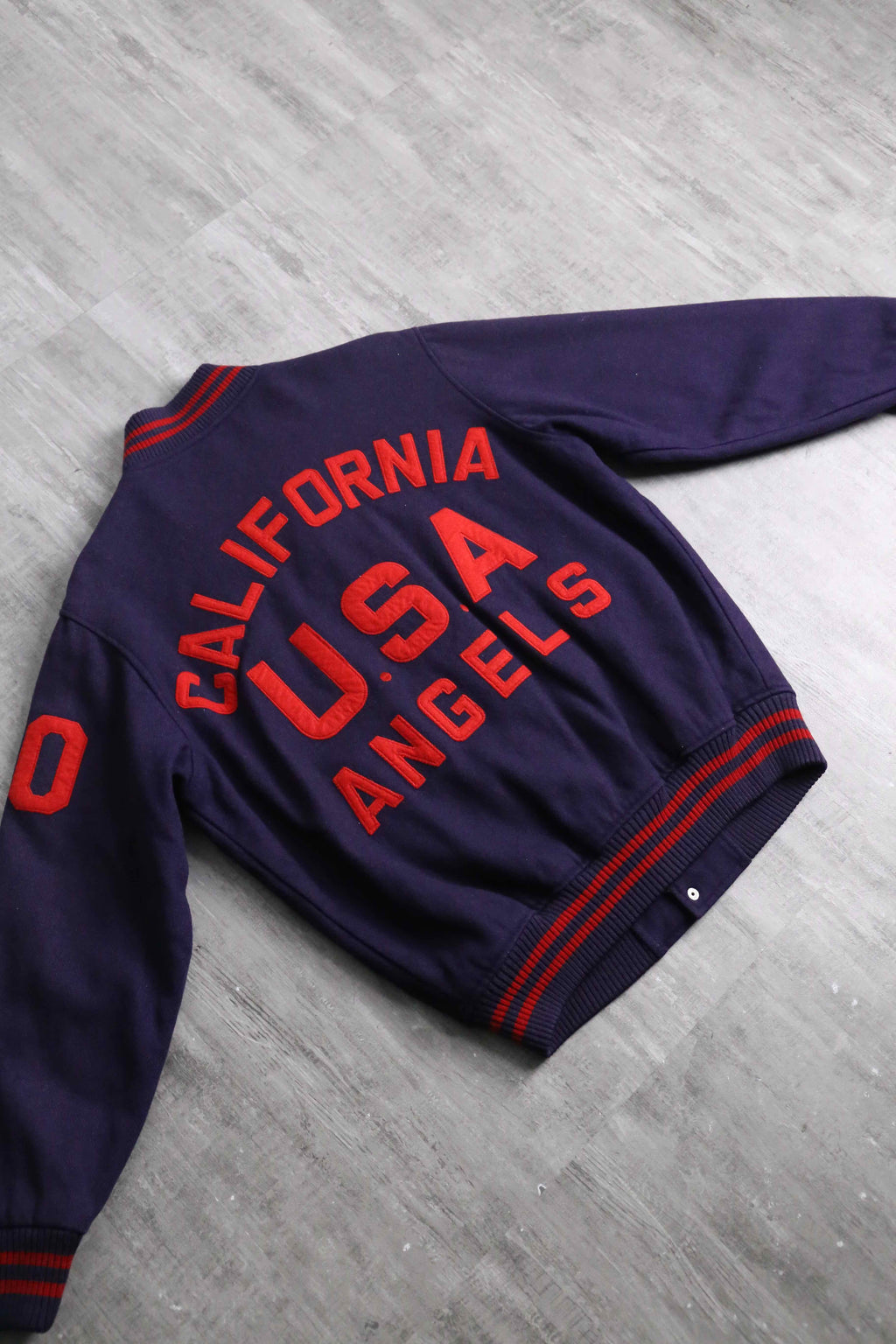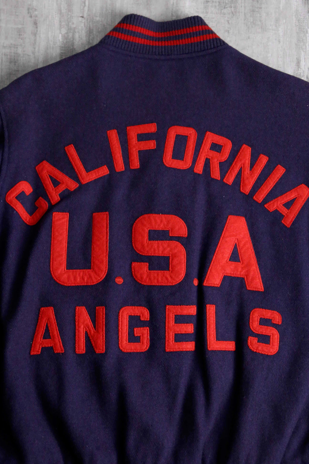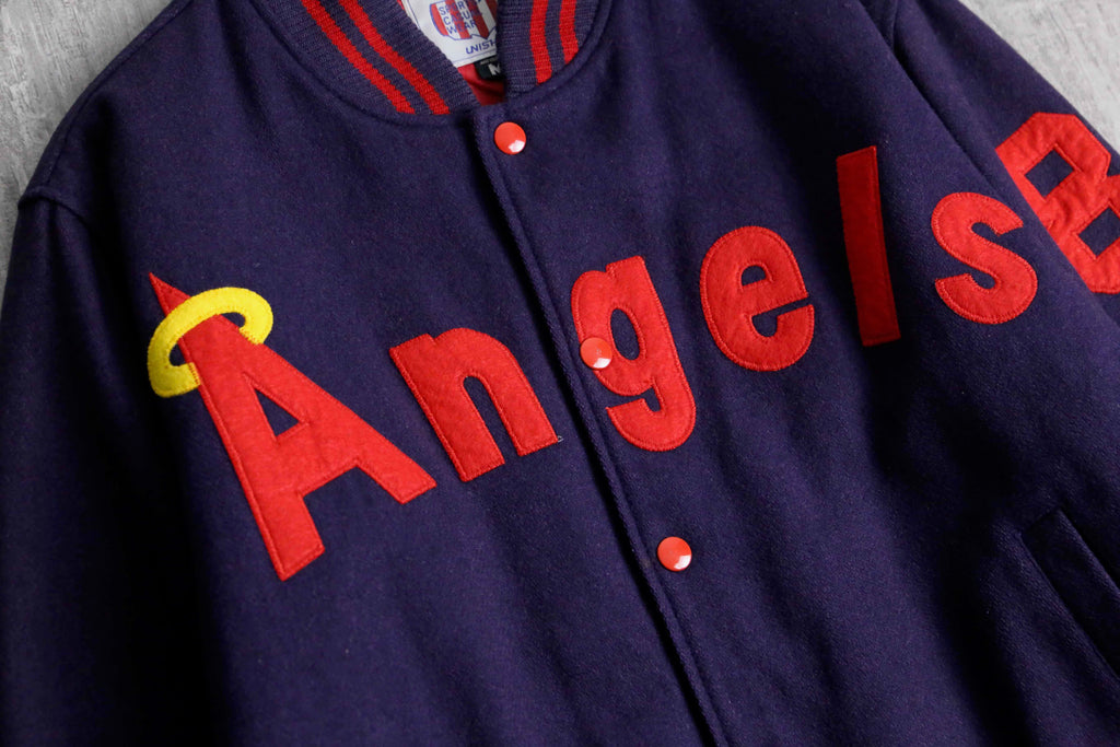 ロサンゼルスの由来である「天使たち」を冠したAngelsロゴが全面に押し出されたデザイン。スポジャケ型には珍しいタイトなシルエットに、ボルドー、レッド、パープルの雰囲気のある配色センス。元来のスタジャンとは一味違うルックス。無骨なレザー切り替え、がっちりとしたシルエット、これらが無いだけでここまで垢抜けるのかと筆者個人的にオススメの1着です。