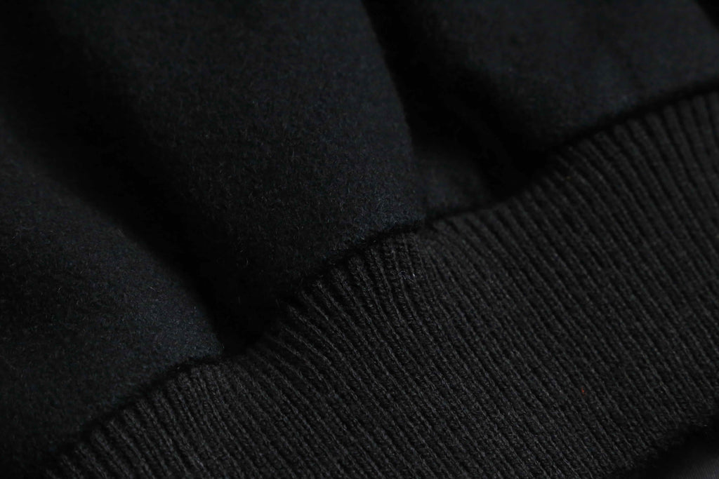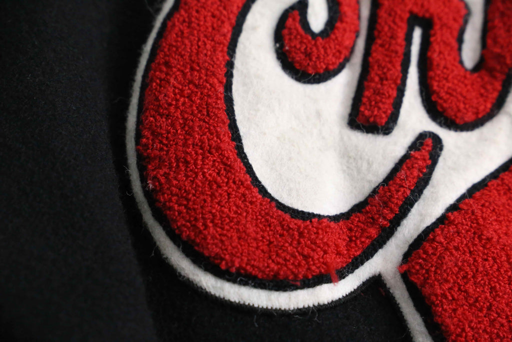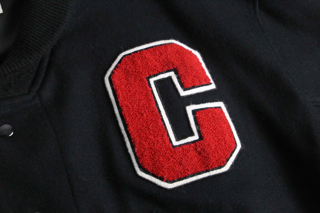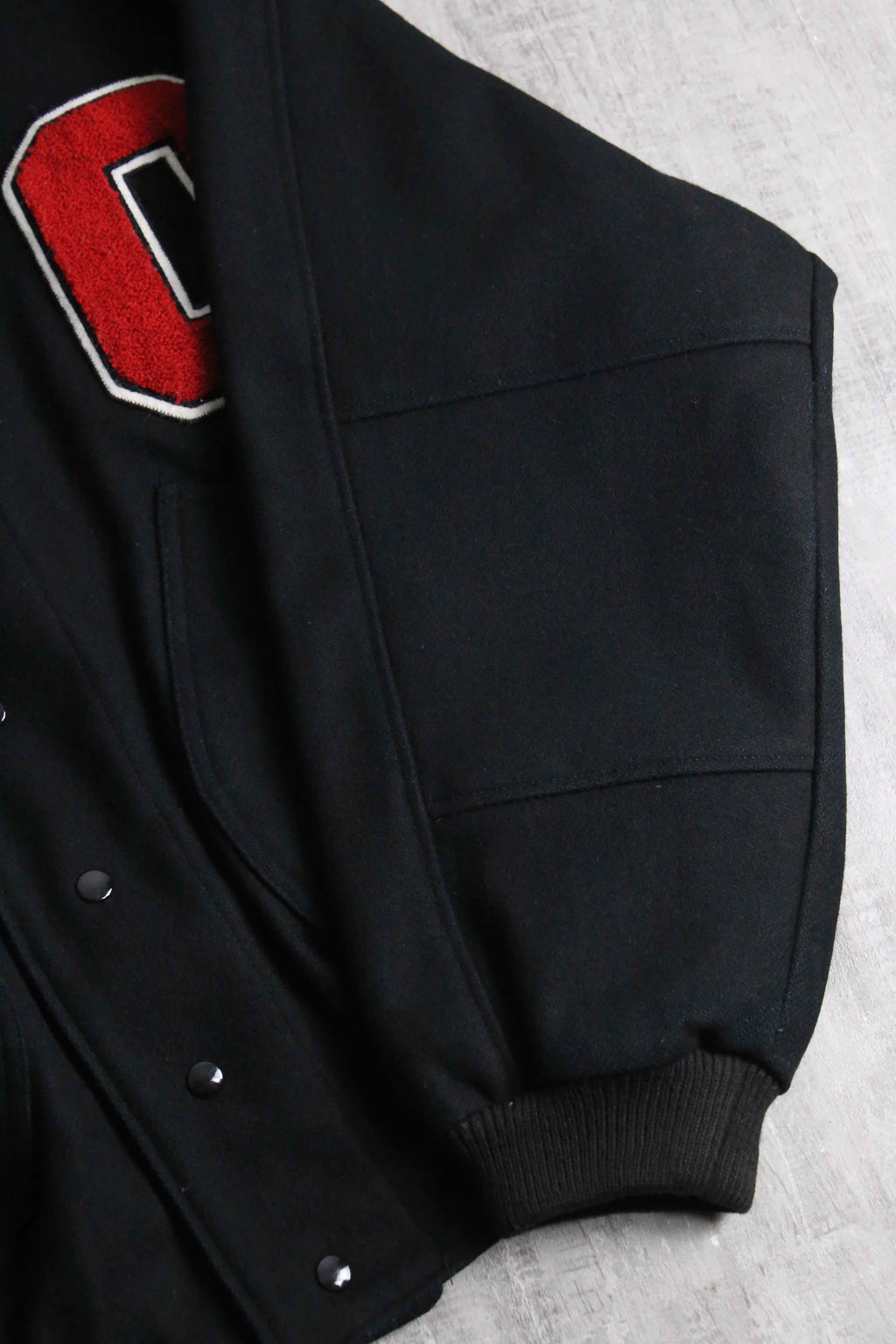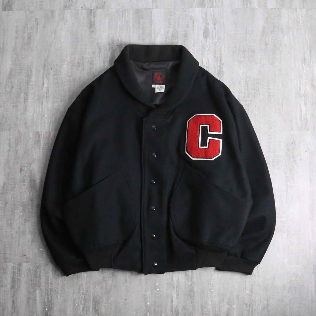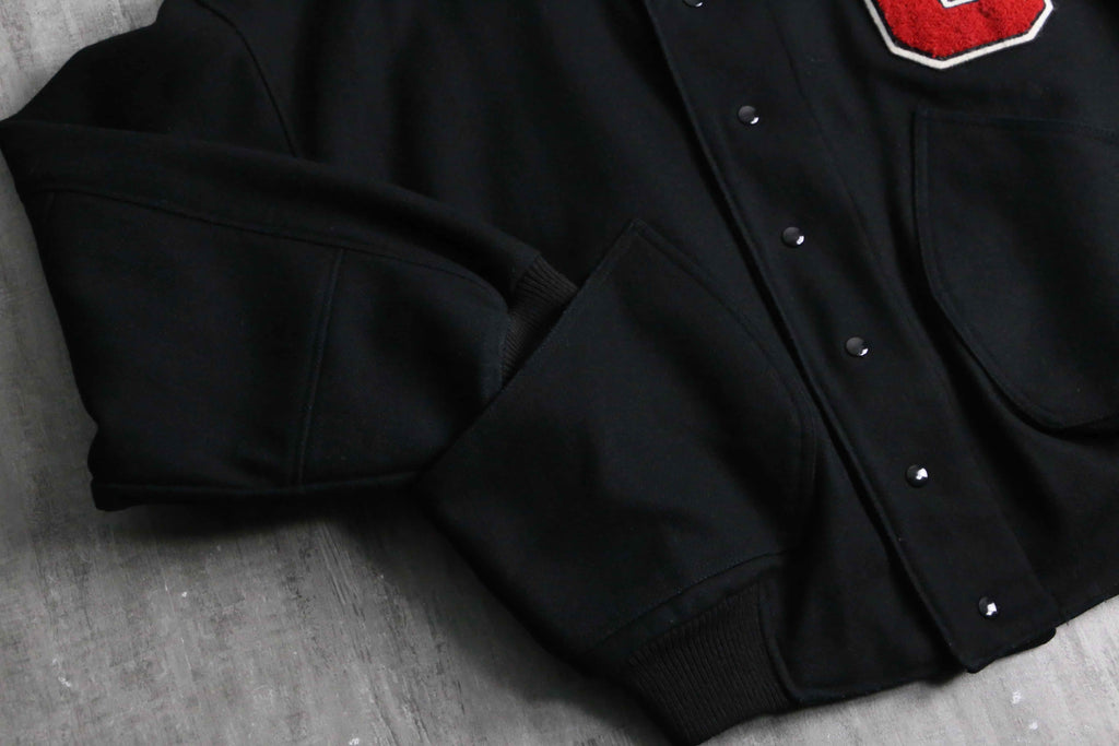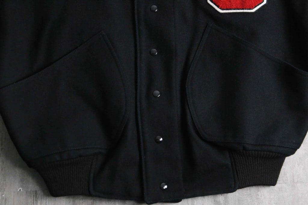 極めてシンプルなスタジャン。ですがシルエットは完璧。比較的短めな着丈。リブの効いた丸みのあるフォルム。身幅は太めと、ブルゾン型において素晴らしいシルエットです。そして真っ黒なボディに映える赤のワッペンや刺繍。古着らしさも兼ね備えた1着です。