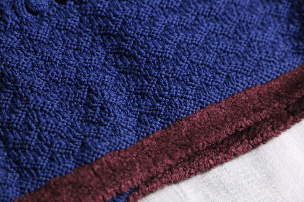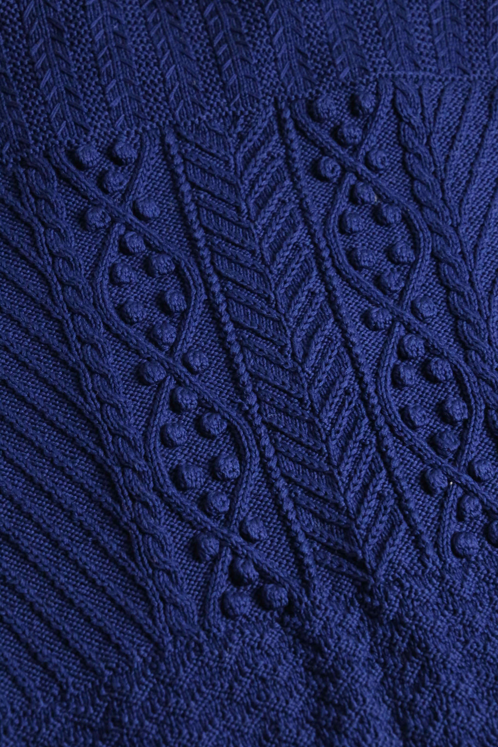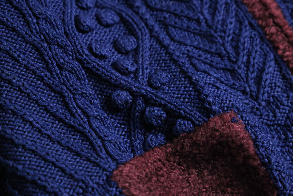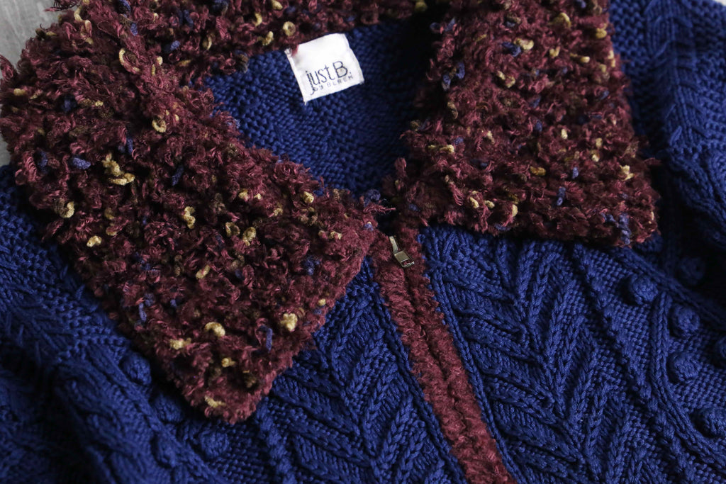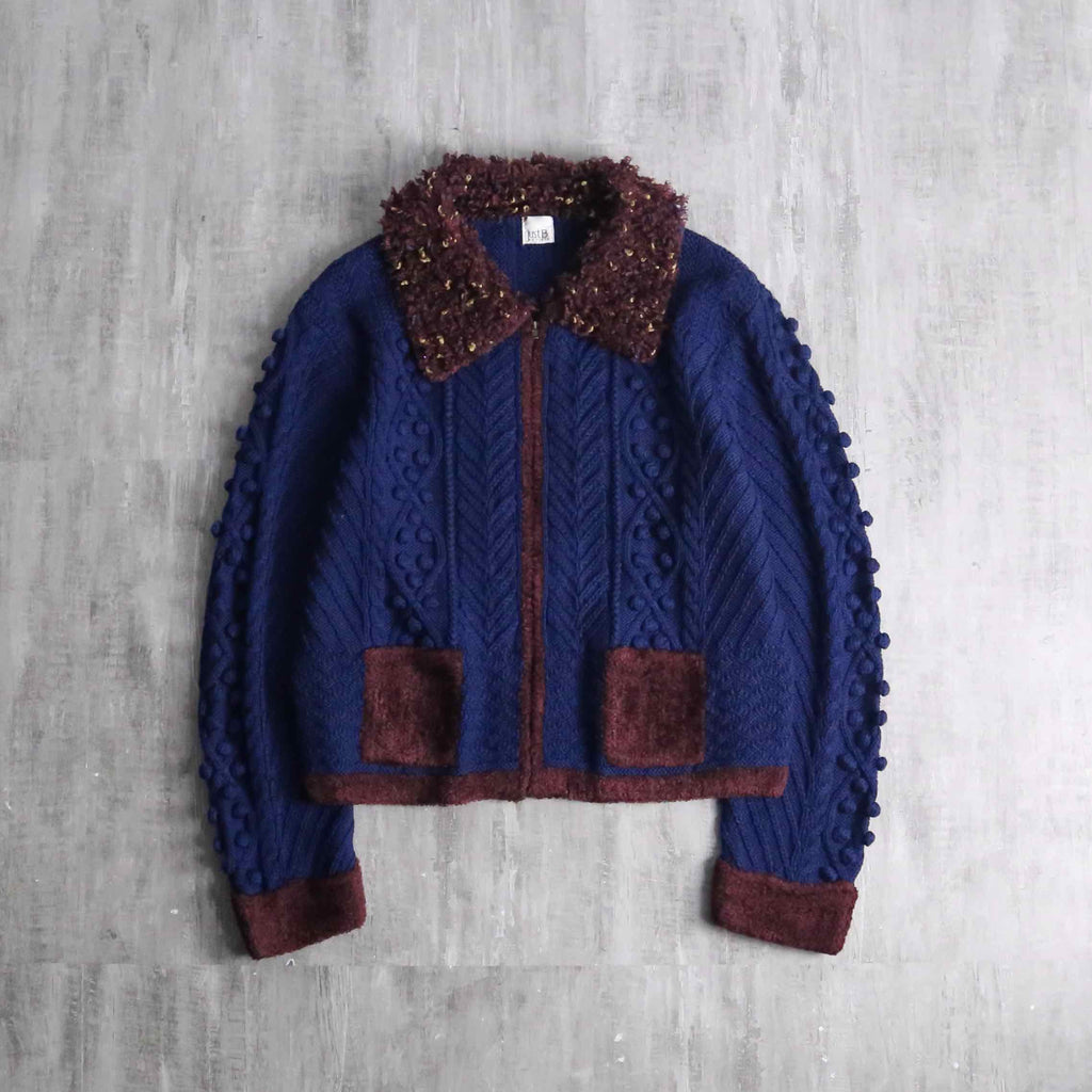 カラフルネップの様な起毛した襟元。ボディの3Dニットを彷彿させるケーブル編み。裾やポケット、袖口の茶ラインで統一されたビジュアルは可憐に映ります。