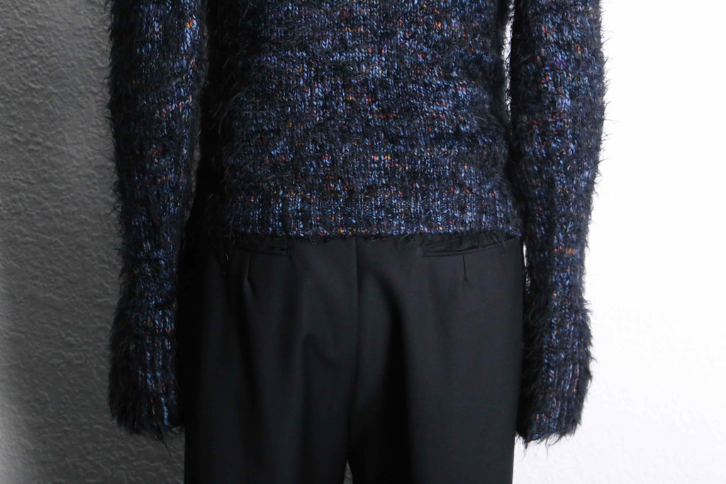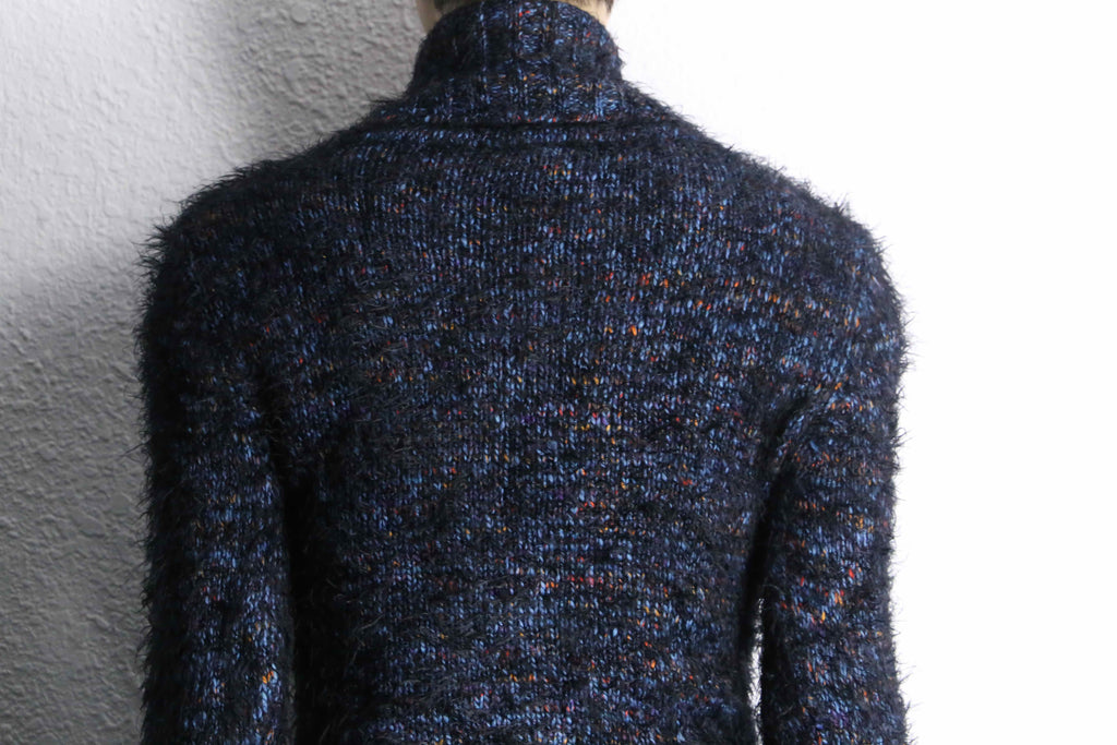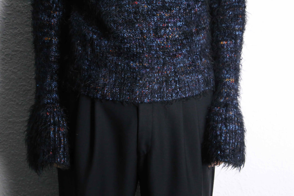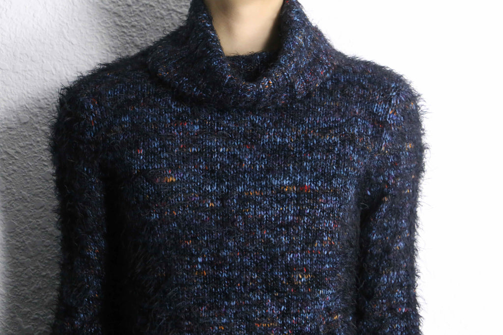 単体でもインナーとしても良いアクセントであるハイネックデザイン。ブルーを基調とし、レッドやオレンジを混ぜる綺麗な配色。起毛されたシャギーはエッジが効いた良いインパクトになるかと思います。袖口がフレアになっているのも良いですね。