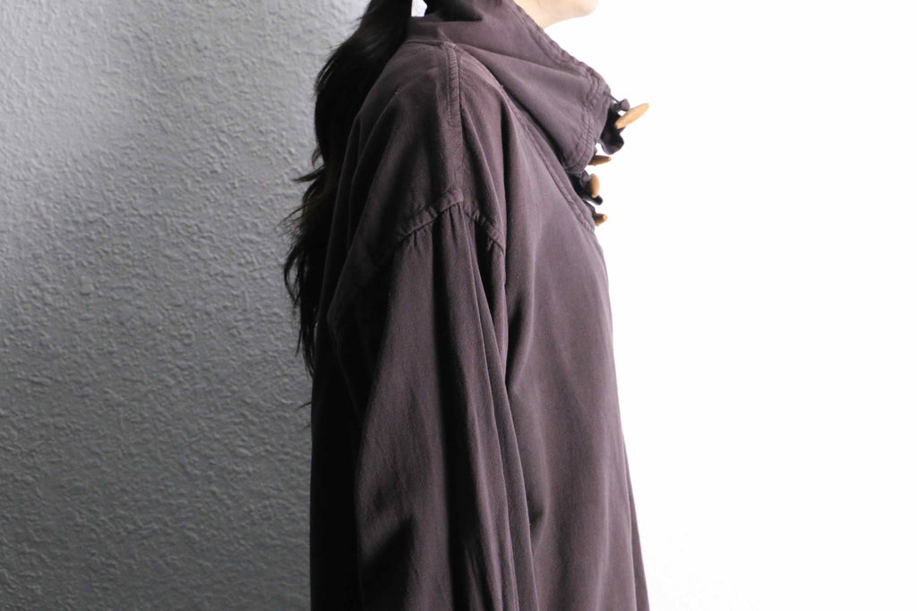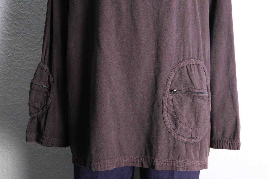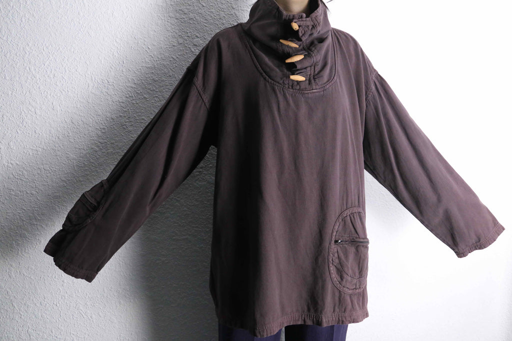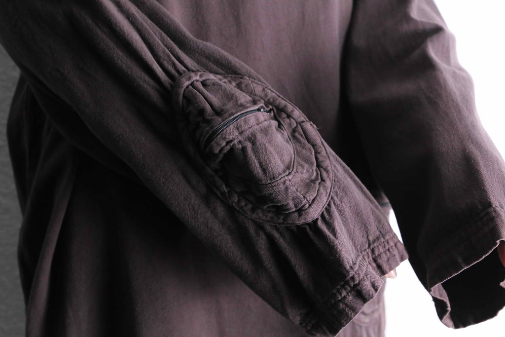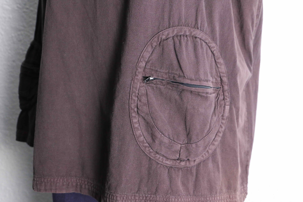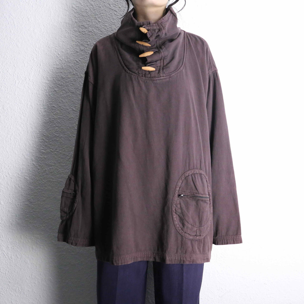 トグルボタン式で開閉が可能な立ち襟と、袖、裾の不思議な位置に付いたジップポケットが見所の変形アイテム。