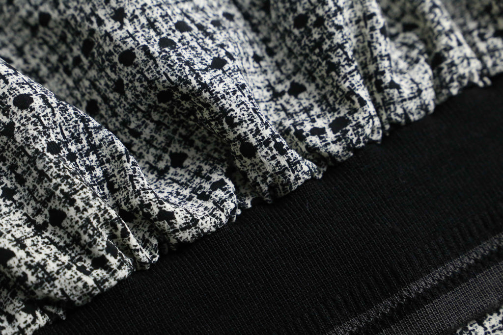 白と黒を基調にした配色はスタイリングに取り入れやすく、デニムやスラックスなど合わせるアイテムを選びません。リブ付きのネック・袖・裾が全体を程よく引き締め、