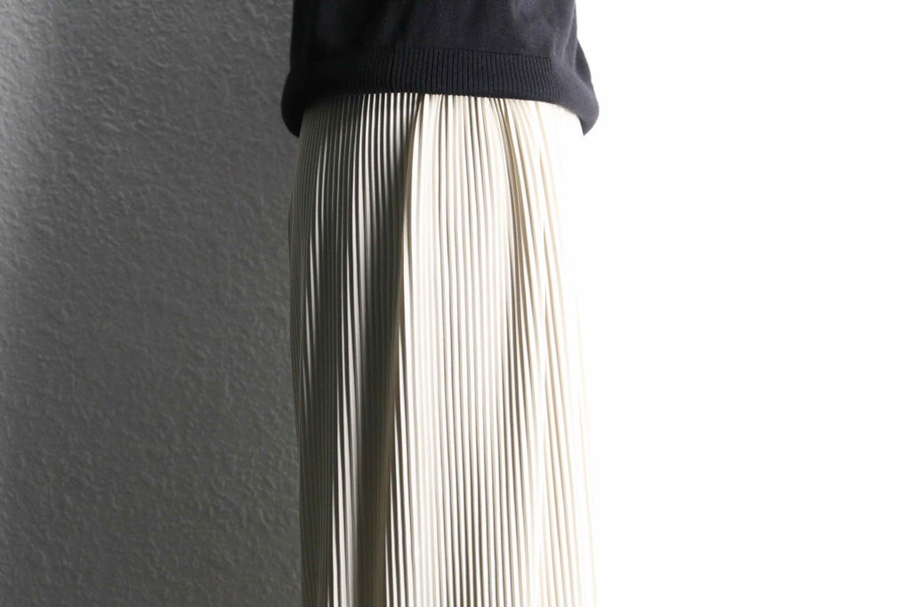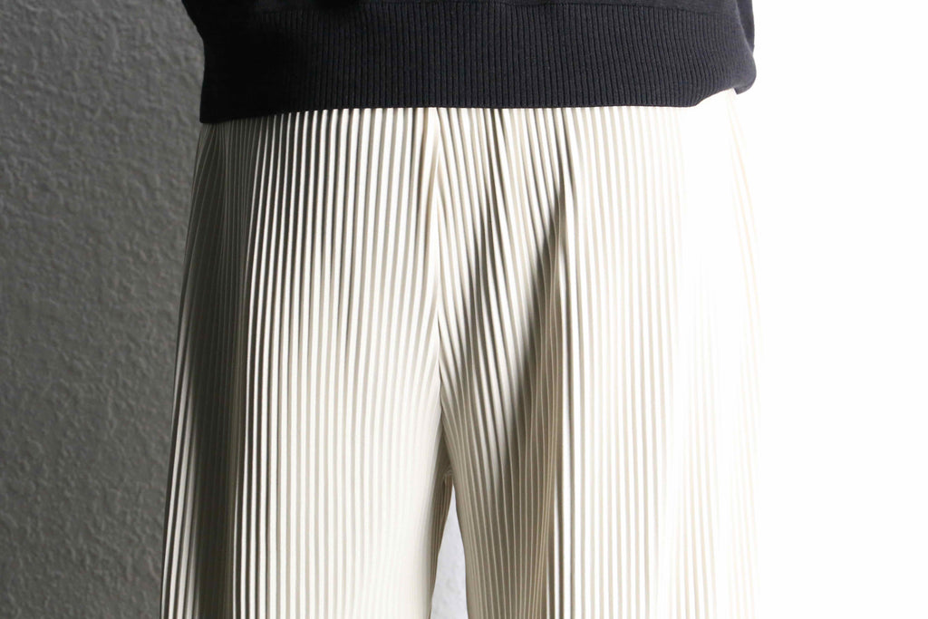 細かなプリーツが生み出す、流れるようなシルエットが印象的なワイドパンツをご紹介。動きに合わせて揺れる生地の表情が、シンプルなスタイリングにも自然な奥行きを与えてくれます。