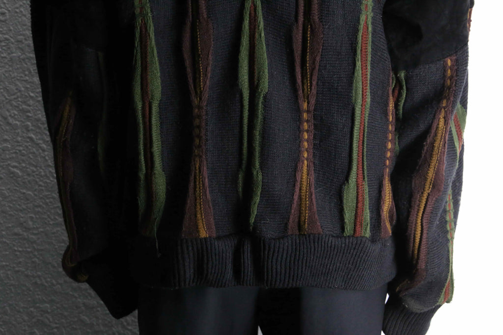 フロントは幾何学調にレザーを切り替え、控えめな配色を用いた3Dパターンの厚みあるデザイン。一見するとジャケット顔負けのビジュアルです。