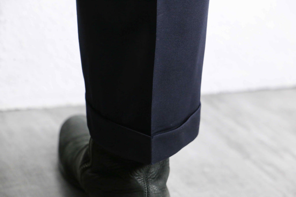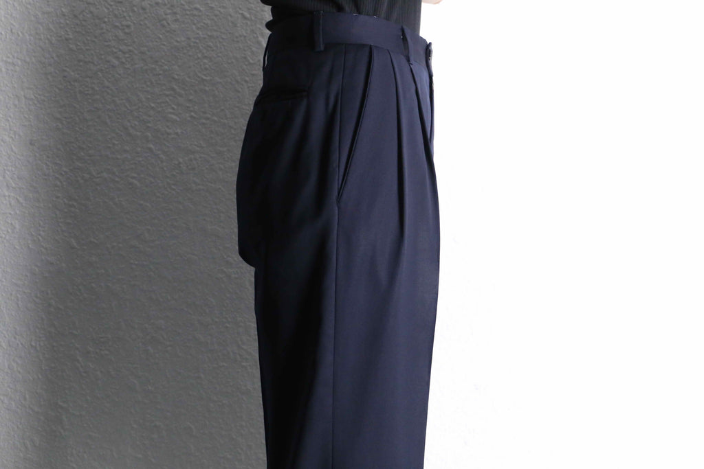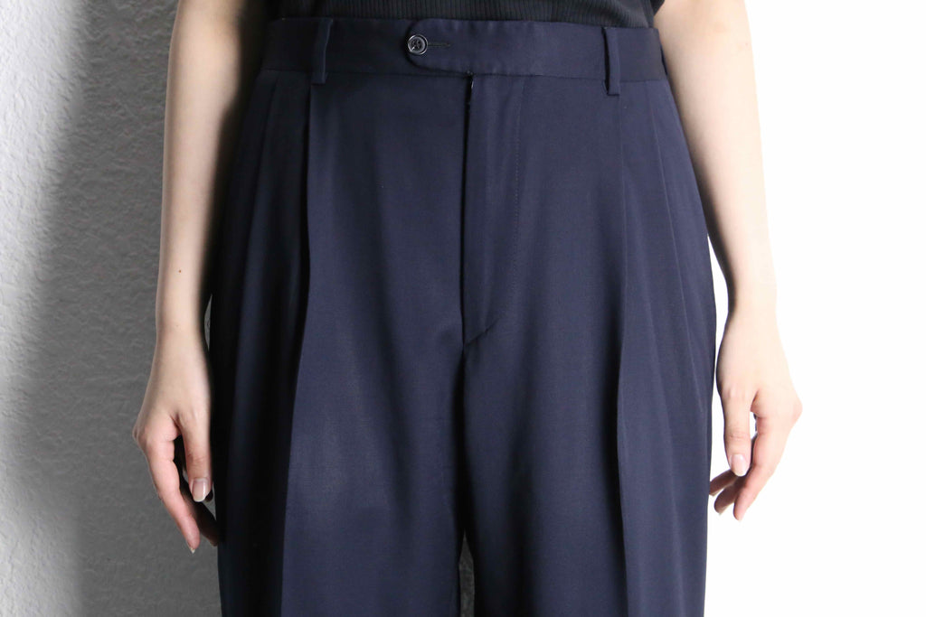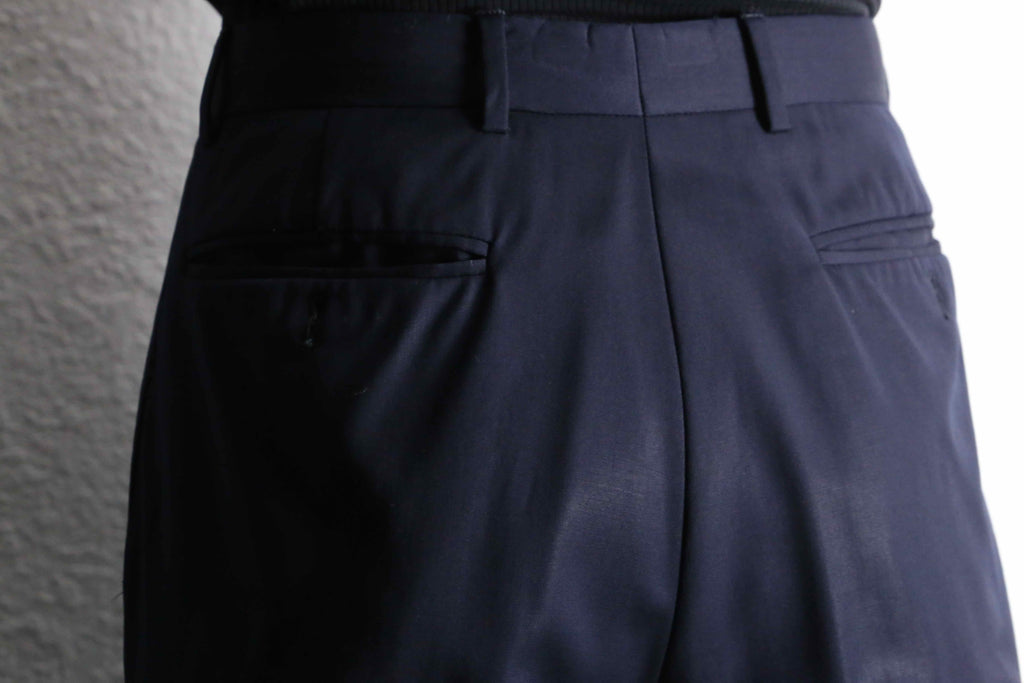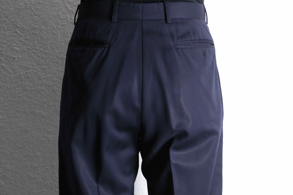 光に翳すとよく映える、美しい光沢をもったネイビーカラー。生地自体の機密度がとても高く、薄地ながらもしっかりとハリのある生地感です。また、ウールとは思えない程のドレープもとても魅力的です。