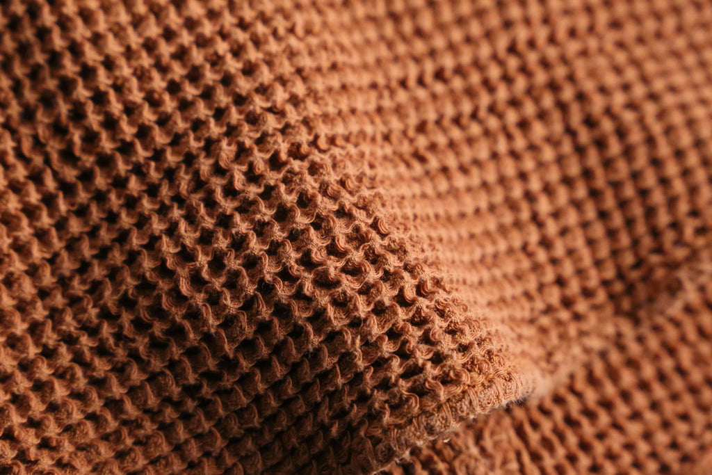 落ち着いたテラコッタカラーは、スタイリングに程よい温もりと奥行きをプラス。シンプルなシルエットながらも、編みの表情がしっかりと主張し、一枚で雰囲気のある佇まいに仕上がります。