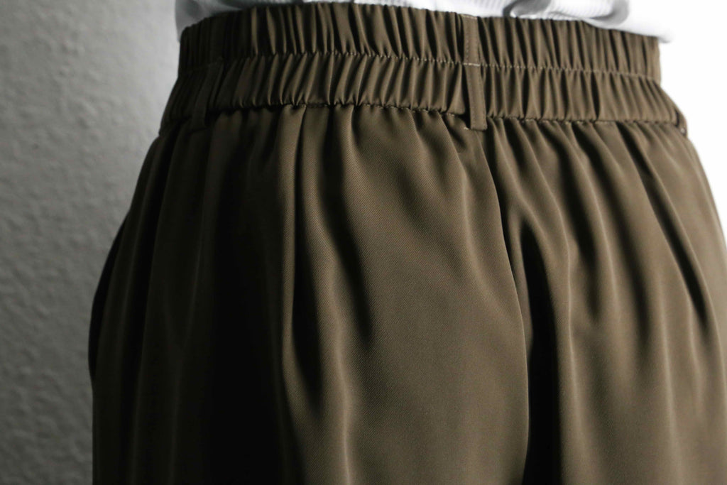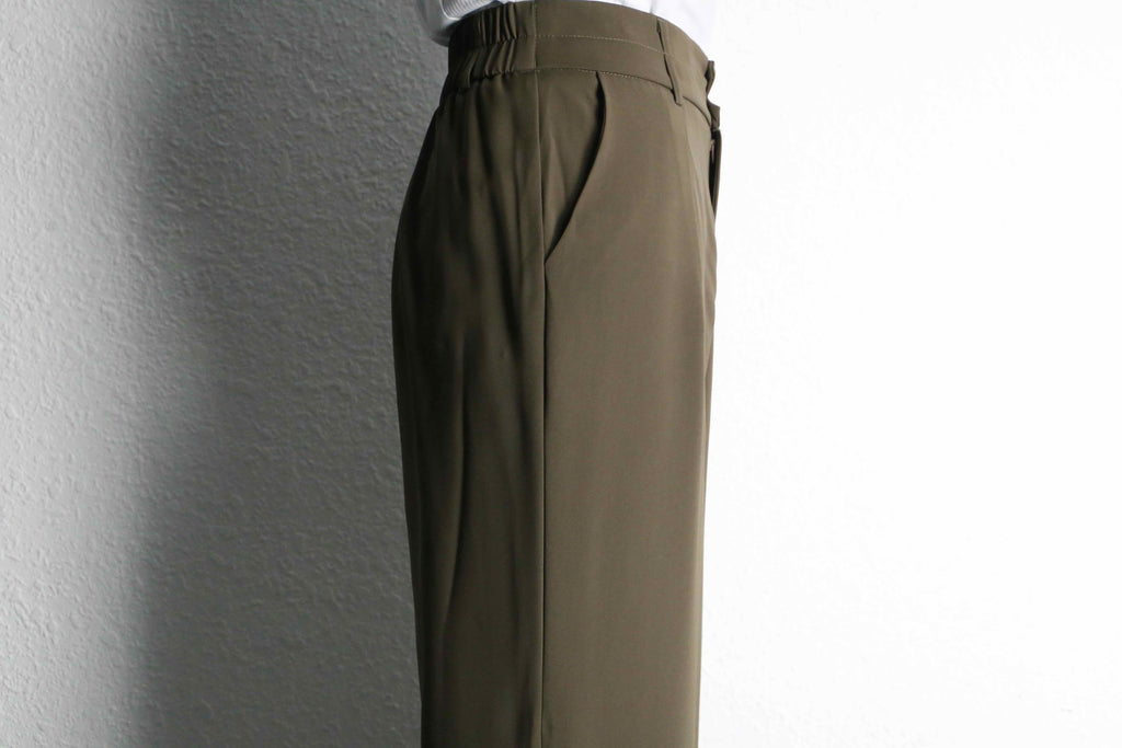 落ち着いたオリーブトーンが印象的な、上品さと抜け感を兼ね備えたワイドスラックス。
