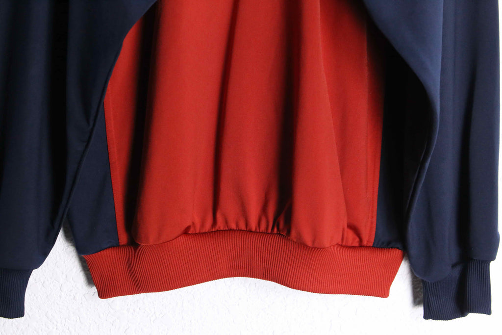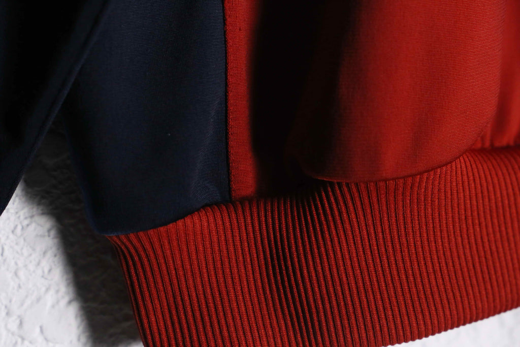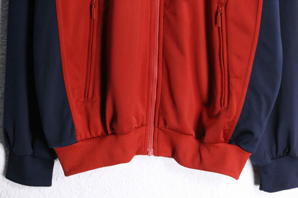レッドを基調に、ネイビーとホワイトの切り替えが映える配色は、当時の空気感を色濃く残した存在感のあるデザイン。ショルダーに走るスリーストライプスと、胸元のロゴ刺繍がブランドらしいアイコニックなアクセントに。