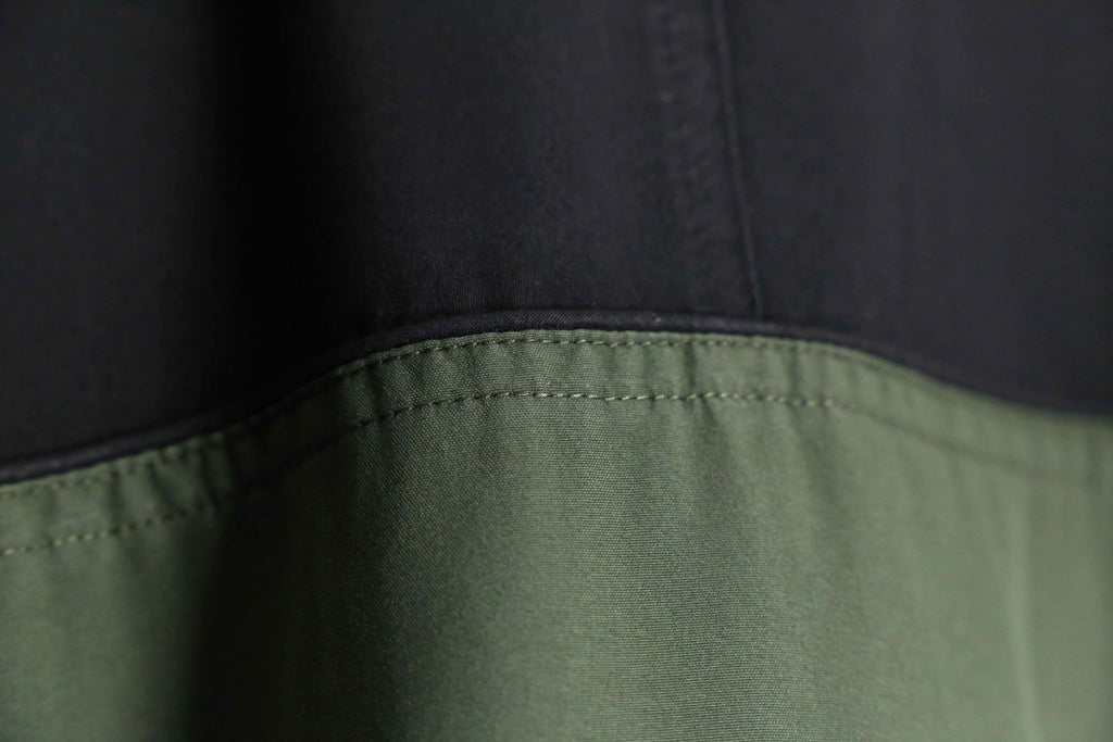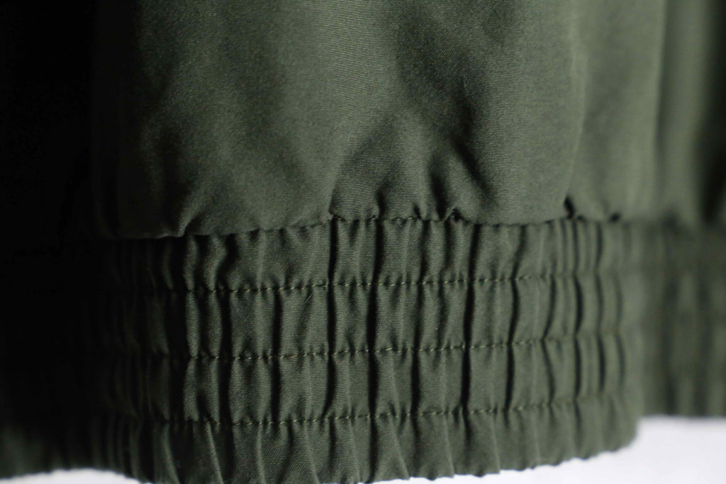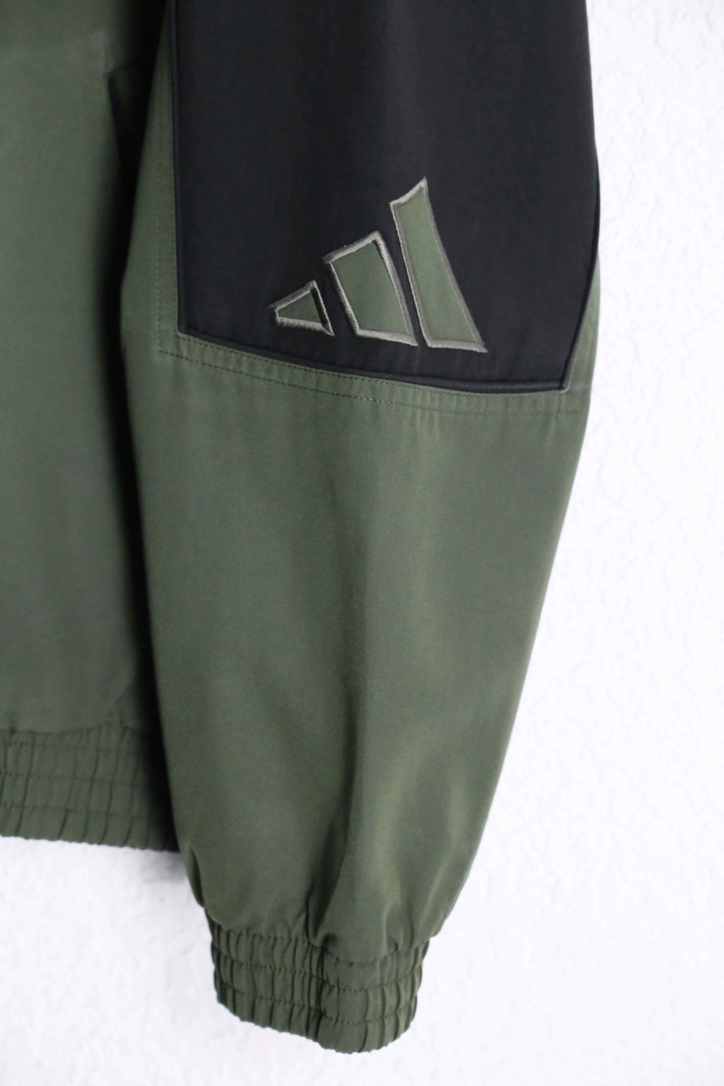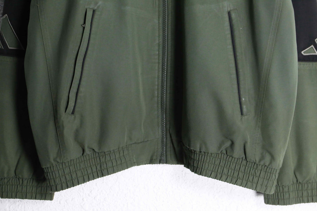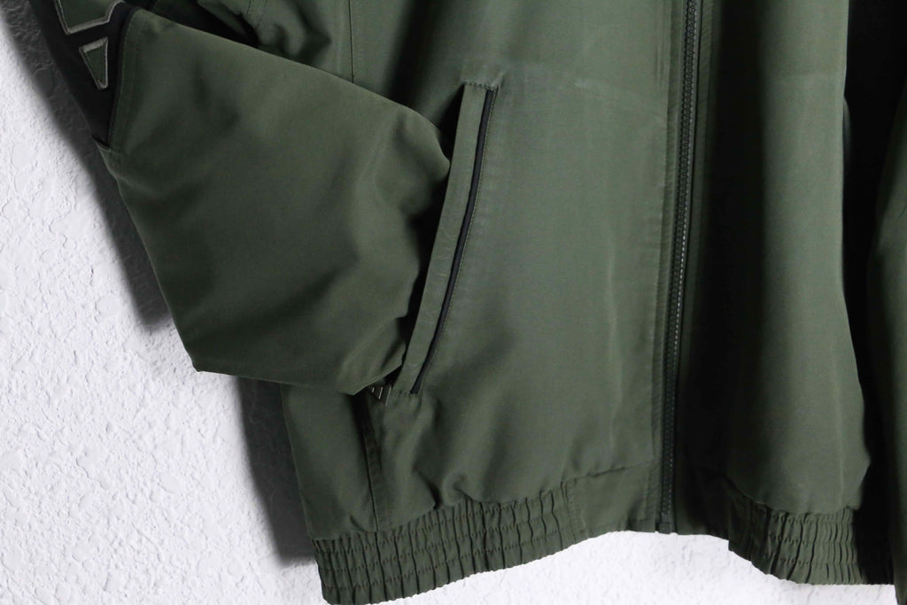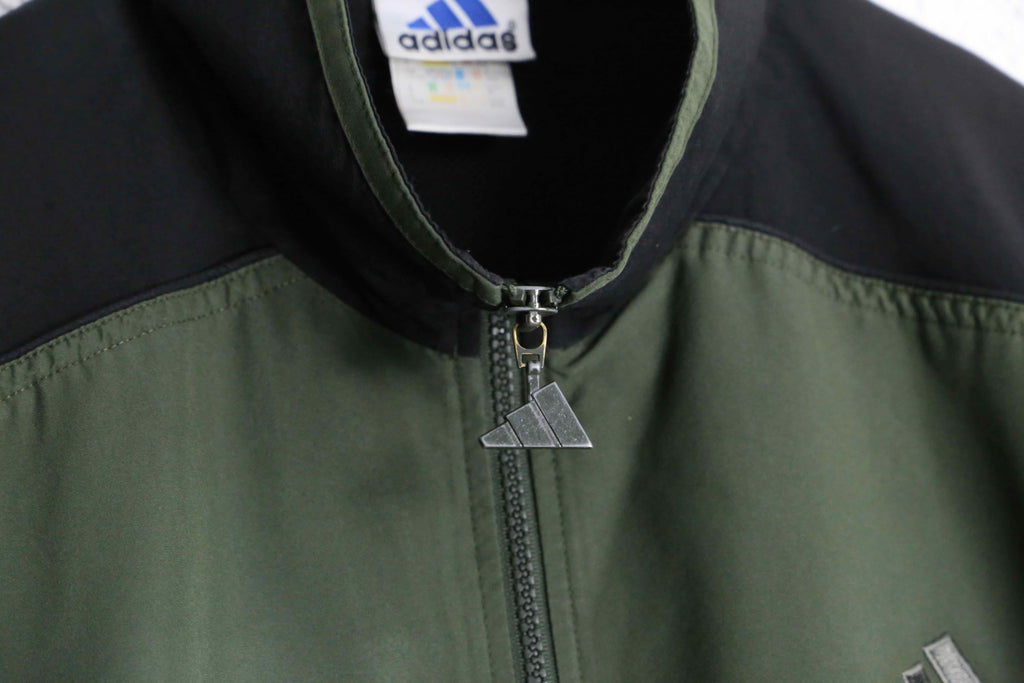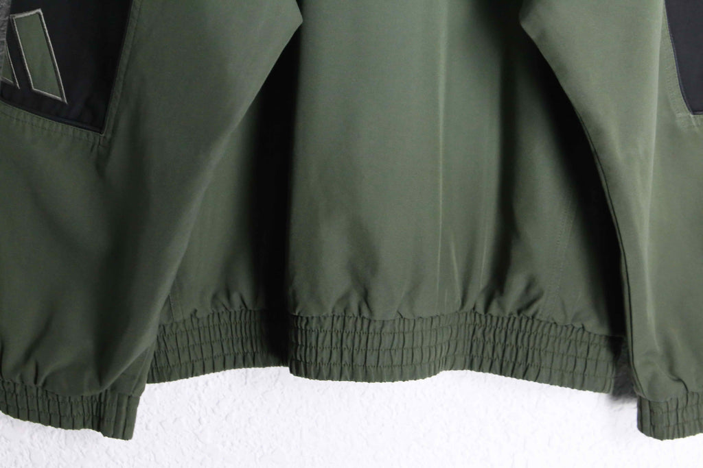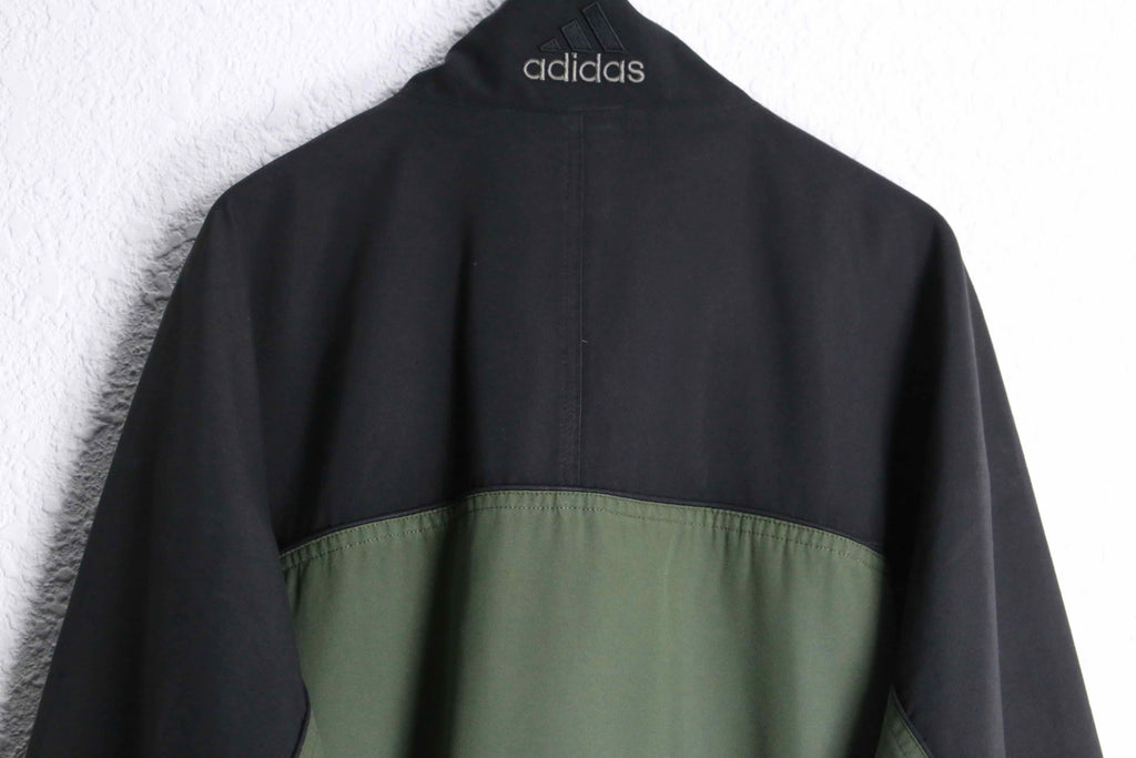 オリーブグリーンをベースに、ブラックで切り替えられた配色が特徴的で、無駄を削ぎ落としたミニマルなデザインの中に、90’sらしいスポーティーなエッセンスを感じさせる1着です。胸元のロゴ刺繍や肘に施されたロゴが程よいアクセントとなりアディダス好きには堪らない仕様に。