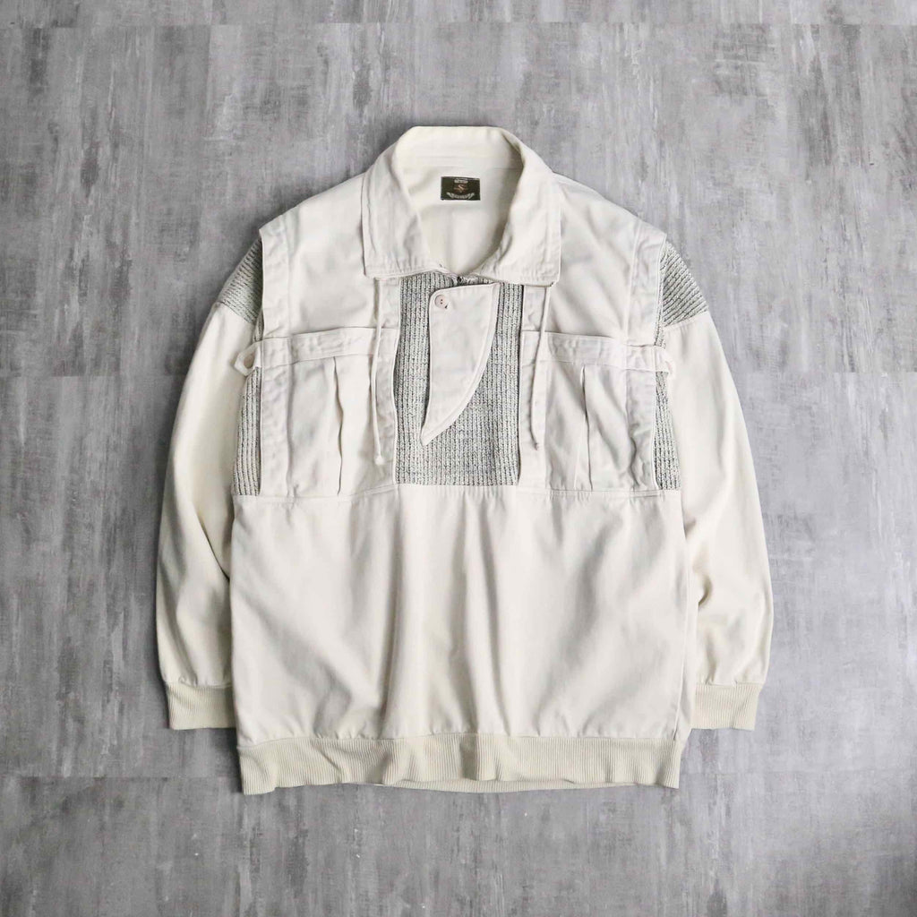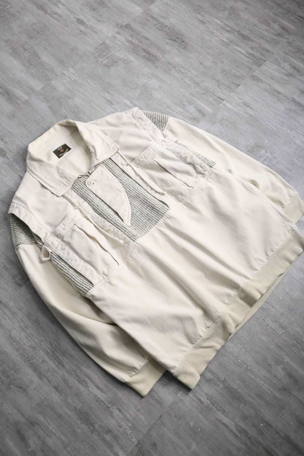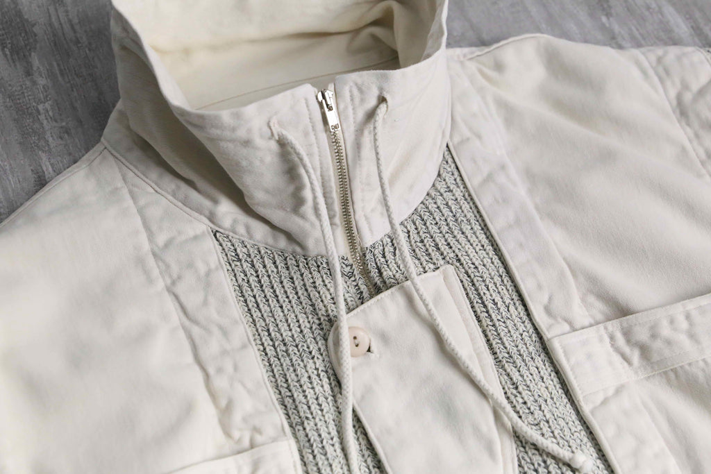 若干のハリのあるコットン生地をベースに、所々のニットの切り替え、両胸のポケットやボタンストラップ等重厚感溢れるデザイン。柄アイテム等に引け劣らない感度の高いアイテムです。