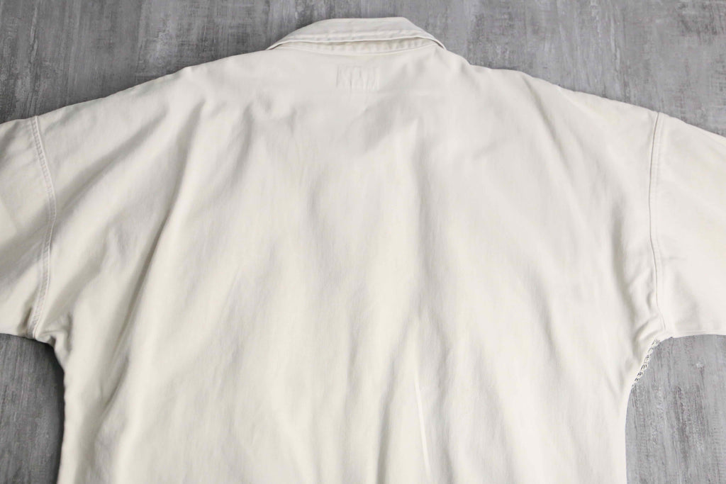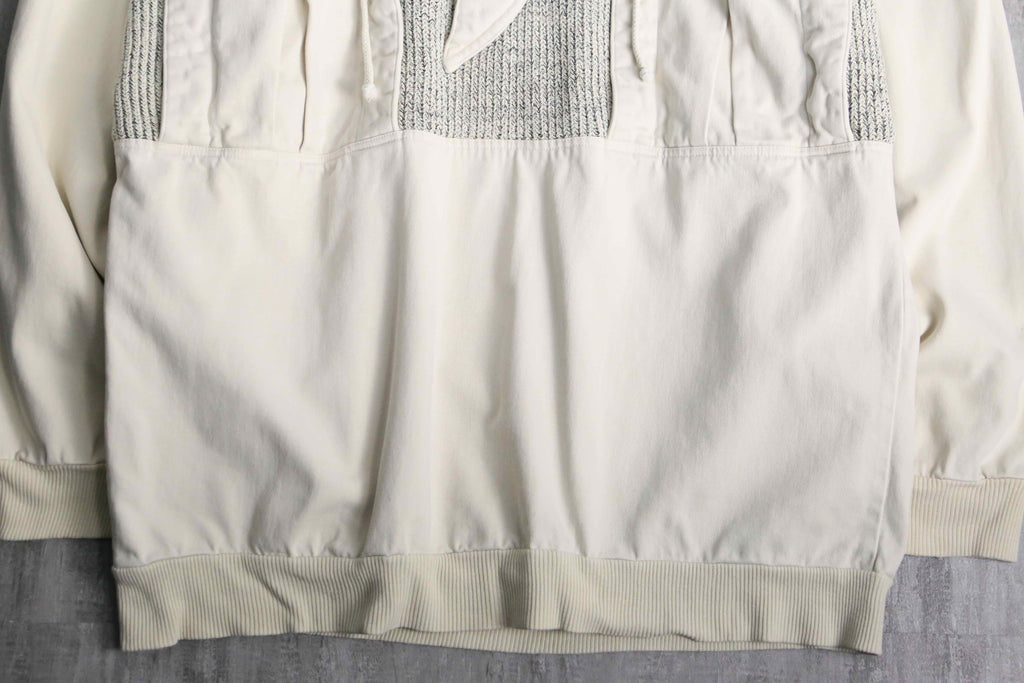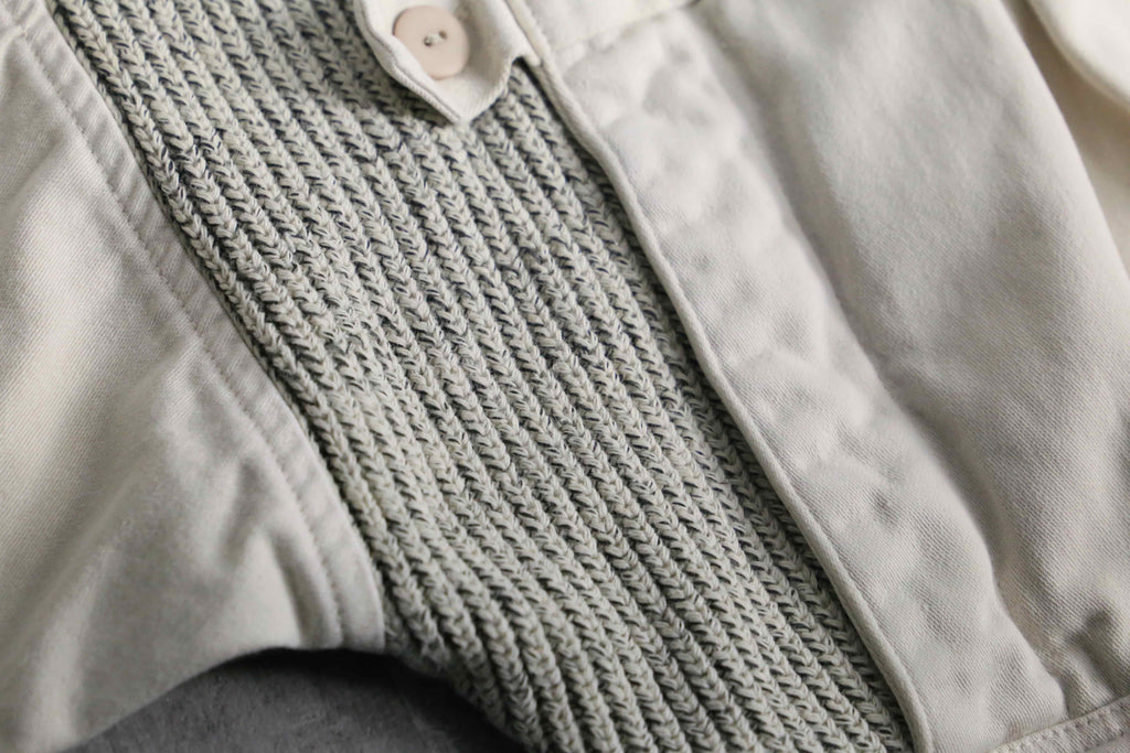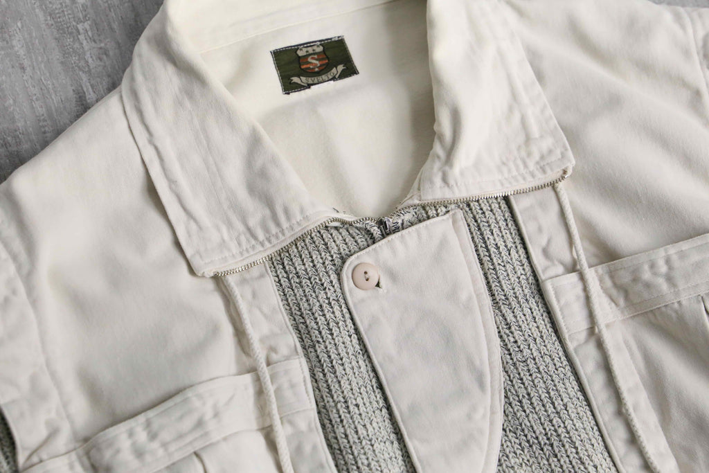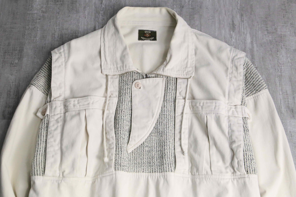 若干のハリのあるコットン生地をベースに、所々のニットの切り替え、両胸のポケットやボタンストラップ等重厚感溢れるデザイン。柄アイテム等に引け劣らない感度の高いアイテムです。