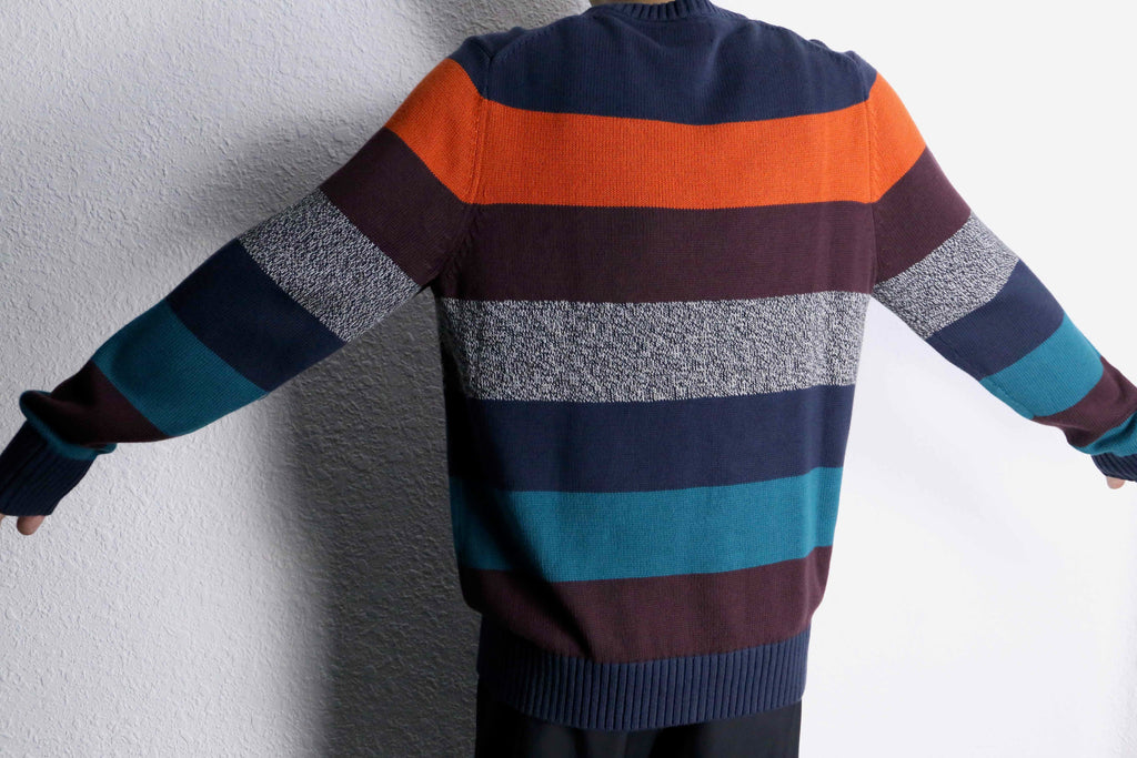 深みのあるバーガンディやネイビーを基調に、鮮やかなオレンジやターコイズを効かせたボーダー配色は、クラシックでありながら遊び心を感じさせます。