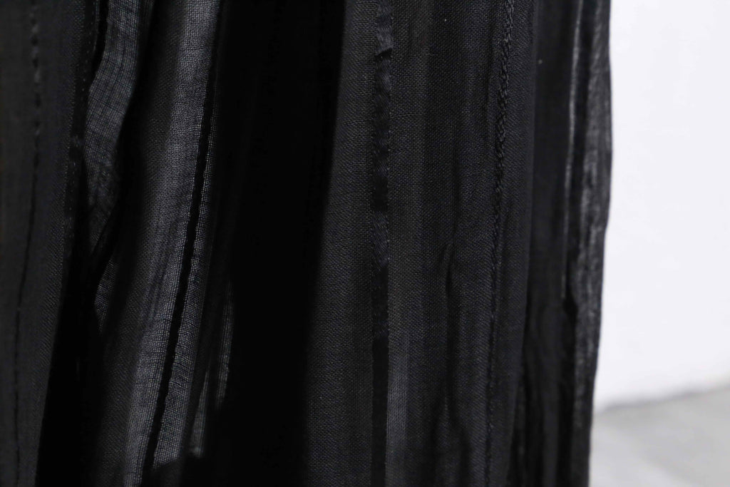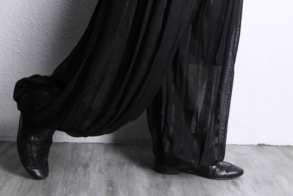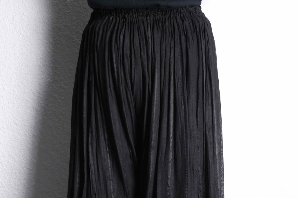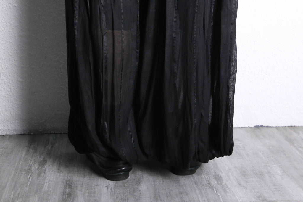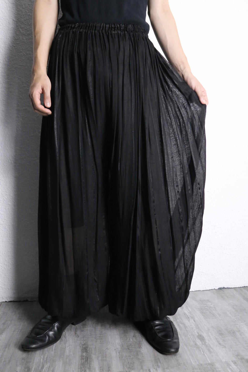 真っ黒ボディにストライプ状のデザインを施してあり、シンプル過ぎず良いアクセントになっています。生地感はシアーという透けるぐらいの生地の薄さで履きやすく、軽い素材。裾のリブは強めに効いており、バルーン特有の裾を溜めたワイドなシルエットとプリーツの太めな畝と相まってが可愛らしく表現されています。