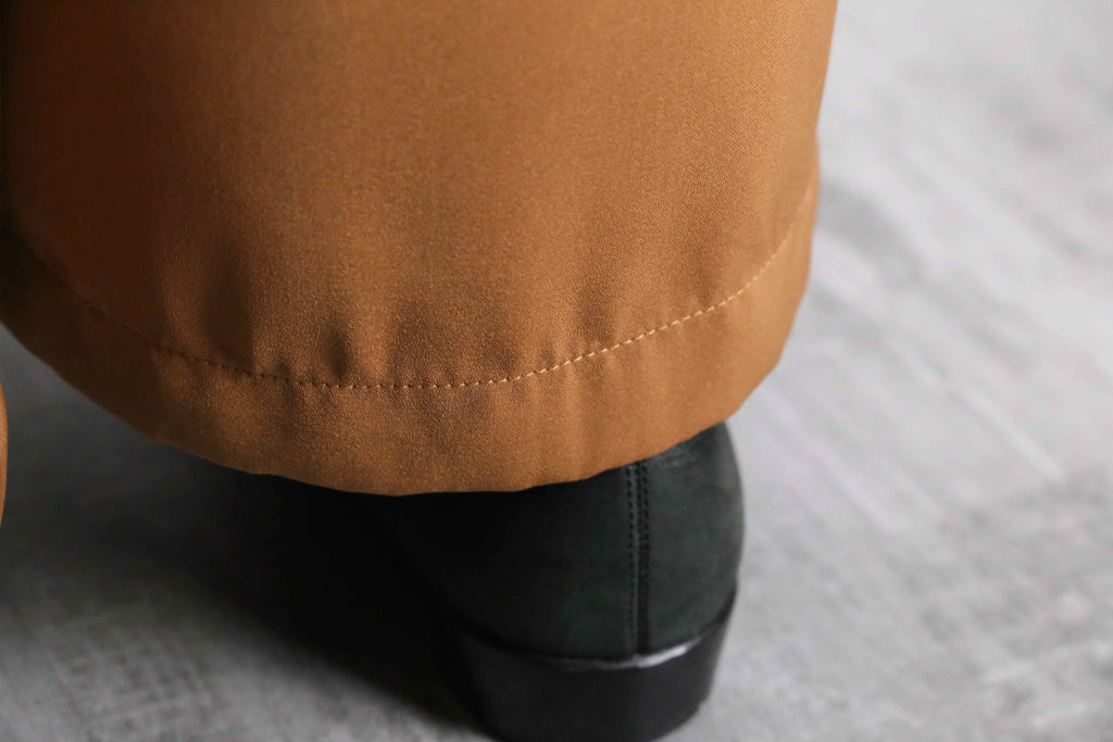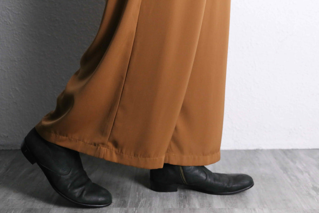 裾幅38cmというワイドなシルエットに、深めに入ったボックスタック。光沢のある素材であり、さらに薄くて軽いという履きやすい仕様。ドレスシャツ等を合わせた綺麗めなスタイリングとは間違いなく相性抜群です。