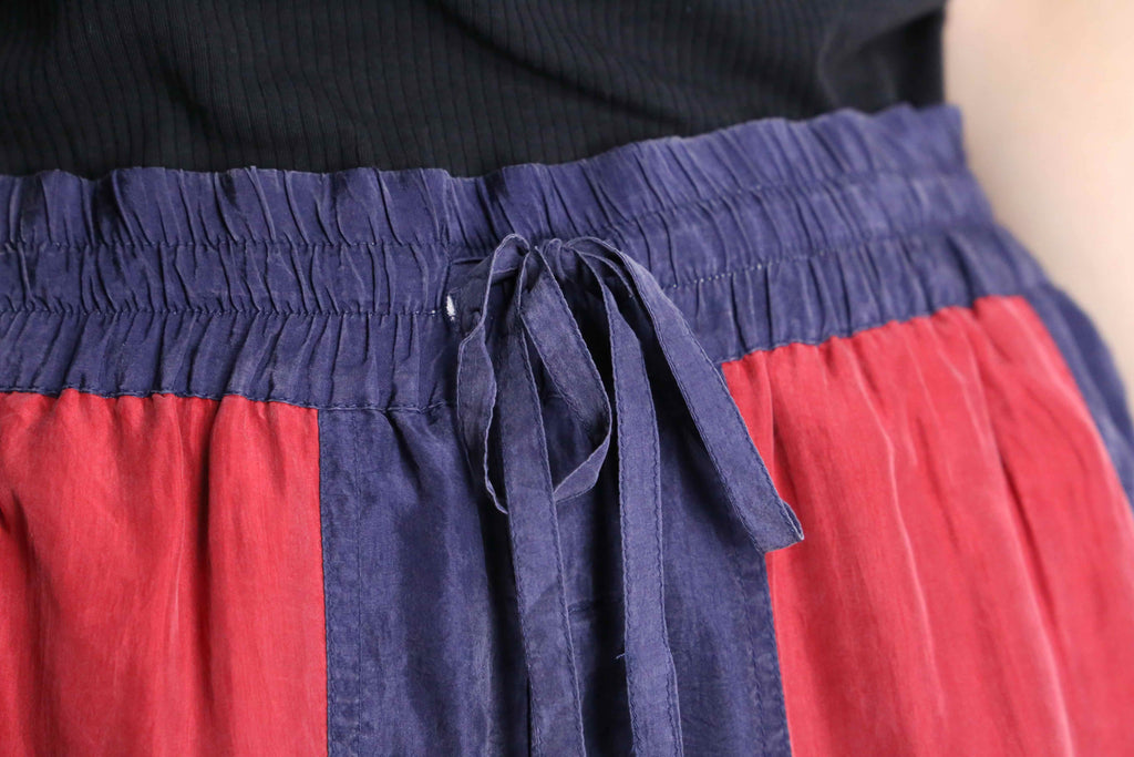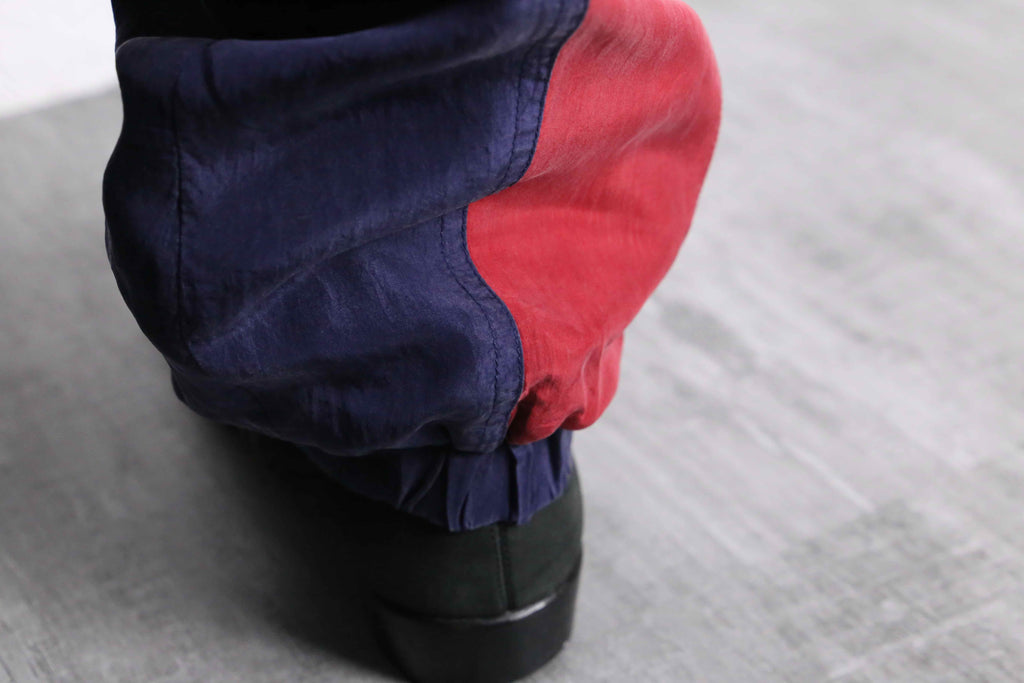 攻撃性のあるレッドに落ち着いた印象のパープルを合わせた魅力的な配色。古着らしいインパクトのあるカラーリングは少しレトロさを感じます。エスニックな柄物トップスと合わせたり、シックなブラック系統でモードに合わせても良いですね。