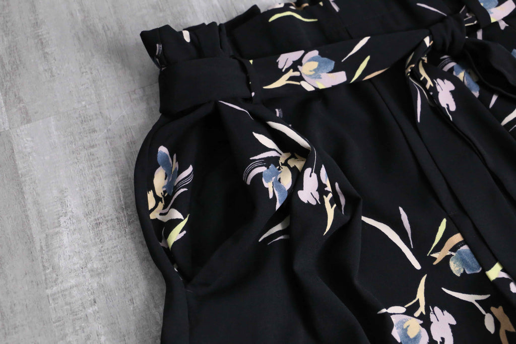 ブラックをベースに淡いフラワーパターンが映えるワイドパンツ。軽やかな落ち感のある素材感が、美しいシルエットを演出。