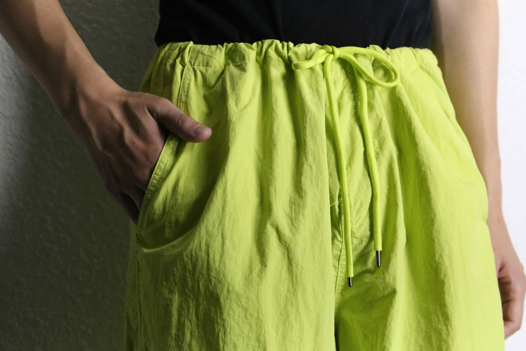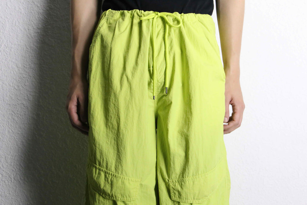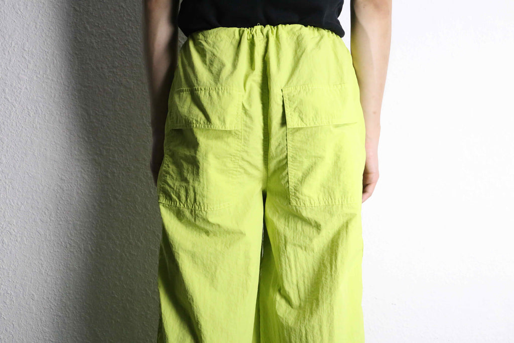 ワイドストレートのシルエットに、カーゴポケットを付けたシンプルなカーゴパンツ。注目すべきはその色。発色の良い蛍光グリーンを採用、一気に主役になれるアイテムへ。裾にはドローコードを搭載、自由自在に変化する足元のシルエットの可能性は無限大。恐らく塩縮加工ナイロンと思われる自然な風合いは、綿ライクな仕上がりに。