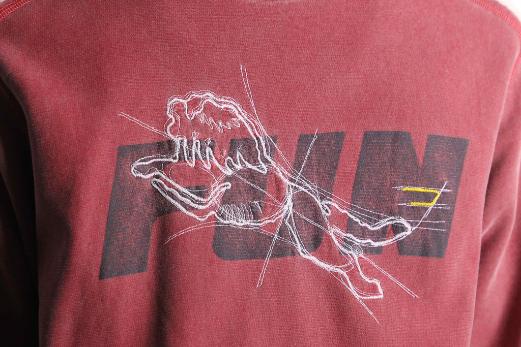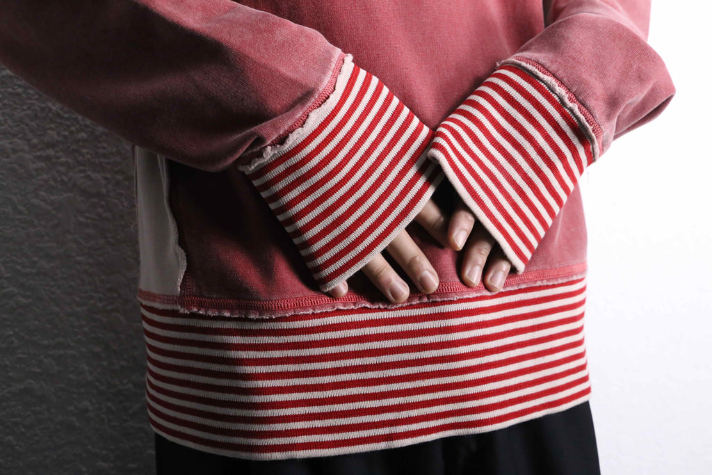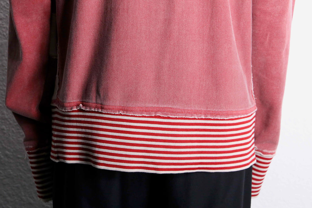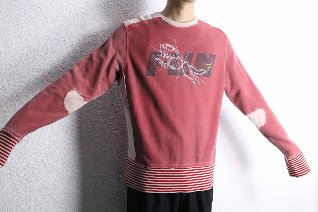 前面のプリントが可愛らしいのは勿論のこと、特筆すべきは褪色したボディに対し発色の良いストライプの切り替え。更にはシーム部分を全てインサイドアウトで仕上げたデザインで、実にDIESELらしい一着。