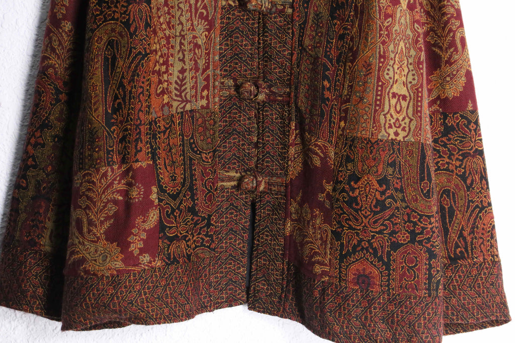 暖色でまとめたペイズリー柄などを映しすゴブラン生地をパッチワークした非常に稀有なデザイン。大きめのチャイナボタンとマオカラーがさらにアクセントを加えており雰囲気ある1着へと昇華させています。側面にはシームポケットも付属し機能面もしっかりと充実しています。ライトアウターとしてはこれ以上ないくらいの美しさとデザインです。