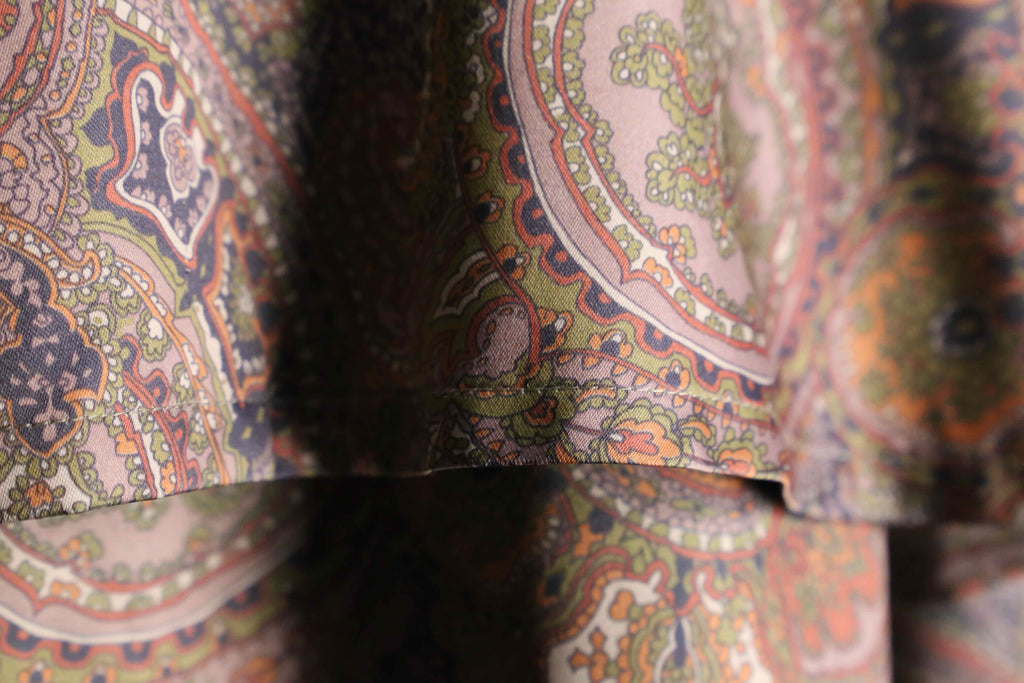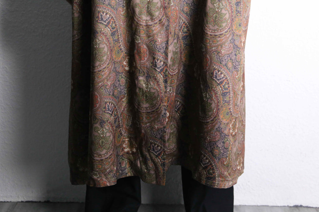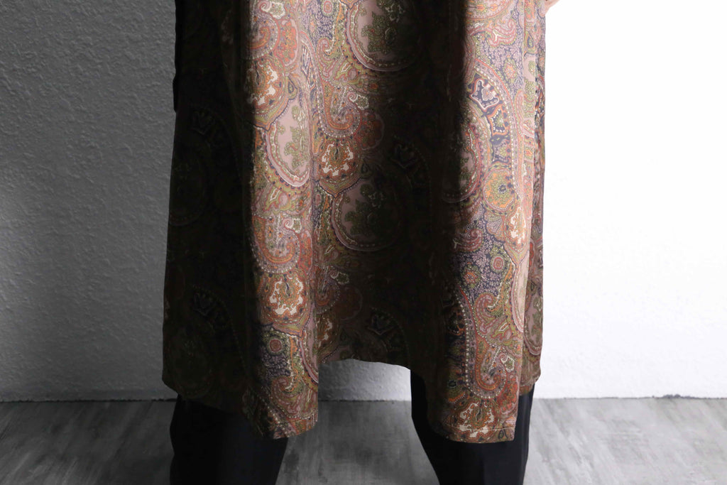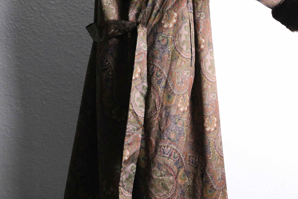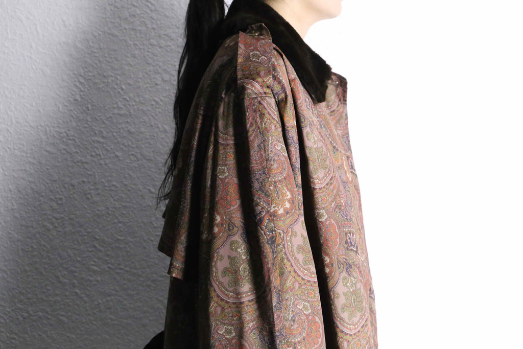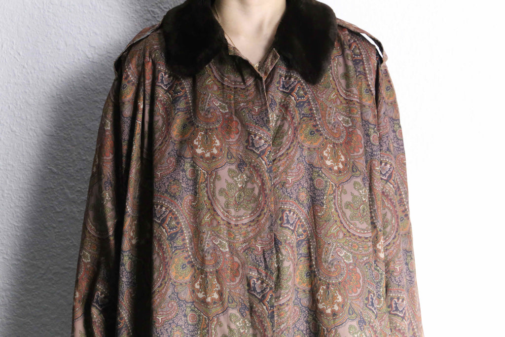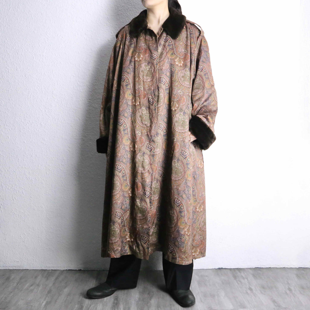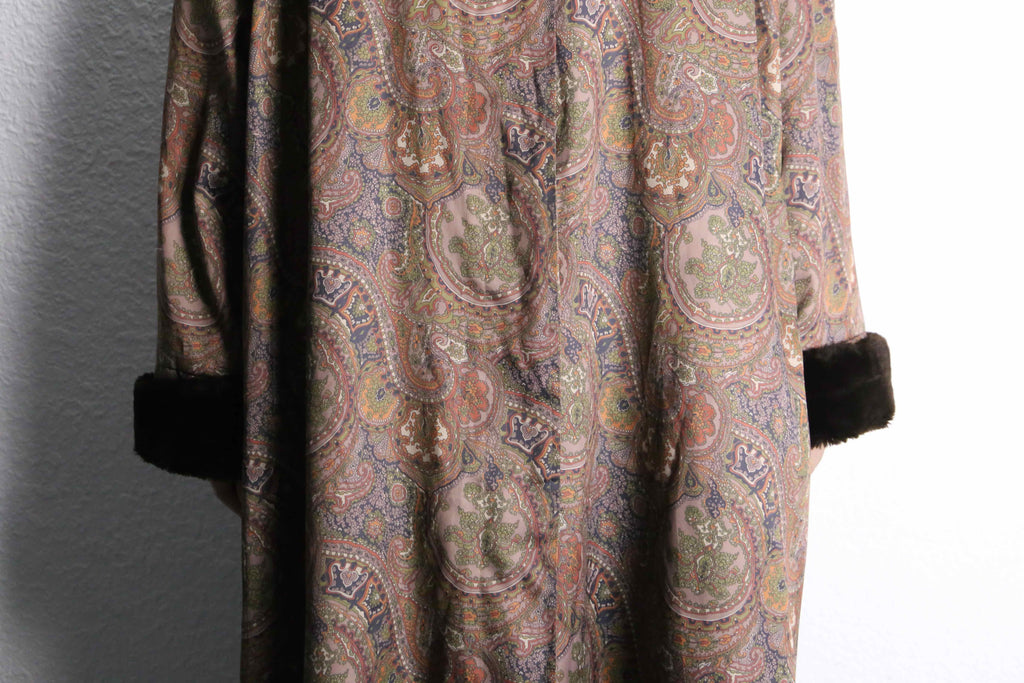 クラシカルなペイズリーパターンを全面に配し、襟元と袖口にダークトーンのファーをあしらったロングコート。