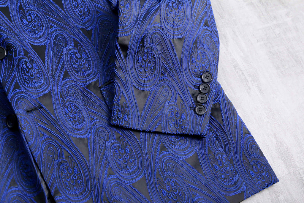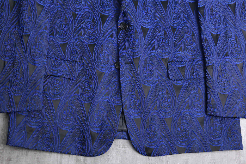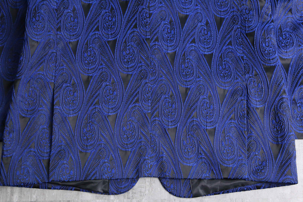 光沢の効いたブラックボディに、ブルーのペイズリー刺繍を全面に。日光や照明で存在感を発揮すること間違いなし。シングルのテーラード型に2ボタンと比較的クラシックな様式に肩幅、身幅共に広めのサイジングで使いやすく他のアイテムとの相性が良い1着かと。