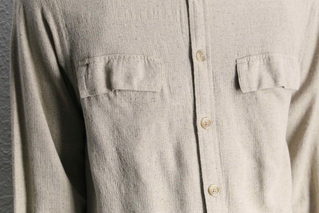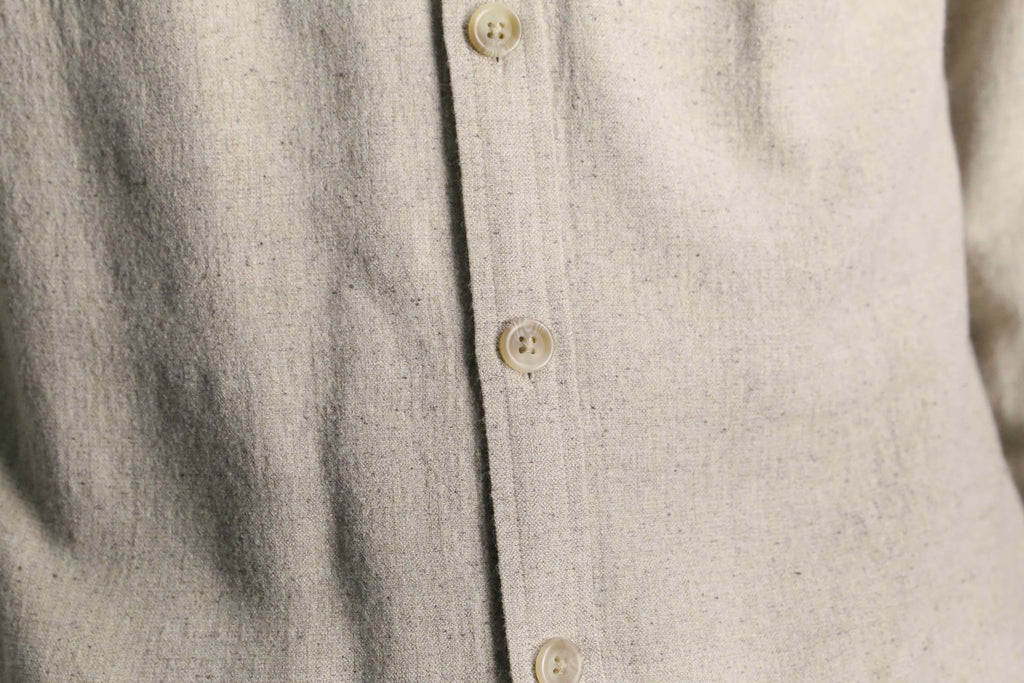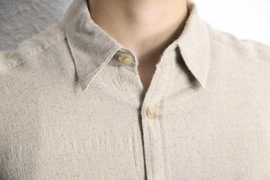 生地の特性として、サンドベージュのボディの所々に細かなネップのようにグレーが映りますので、1枚着でもインナーでも成立する汎用性の高さも魅力です。