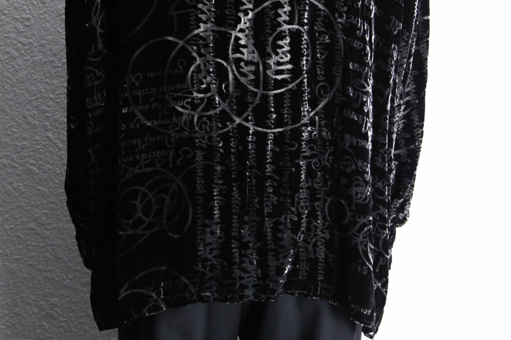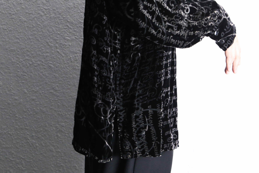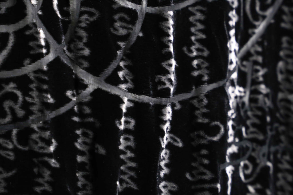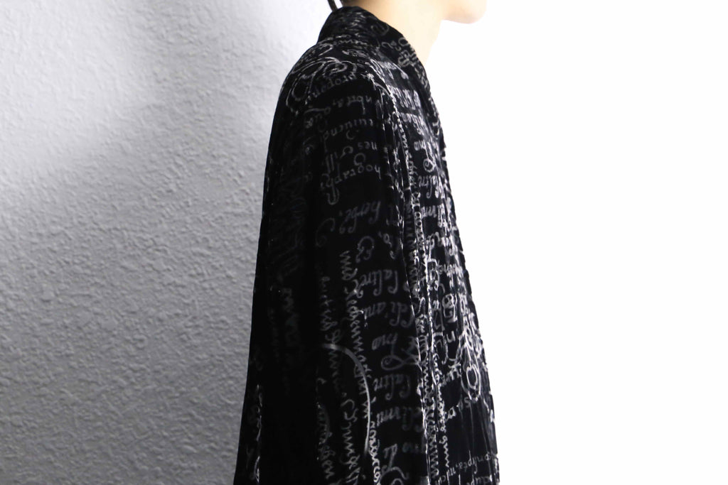 ベロアを抜くような形でシアー生地が表れる立体感のある1着。色々な字体がデザインがモードな雰囲気を、毛足のあるベロア生地がラグジュアリーな雰囲気を醸します。