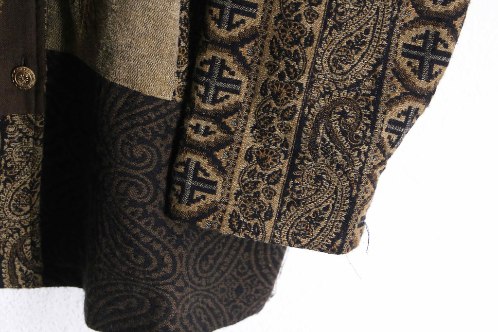 現在はヴィンテージ古着で人気を集める"white stag"ですが、今回も例に漏れずヴィンテージ古着ならではのデザイン性を残した90'sアイテム。全面にペイズリーとフラワーのエスニックデザインを施し、オータムカラーで統一。フロントにはパッチワークデザインの様にフラワーの刺繍が描かれており、この一枚で主役級かと。