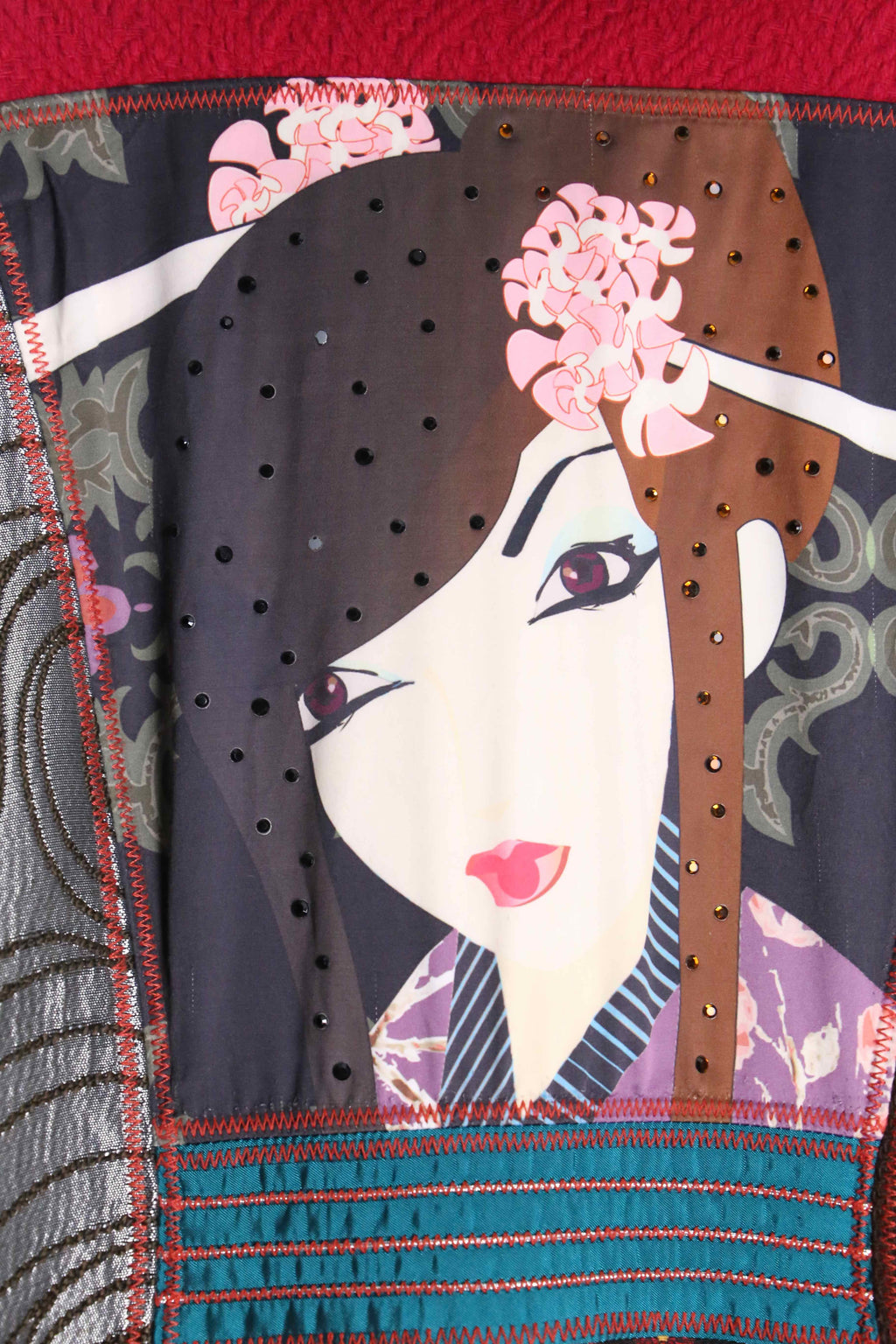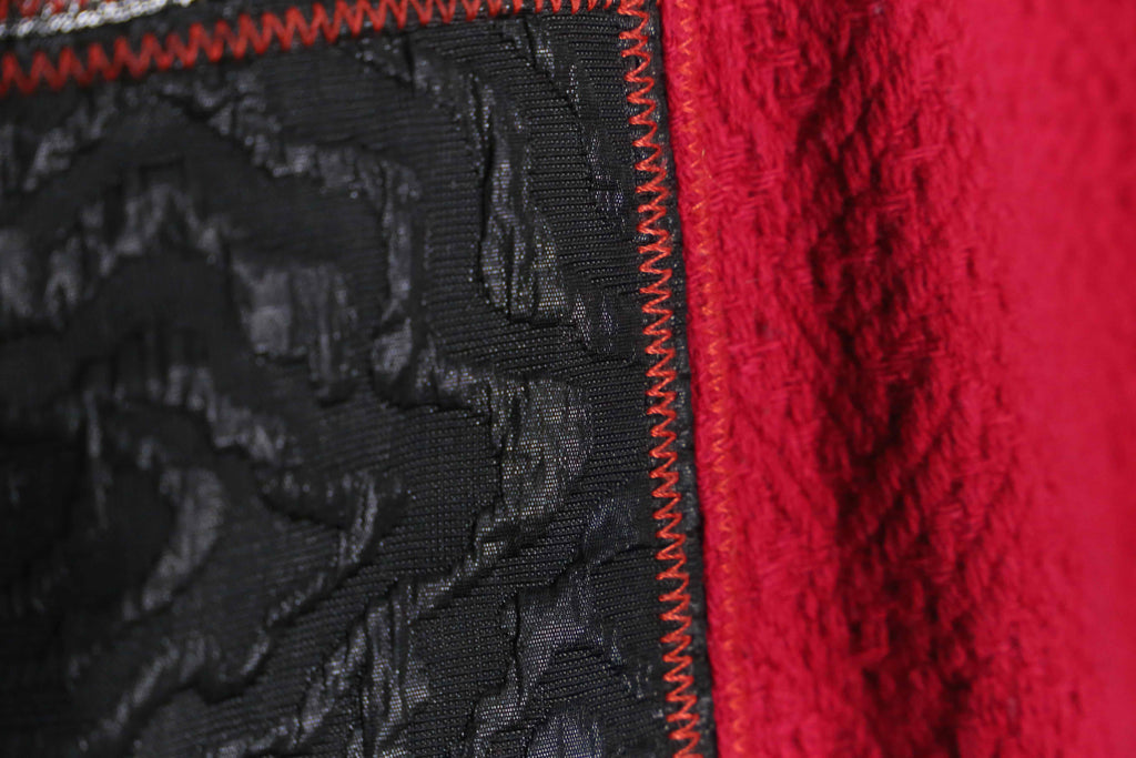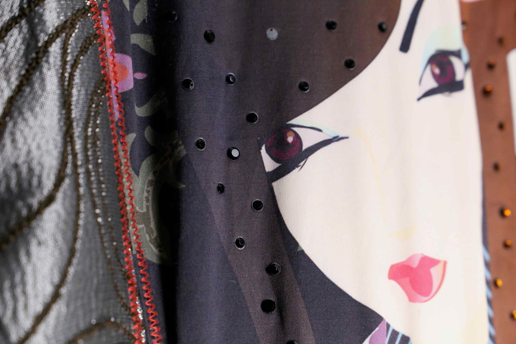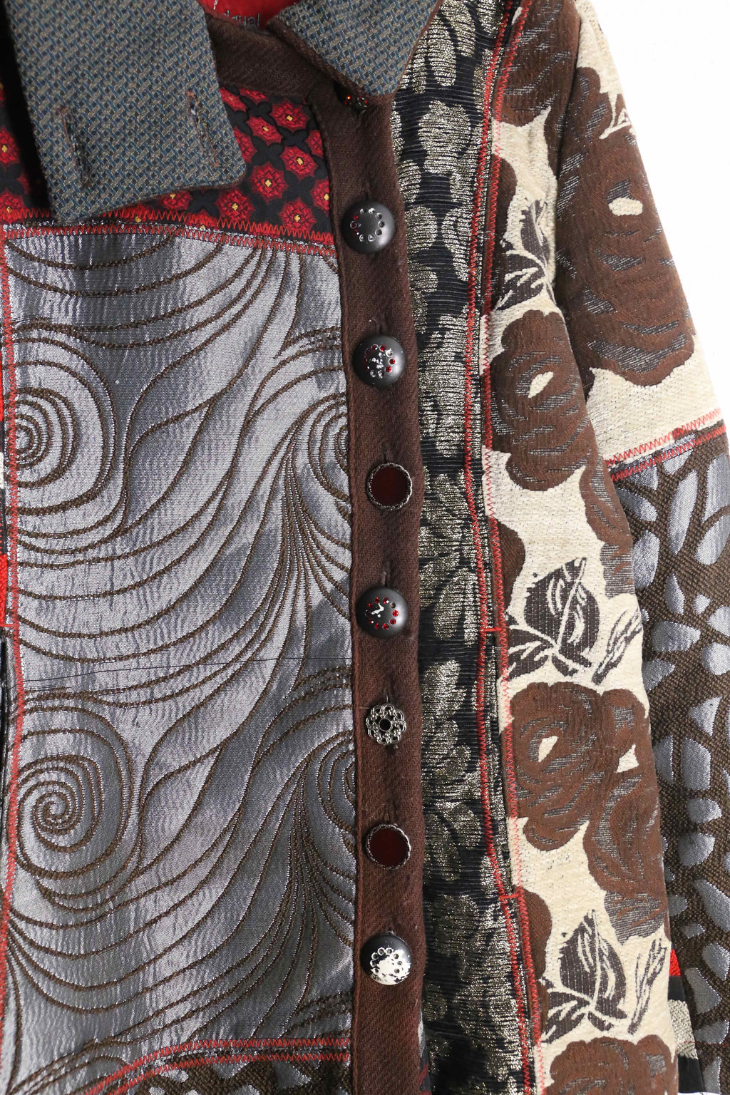 異なる柄や質感の生地を組み合わせた、ひと目で分かる強い存在感が特徴です。色やパターンを重ねた派手さが前に出る分、細かいディテールよりも全体の印象が先に立つ仕上がり。これだけ柄と情報量があるため、スタイリングを考え込みすぎる必要はなく、