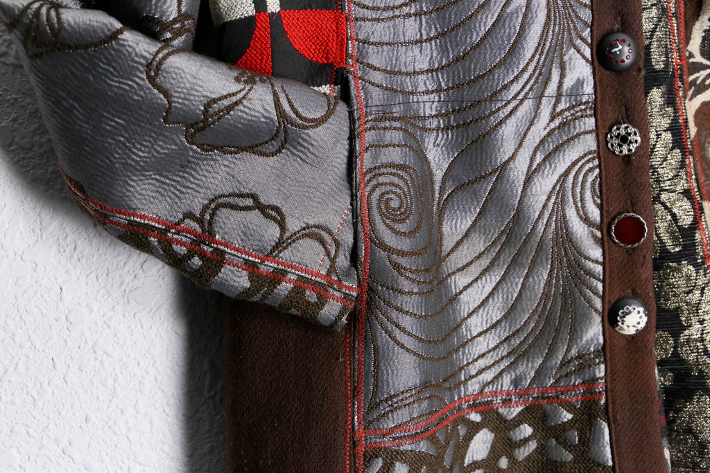 ポリエステルをベースに、ウールやナイロン、レーヨン、コットンを混紡した素材を使用したパッチワークコート。