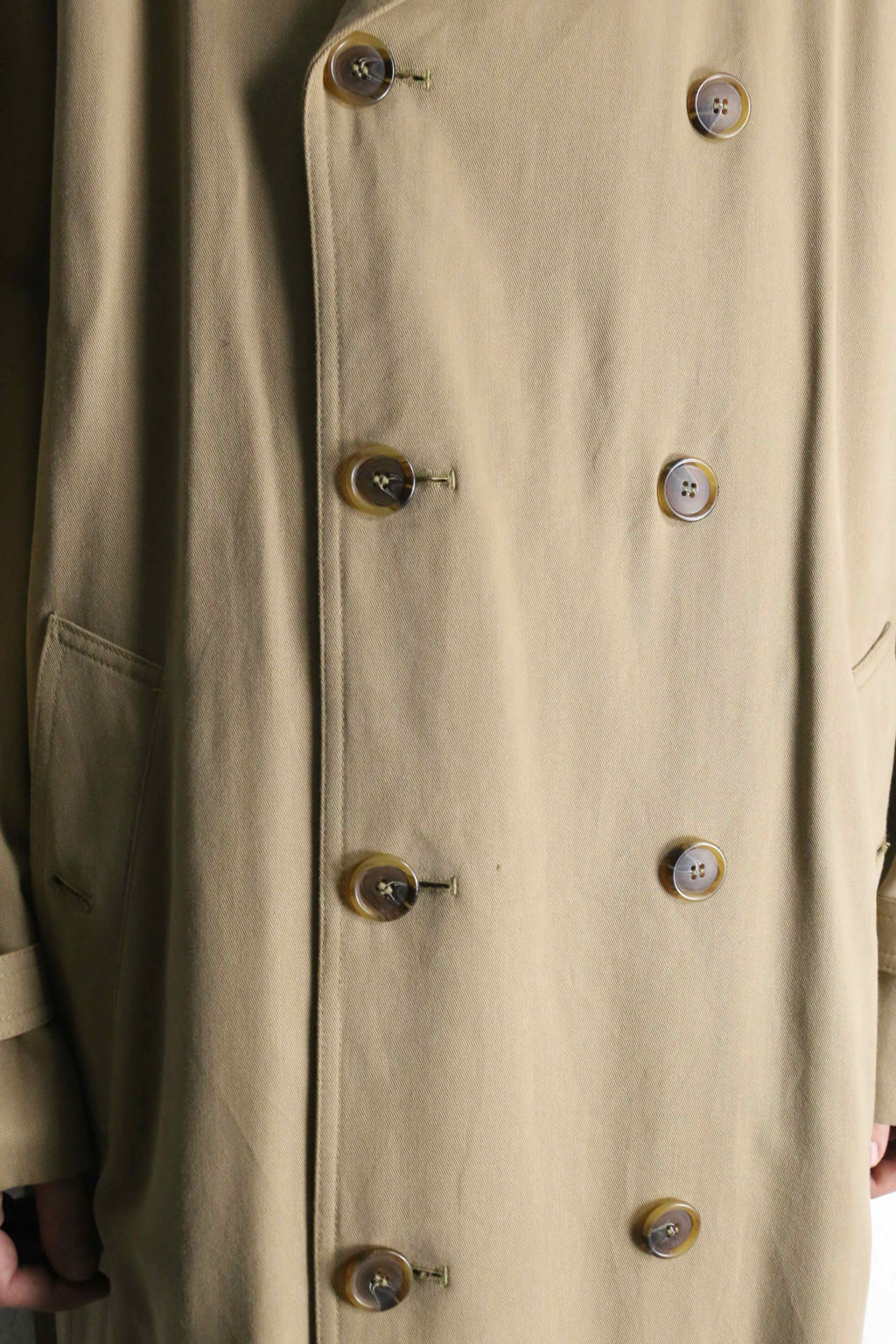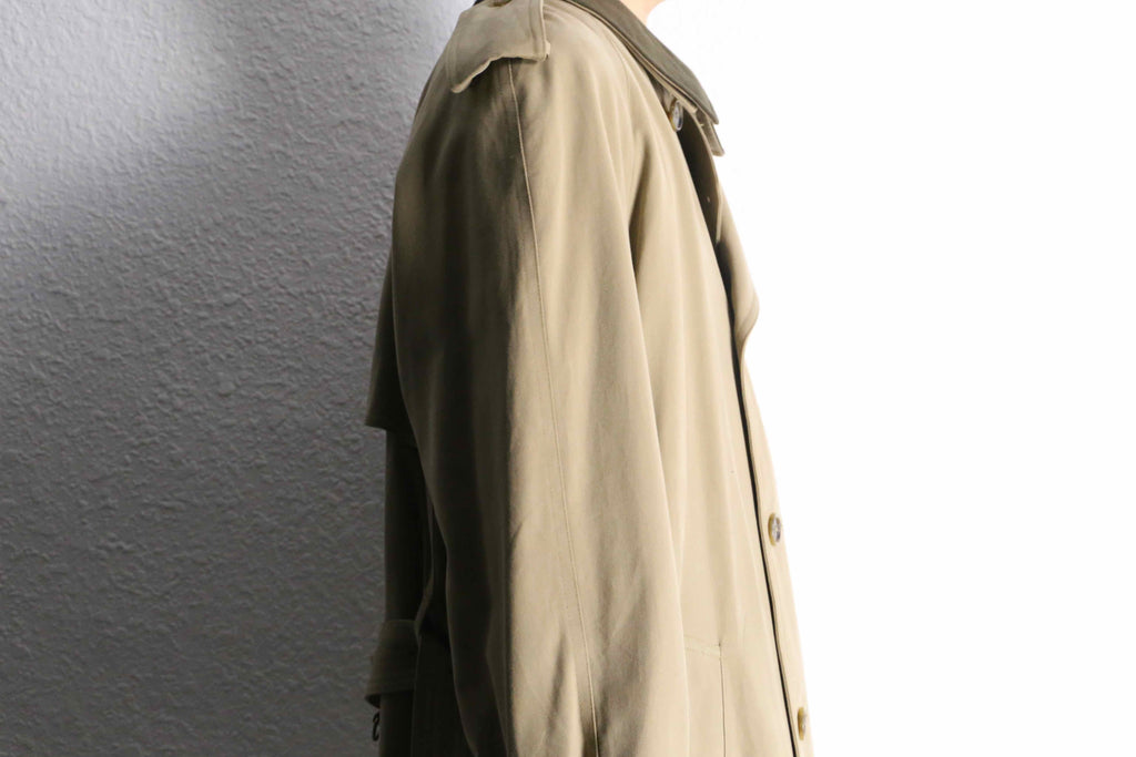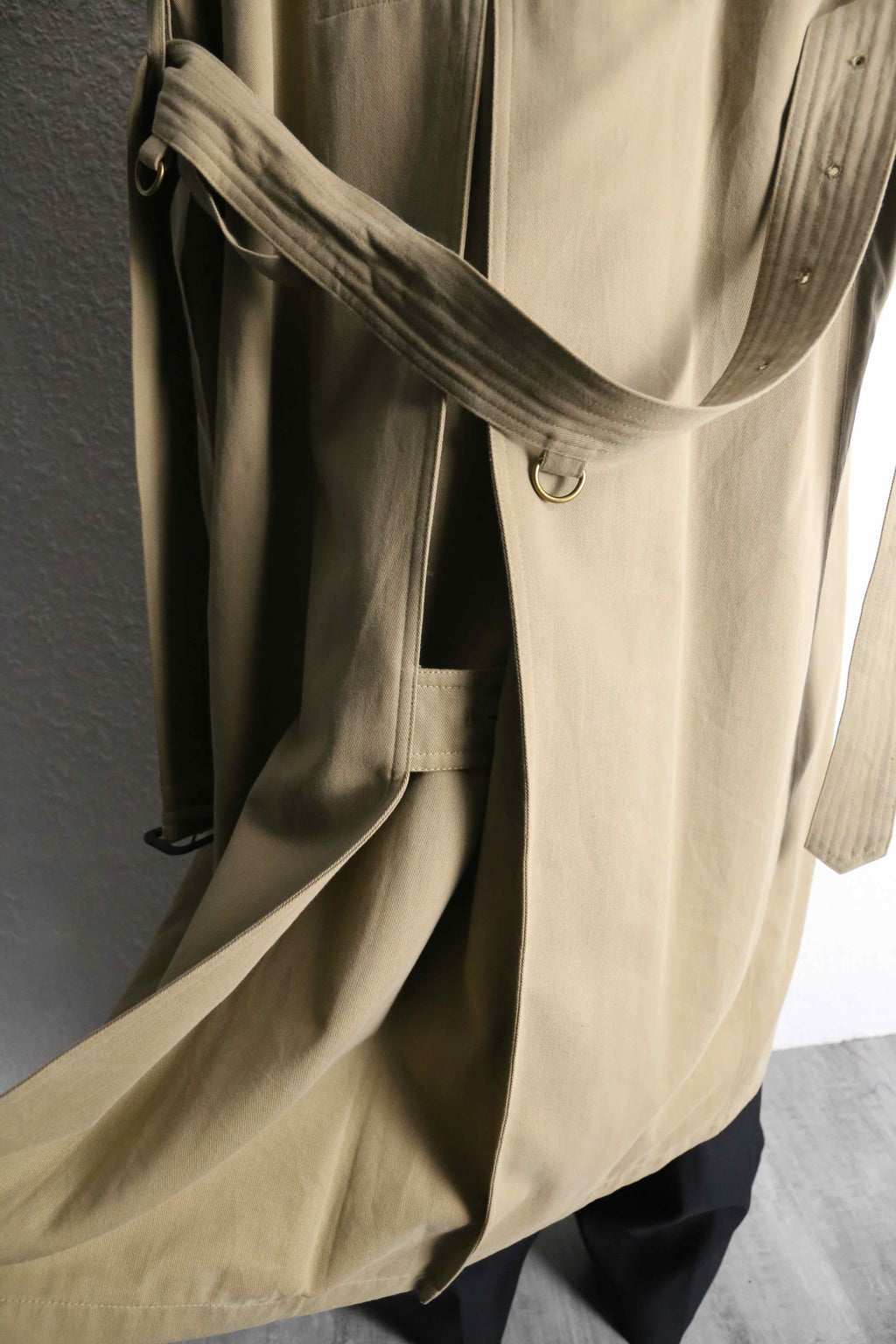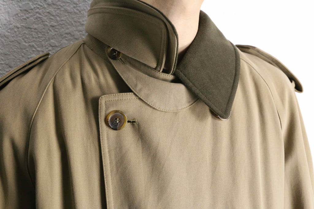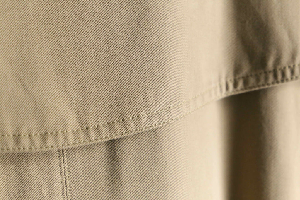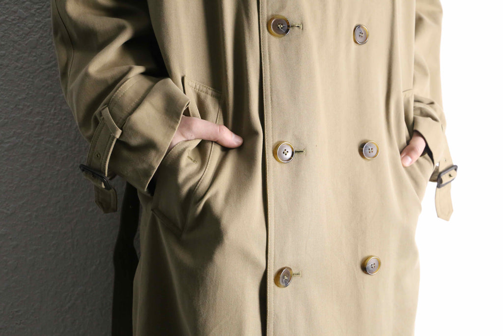 トレンチコートというとかっちりした印象になりがちですが、コットン×テンセルによるほんのり起毛したツイル生地のため柔らかくリラックスした印象です。トレンチ特有の固さがなく軽やかな着心地。二枚襟となっていますので、顔周りの印象を変えて着用頂けます。