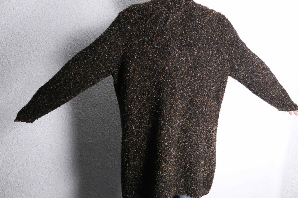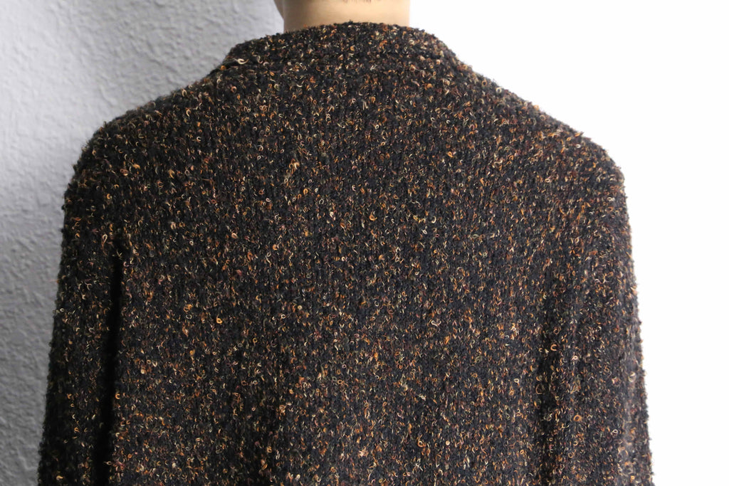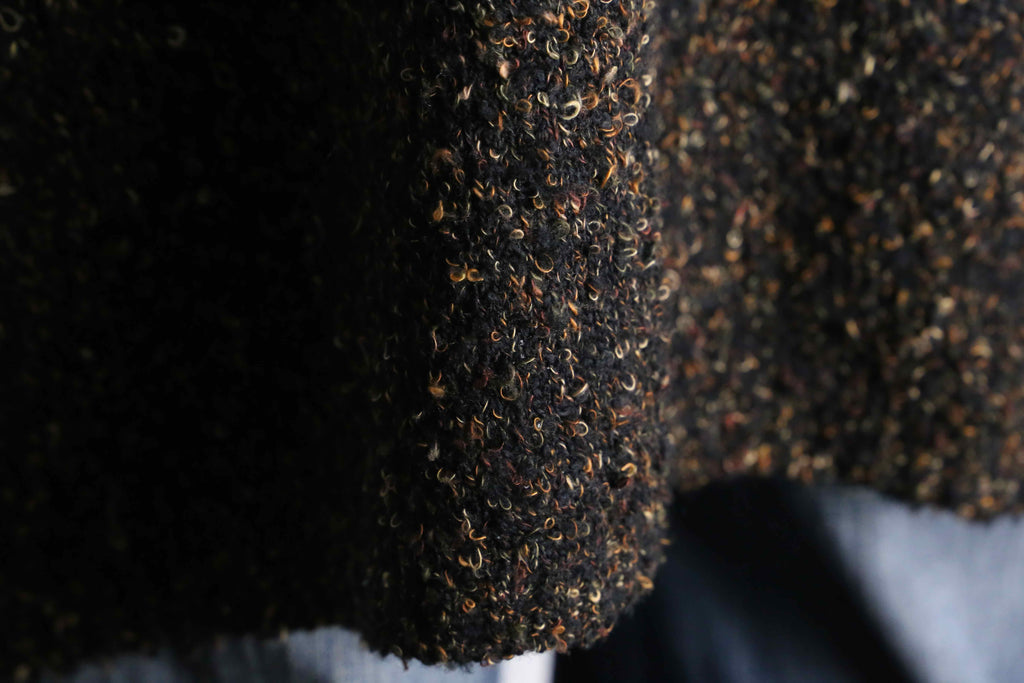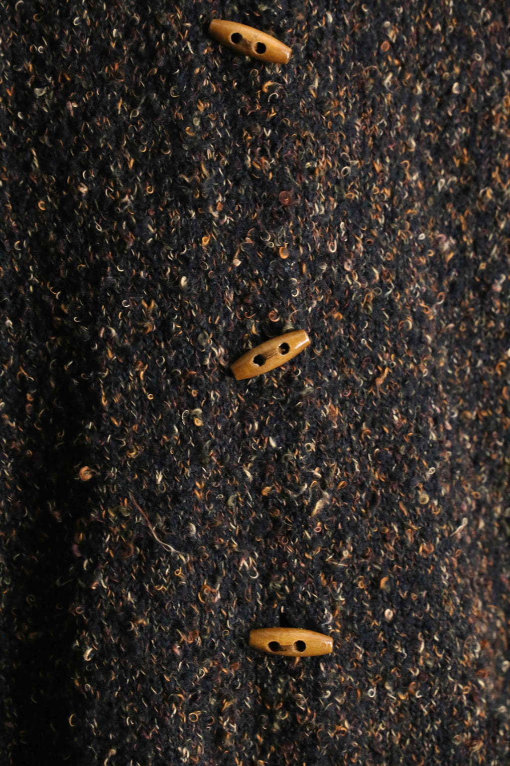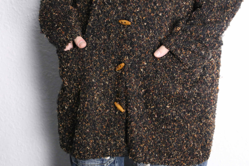 ダークブラウンとイエローの混ざった糸で編まれた、毛足の長いモコモコとした生地感のニットボディ。フロントセンターラインのボタンにはトグルボタンを採用、一見ダッフルコートのように見えますが、生地はそこまで厚くなく、長いシーズンでご着用いただける1着かと。シルエットや袖口のディティールがコートのように、襟や素材感はシャツのように。まさに、一石二鳥でお使いいただけるアイテム。