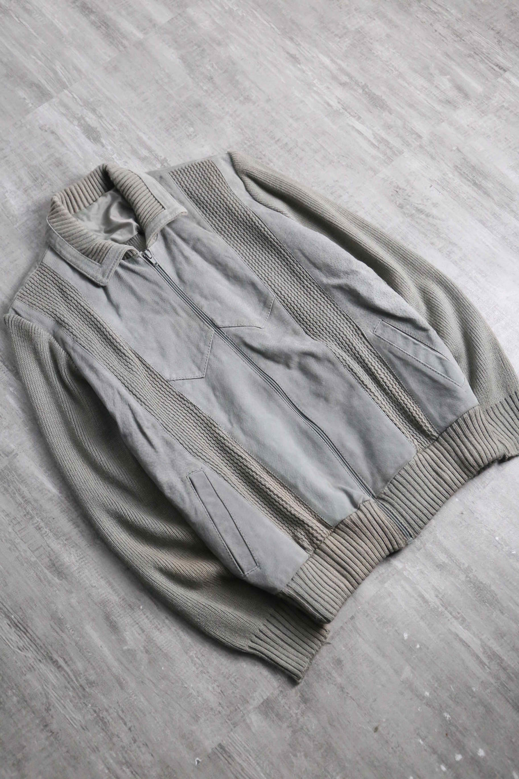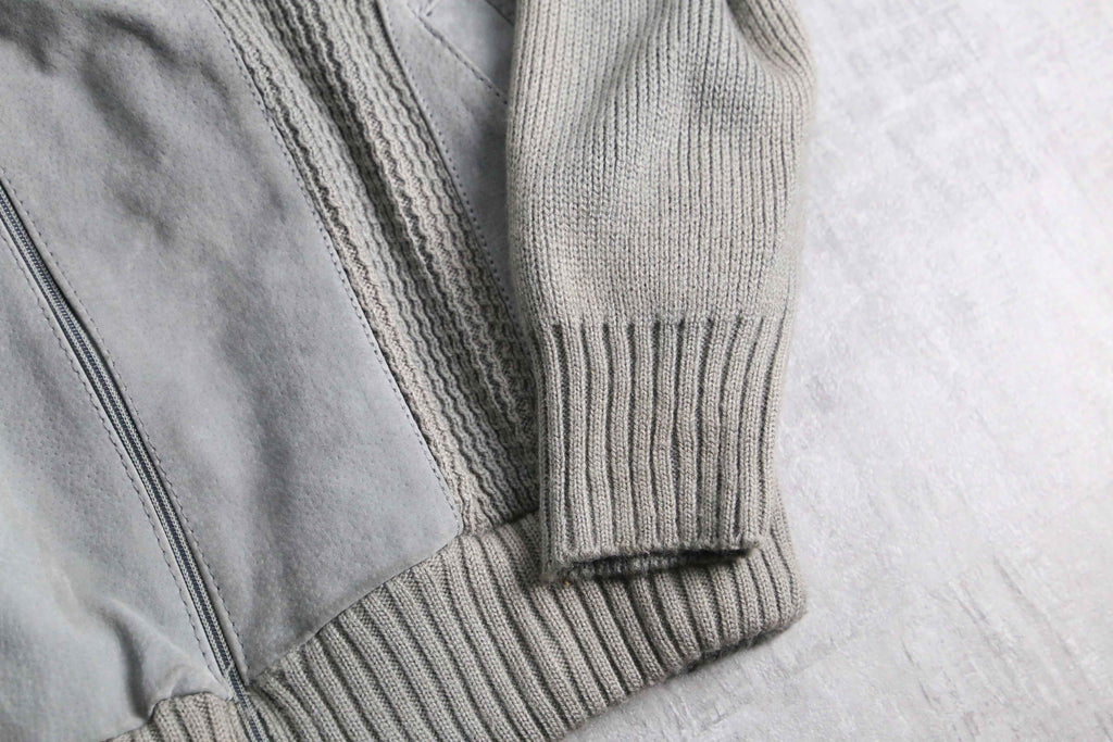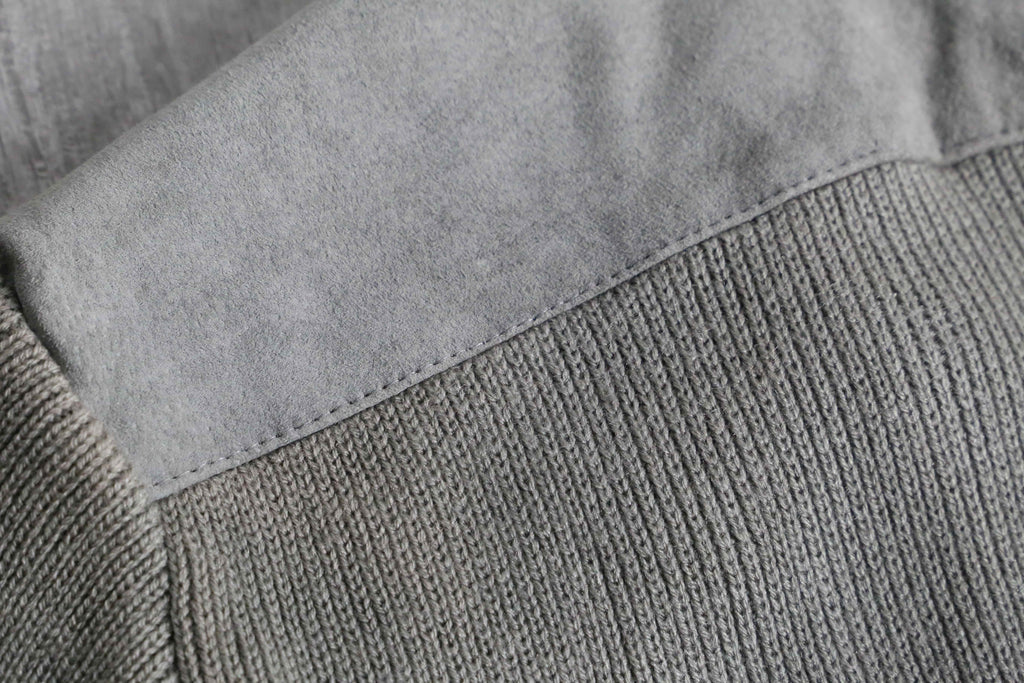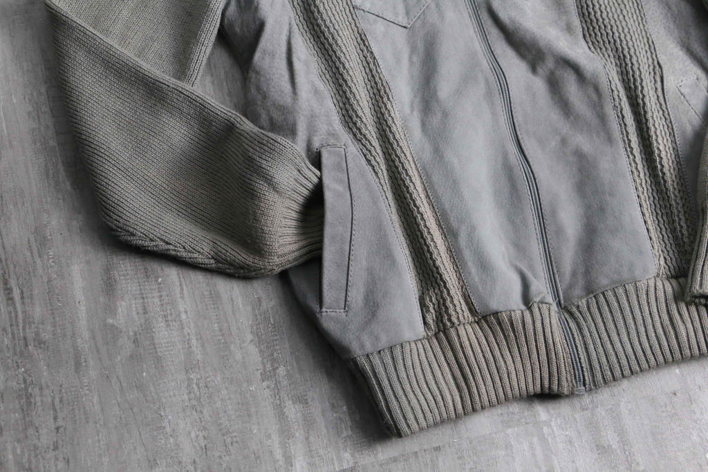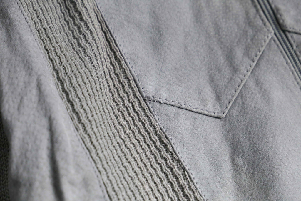 スウェードとニットの切り替えが印象的なジップアップジャケット。フロントとヨークにはレザー(スウェード)、袖から脇にかけては太めのリブニットをあしらい、異素材が静かに調和する佇まい。トーンを抑えたグレーカラーが、どこか陰影のある雰囲気をつくります。