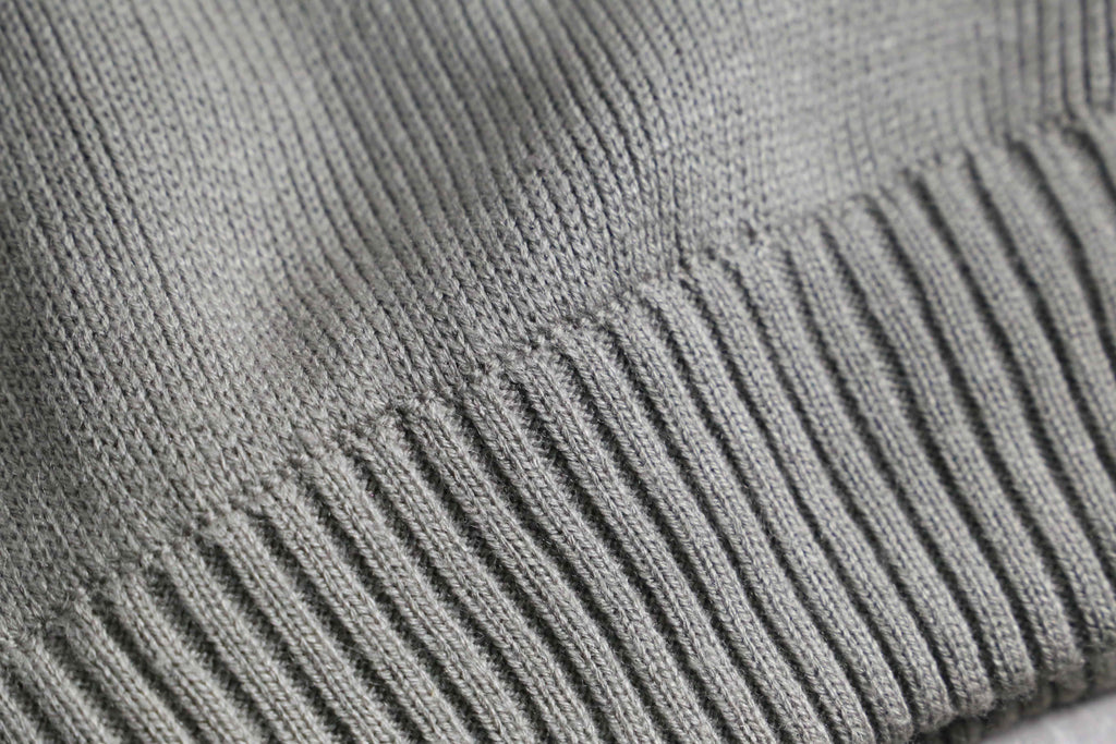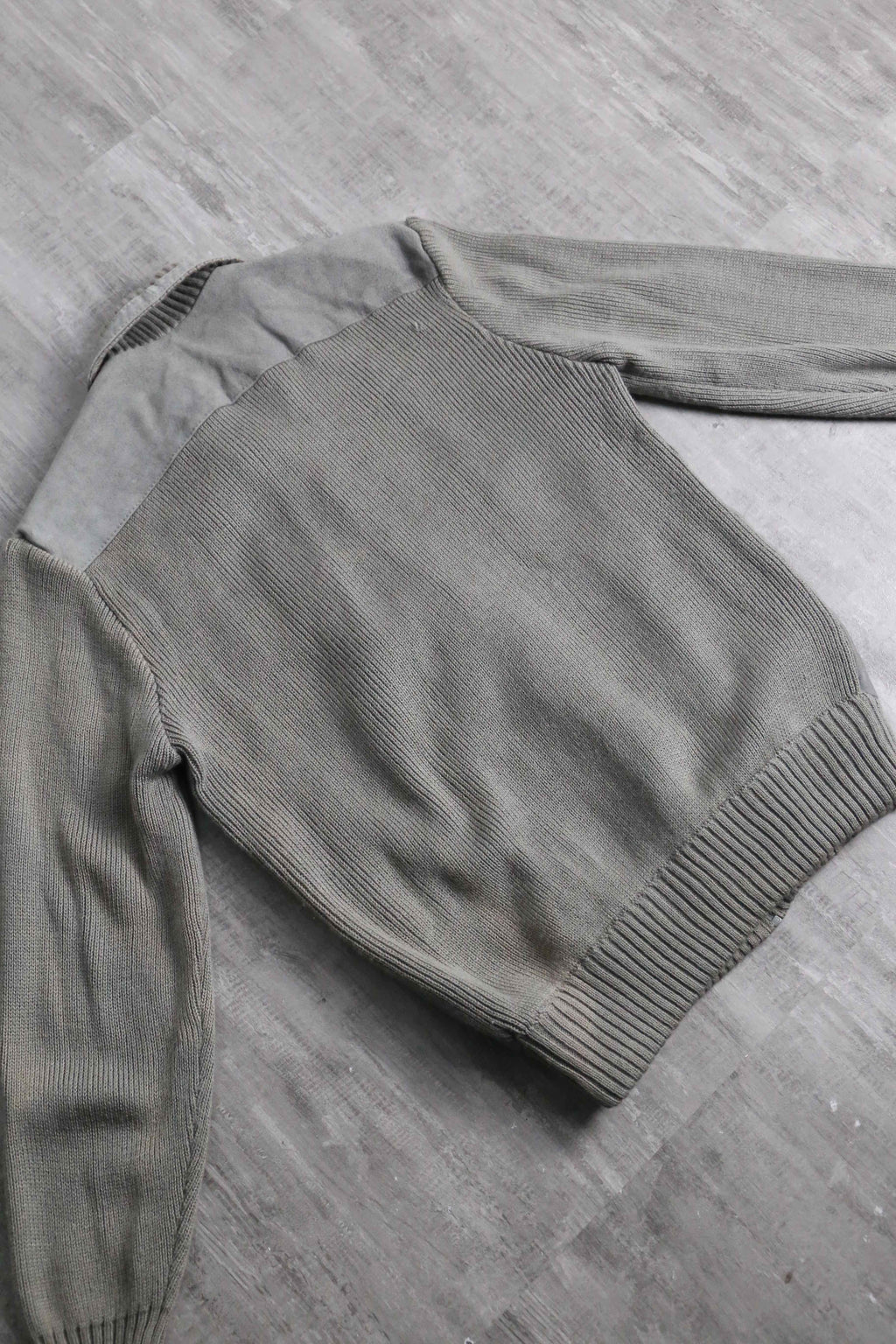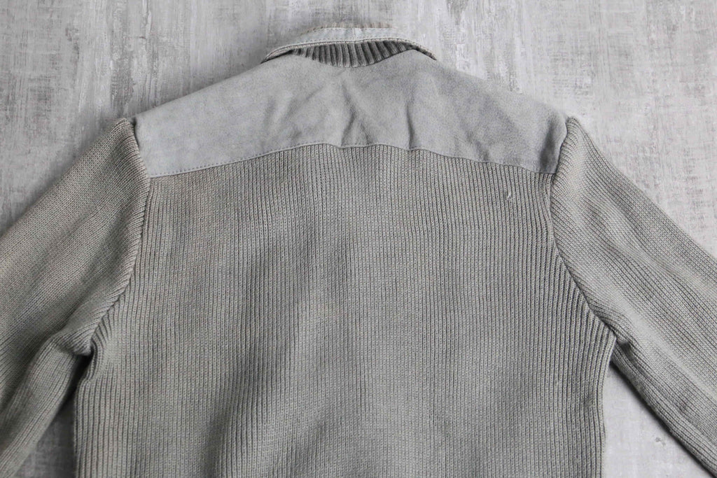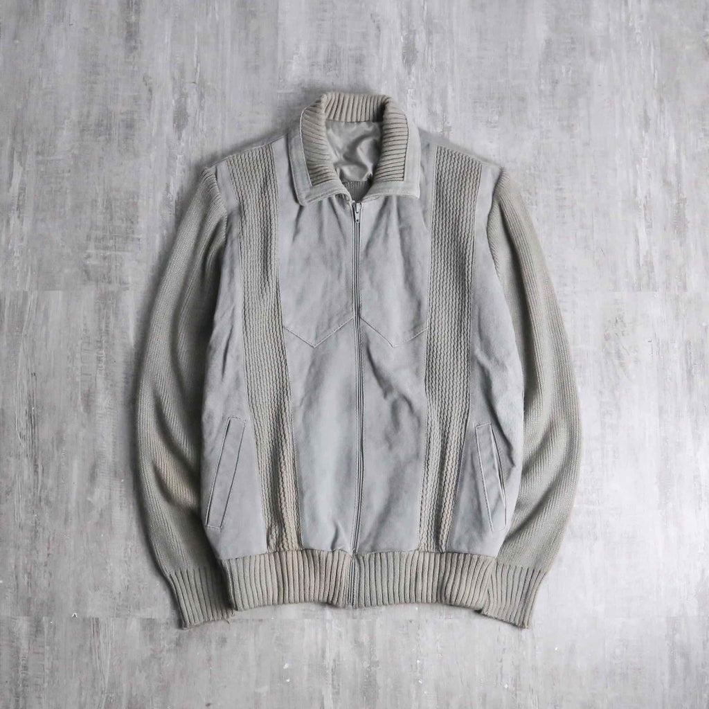 スウェードとニットの切り替えが印象的なジップアップジャケット。フロントとヨークにはレザー(スウェード)、袖から脇にかけては太めのリブニットをあしらい、異素材が静かに調和する佇まい。トーンを抑えたグレーカラーが、どこか陰影のある雰囲気をつくります。