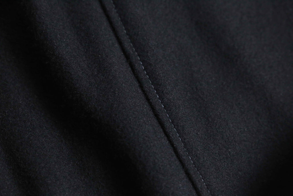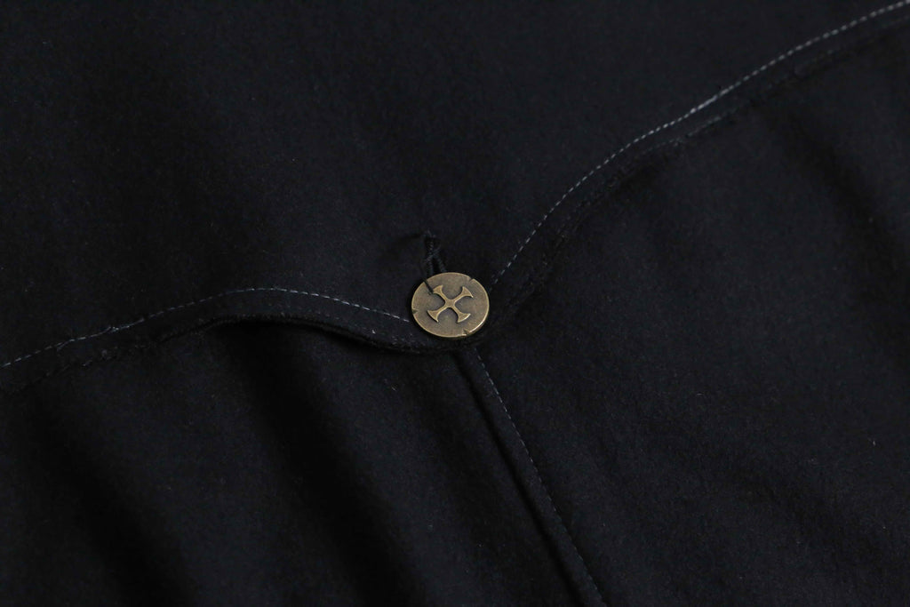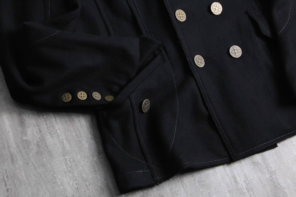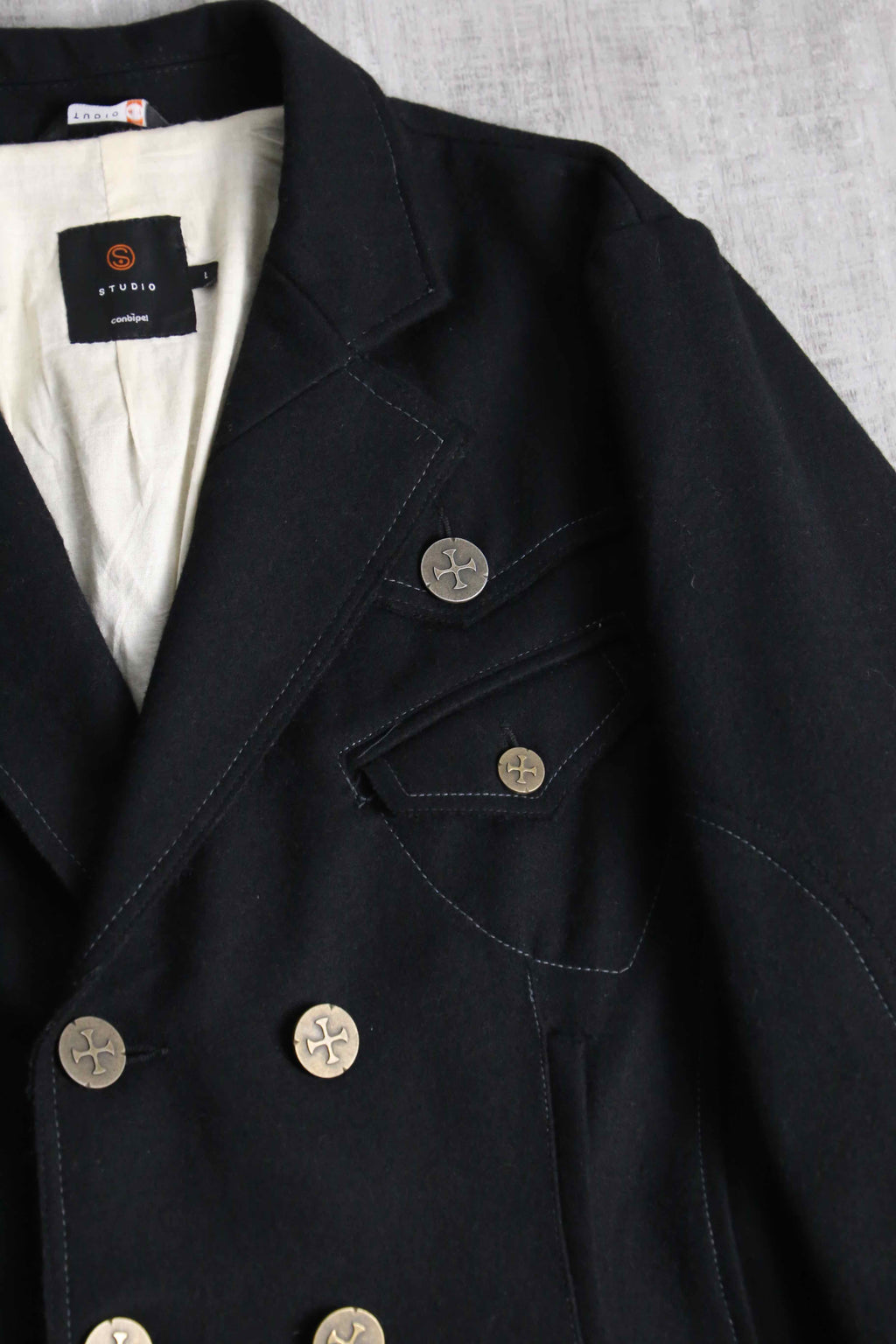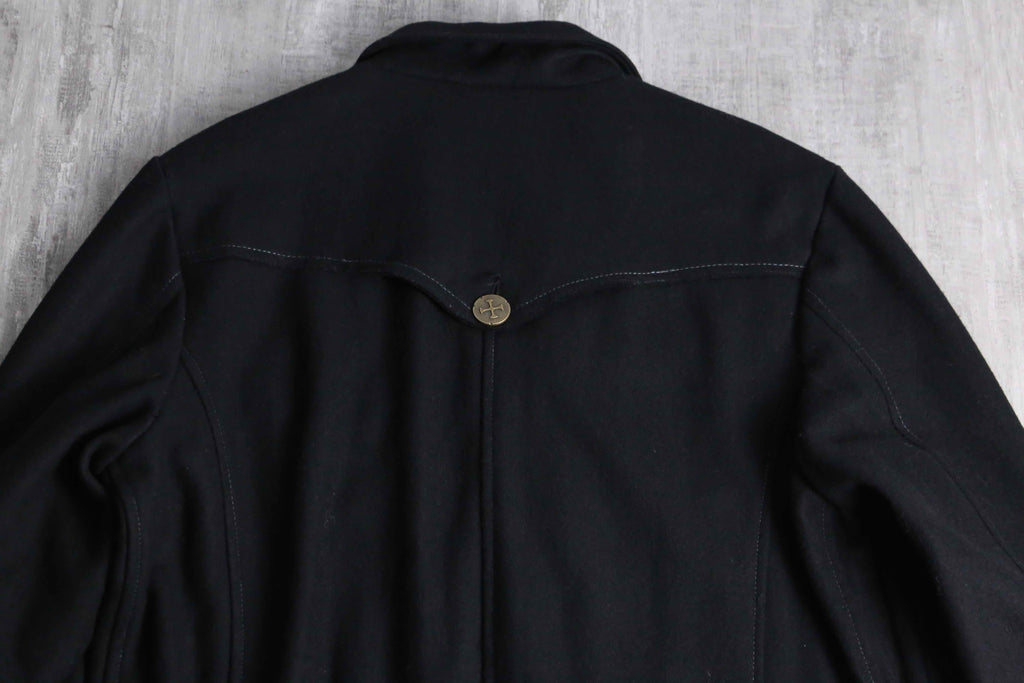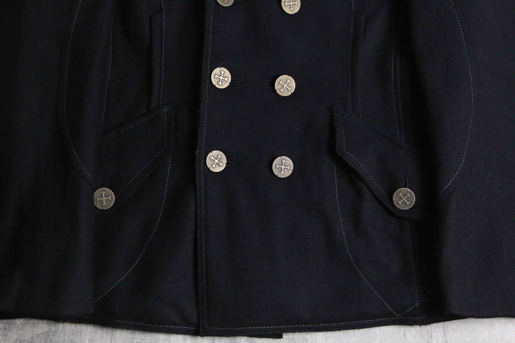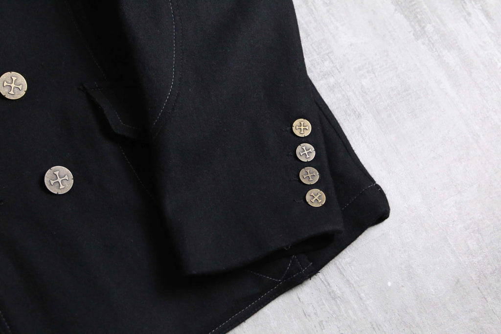 クロスモチーフのメタルボタンや広めに取られたラペル、立体的なポケットワークなど、どこかミリタリーオフィサーの正装を思わせる構築的なディテールが印象的です。ウールを主体にした生地は、程よい厚みと滑らかな質感を併せ持ち、フォルムを美しく保ちながらも日常的に着やすいバランス。縫製も堅実で、どの角度から見ても誠実なつくりが際立ちます。