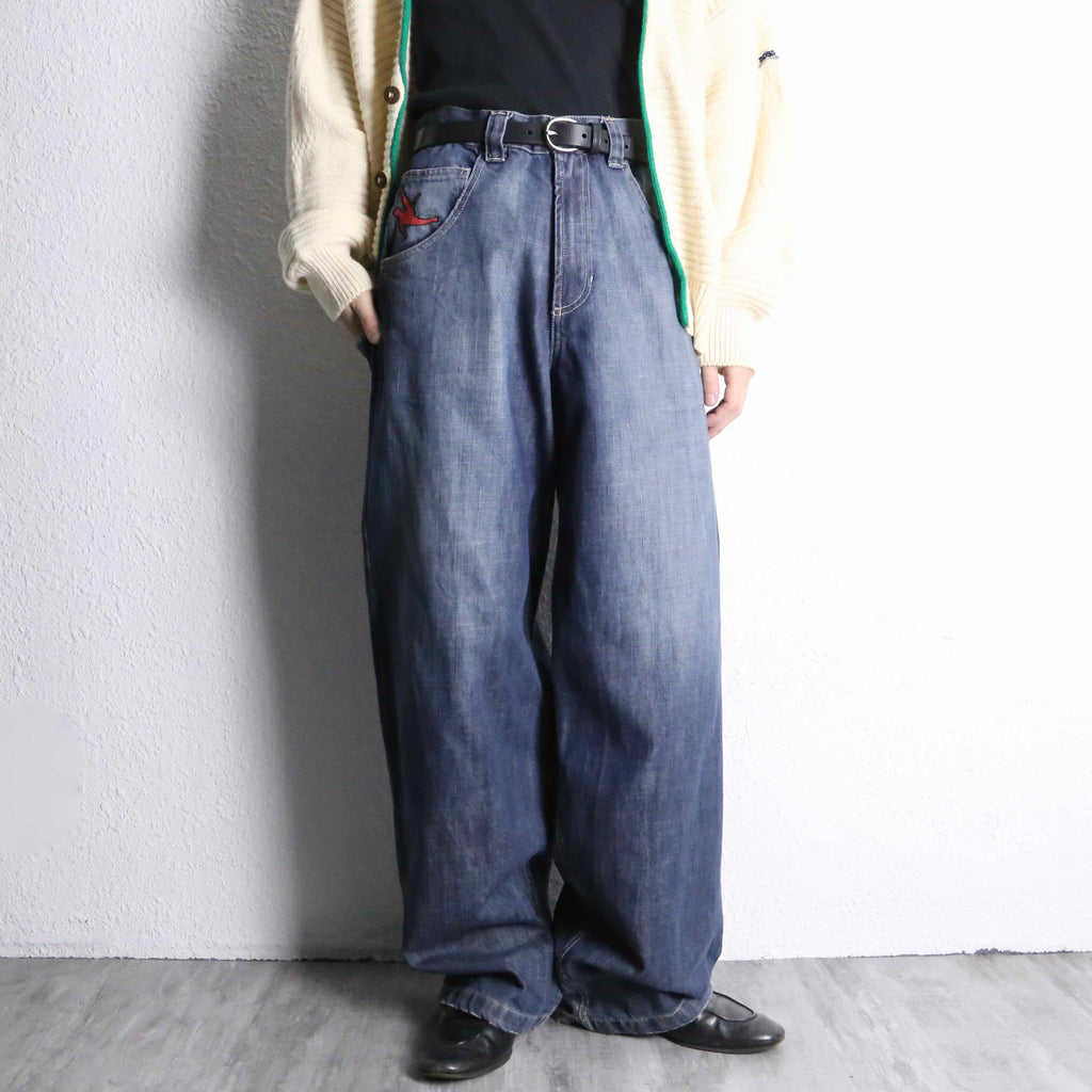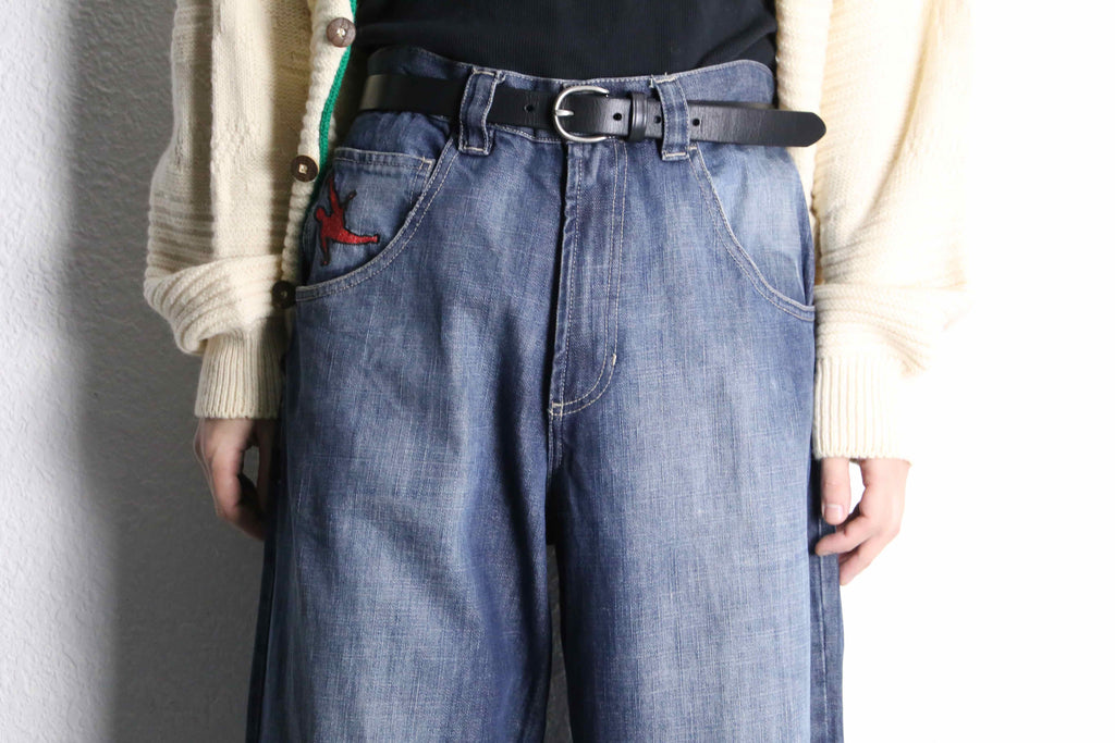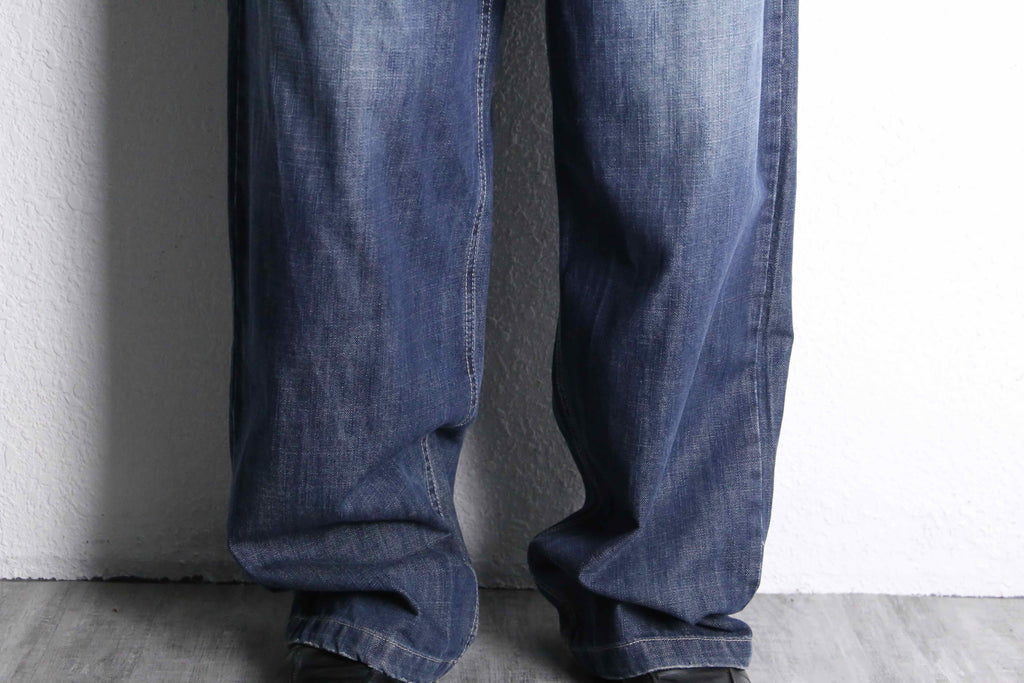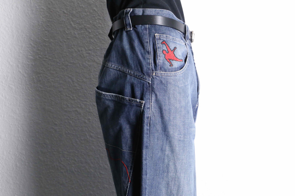 ヒップまわりには立体的な切り替えを施し、バックポケットには波打つようなレッドステッチとグラフィティ刺繍を配置。主張しすぎないアクセントが、ストリートの空気を纏いながらも大人の渋みを感じさせます。股上を深く取り、ワタリにゆとりを持たせたシルエットは、ルーズでありながらも美しい落ち感を演出。履き込むほどに馴染むコットン100%の生地は、時間とともに味わいを増し、自分だけの一本へと育っていきます。