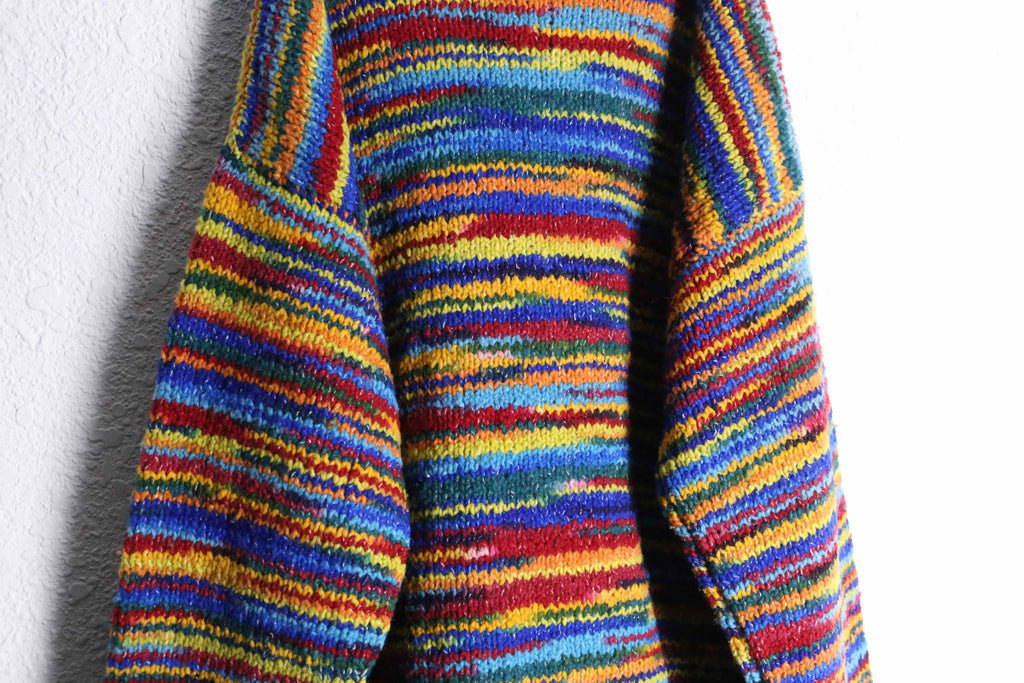 鮮やかな色がところどころで混じり合い、深い影をつくりながら全体を包み込むようなバランスで仕上げられています。派手というよりも、時間の中で落ち着いた存在感を帯びた色味。光の当たり方で印象が変わるのも面白い。襟や裾にはループ編みを施し、素朴な表情の中にさりげない立体感を加えています。肩を落としたゆるいシルエットは、体の動きに合わせて自然に形を変え、着る人の空気をそのまま映すよう。