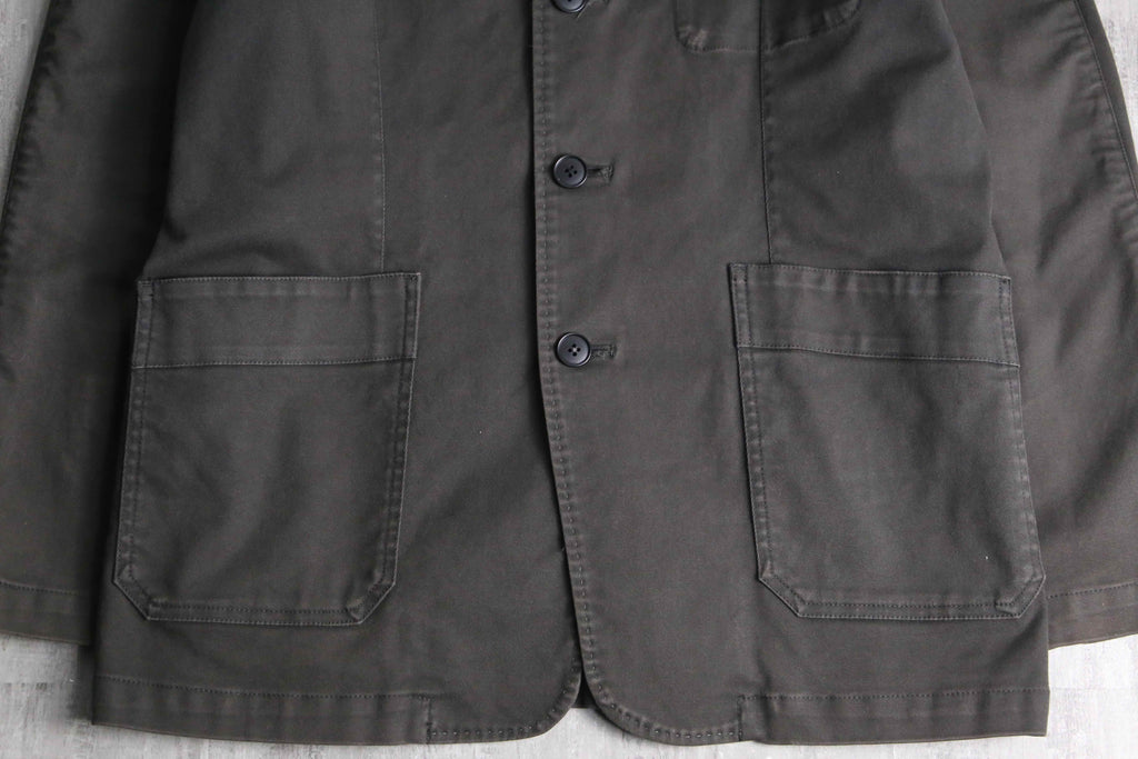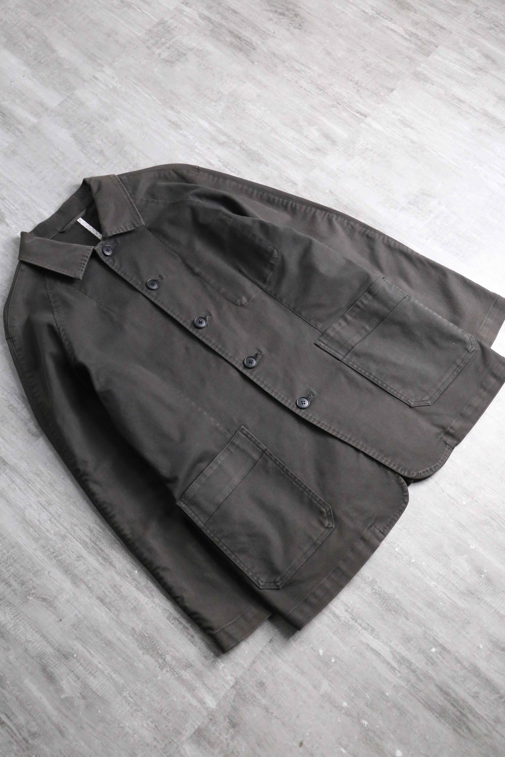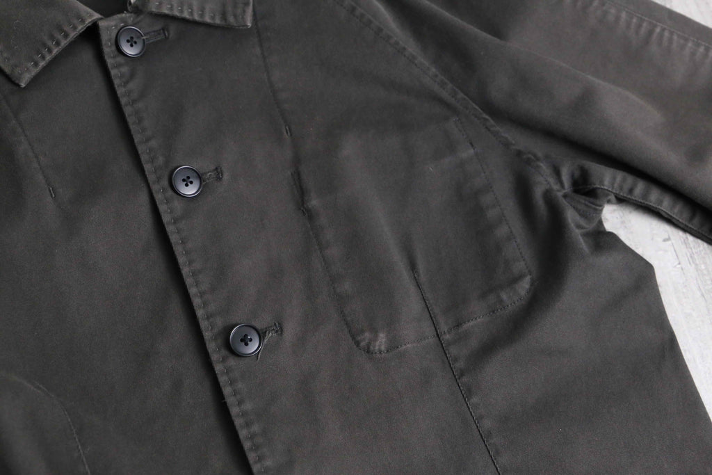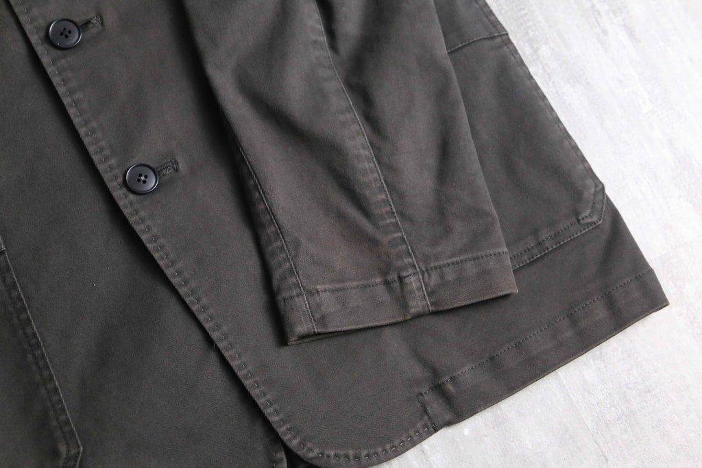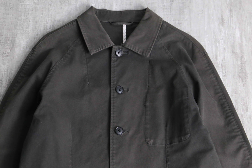 ボタン留めのフロント、襟付きのデザイン、そして2つの大きなパッチポケットを備えたユーティリティジャケット。ワークウェアをルーツに作られているだけあって、作業着に由来する長めの着丈と、肩部分に縫い目がなく腕が動きやすいラグランスリーブが特徴。締め付けがなく、ゆったりとした着心地に、厚手のインナーを着込んでも肩周りがもたつきにくいかと。