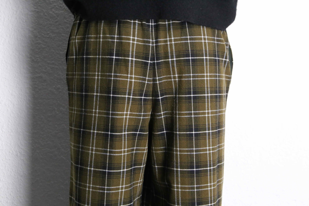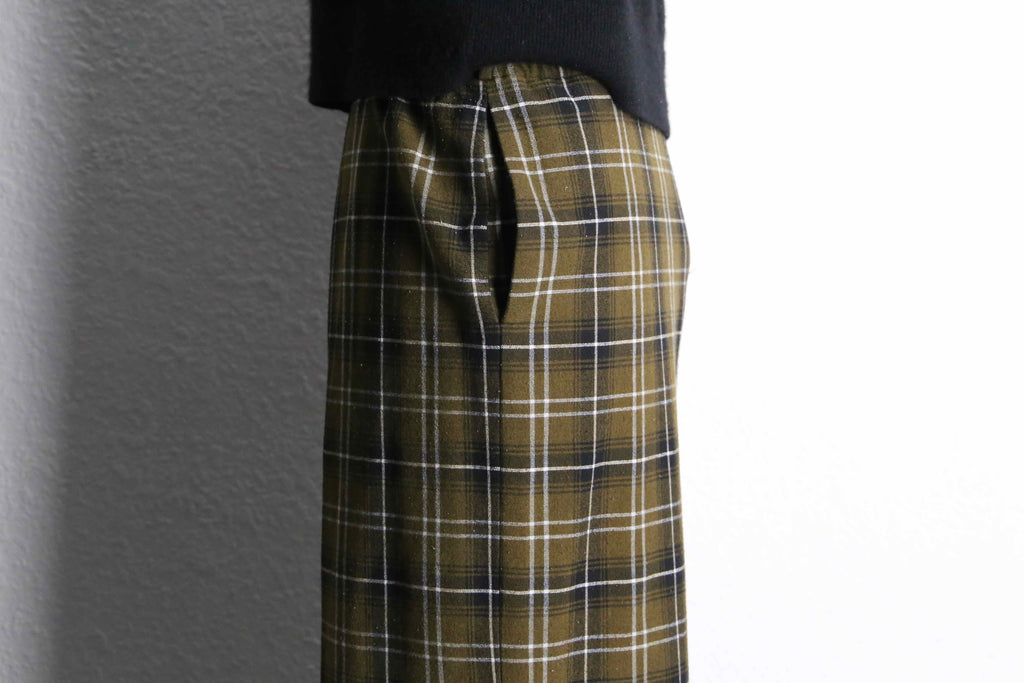 カーキ寄りのブラウンに控えめなチェックが入ったイージーパンツ。