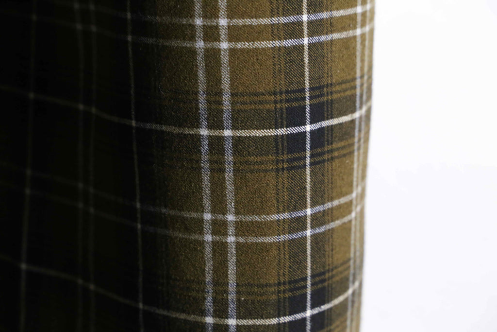 脚のラインはストンと落ち、生地のハリがシルエットをきれいに見せてくれる仕上がり。落ち着いた色味のチェックは合わせるトップスを選ばず、ステンカラーコートやナイロンブルゾンを羽織るだけで全体がまとまります。