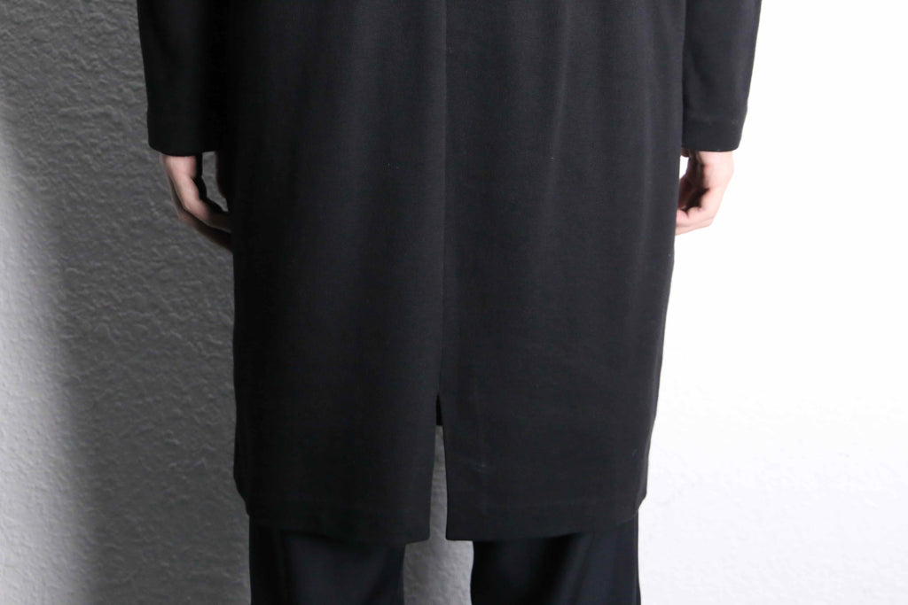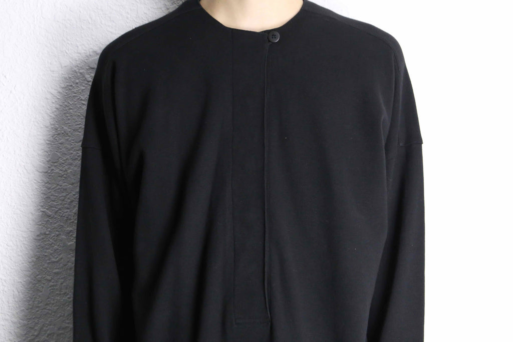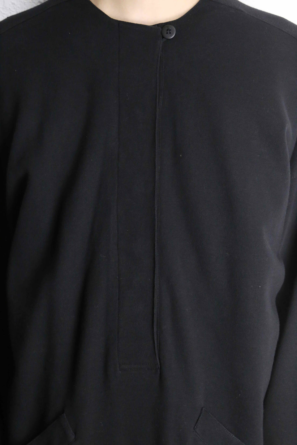 コットン100%の中厚手生地を使用したロング丈のプルオーバートップス。比翼仕立てのフロントは内側にボタンが並び、見た目のシンプルさを保ちながらもきれいに閉まるつくりです。風を通しにくく、秋口〜春先まで長く使える素材感です。