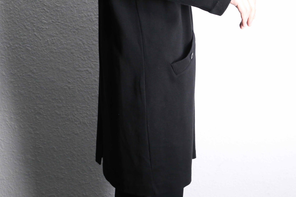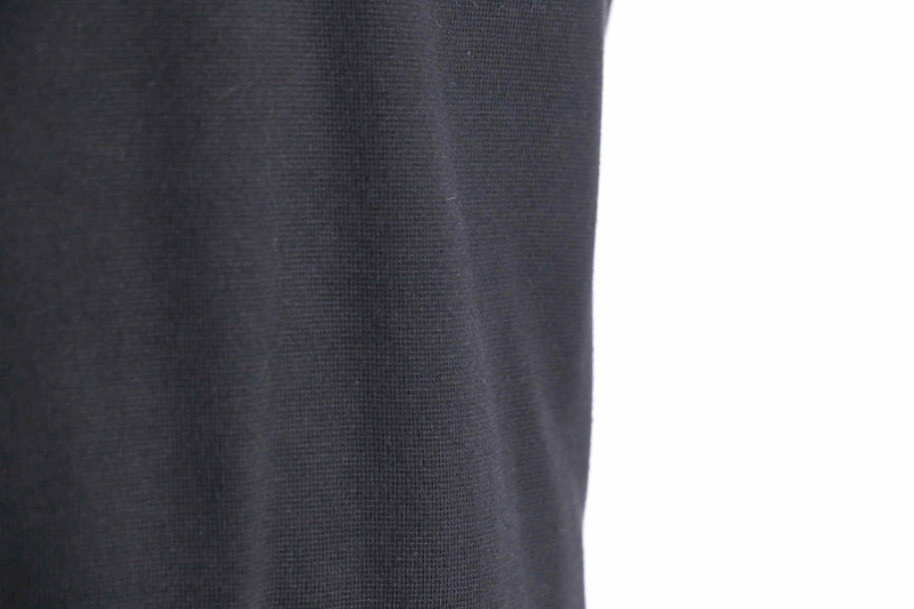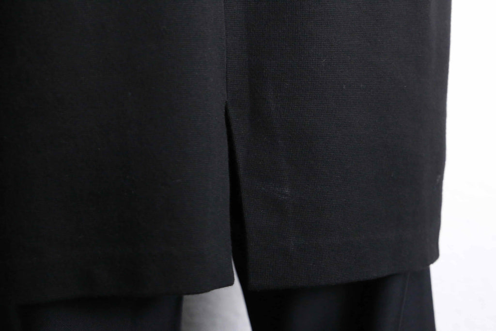 生地はスウェットに近いほどよい厚みで、ストンと落ちるロングシルエットが特徴。両サイドのフラップポケットにはボタンが添えられており、控えめながら全体のバランスを整えるアクセントになっています。