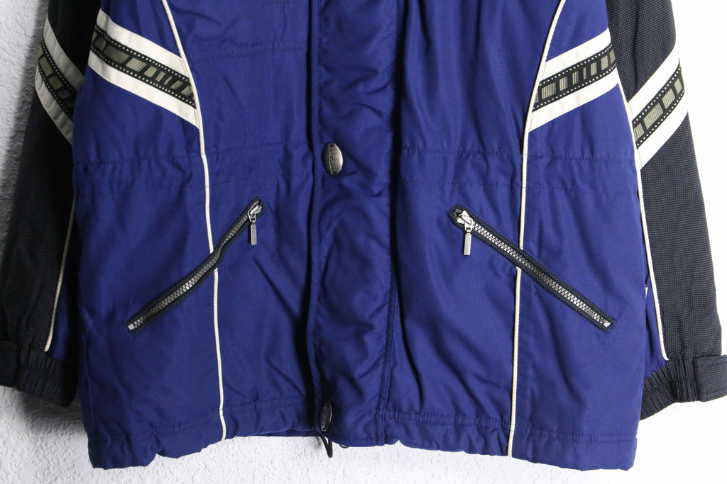 深いブルーとチャコールの切り替え、そこに走るホワイトのパイピング。スポーツウェア由来の機能美が、いま見るとどこか無骨で、静かな迫力を帯びています。