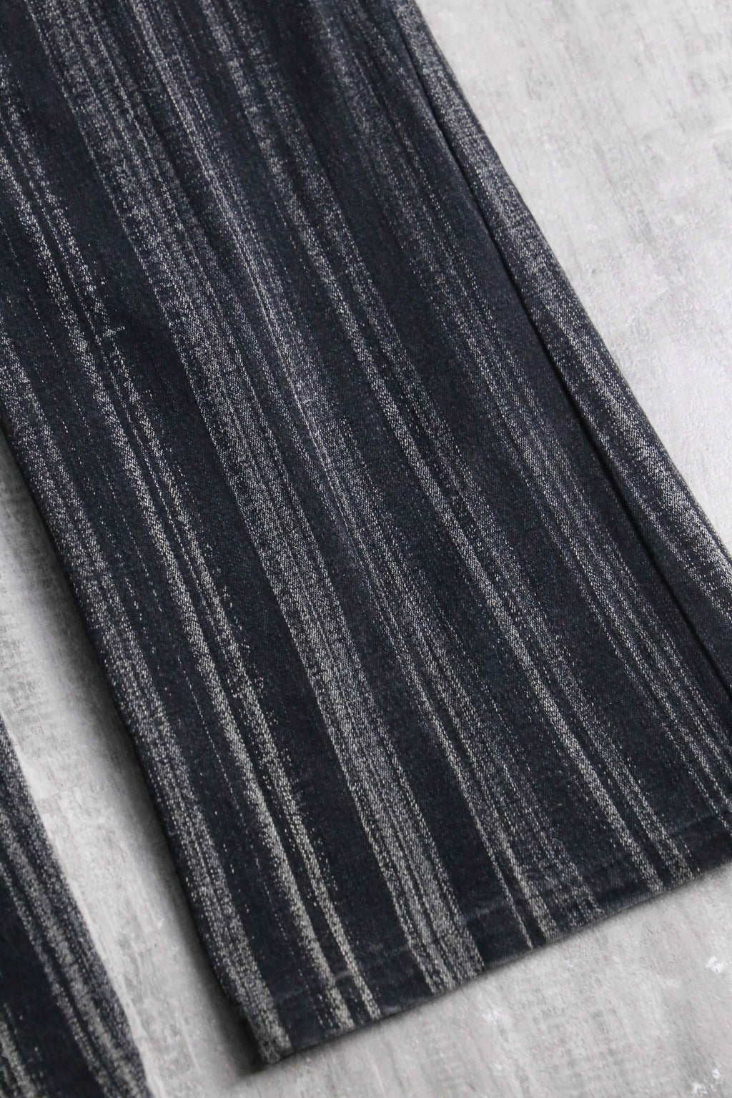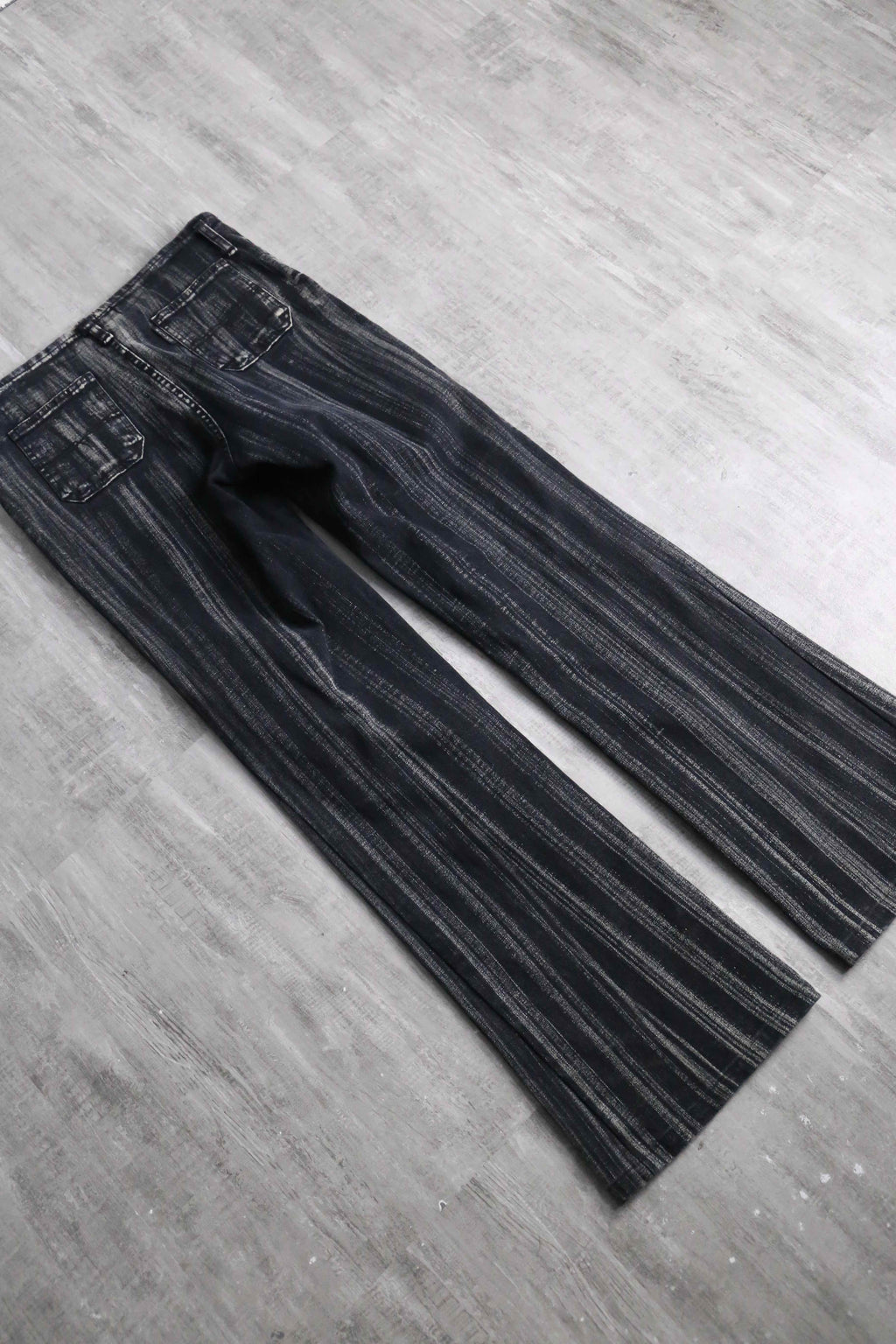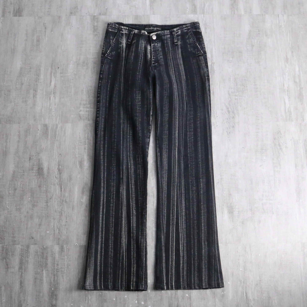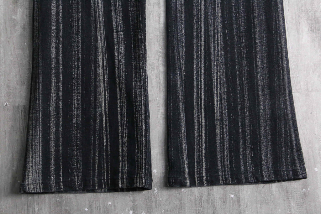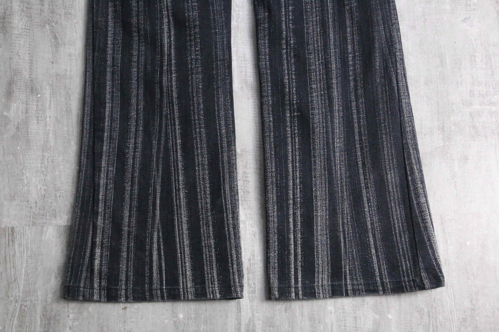全体に縦へ走るフェードが、そのままストライプのように残ったフレアデニム。意図された柄というより、穿き込まれる中で削れた痕跡が線として浮かび上がった、そんな表情です。
