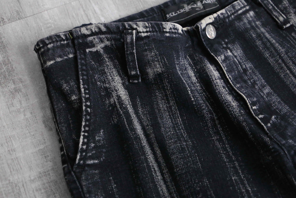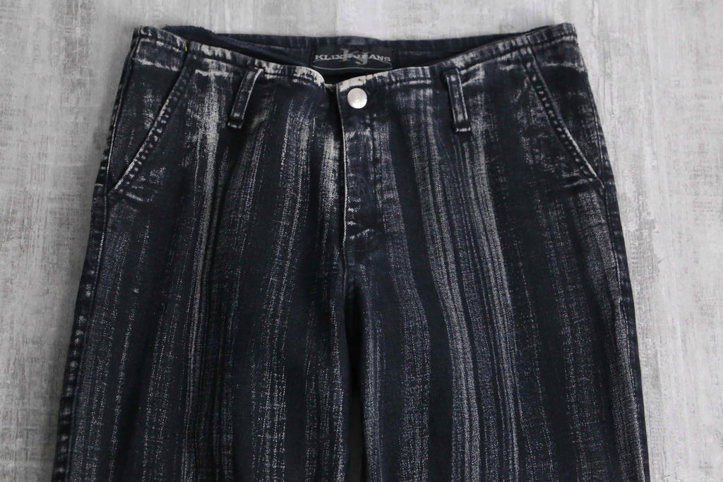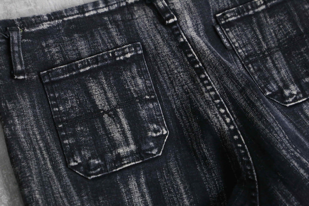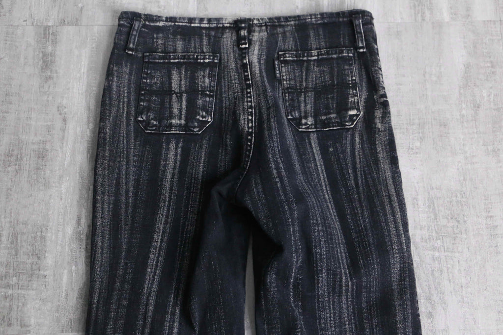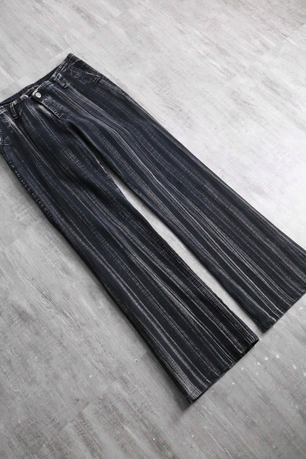 全体に縦へ走るフェードが、そのままストライプのように残ったフレアデニム。意図された柄というより、穿き込まれる中で削れた痕跡が線として浮かび上がった、そんな表情です。